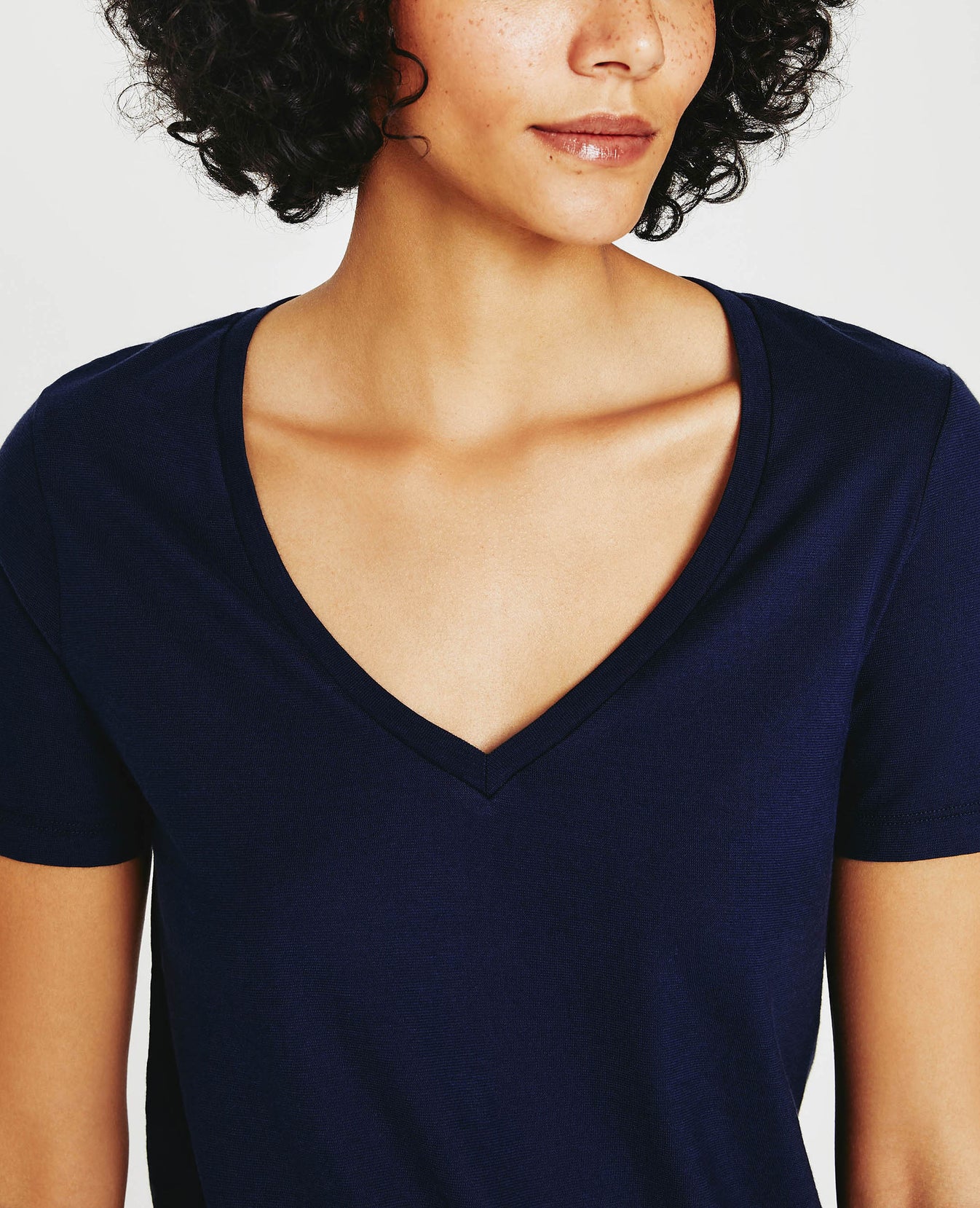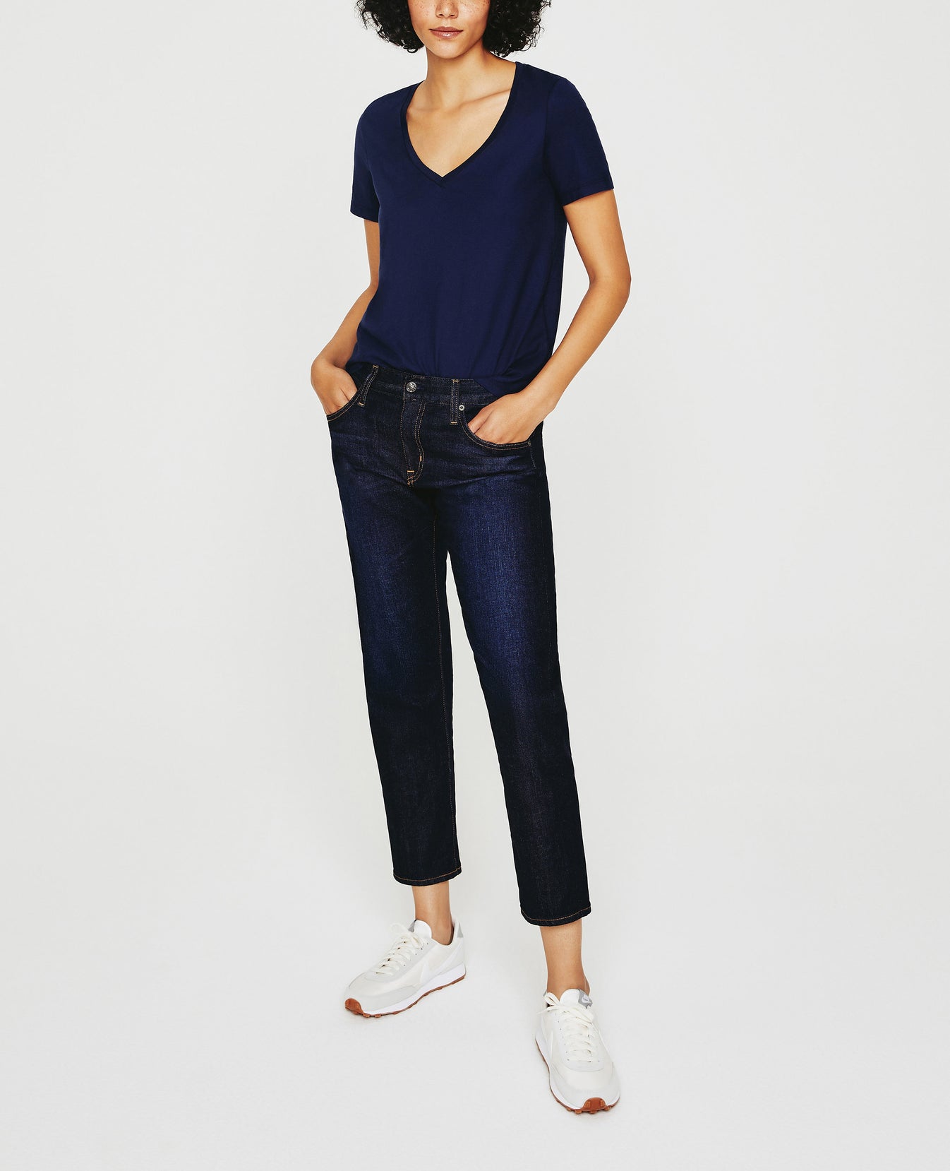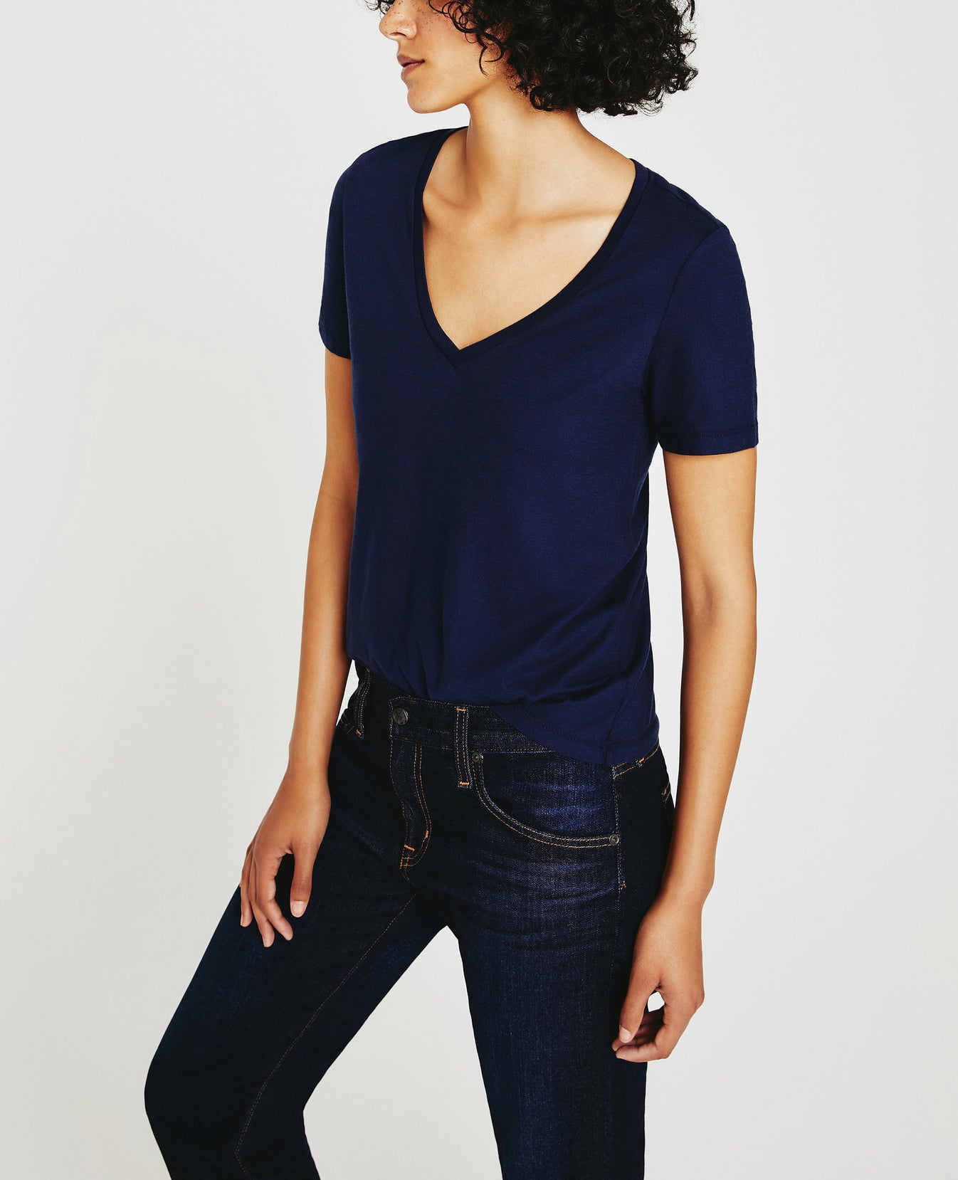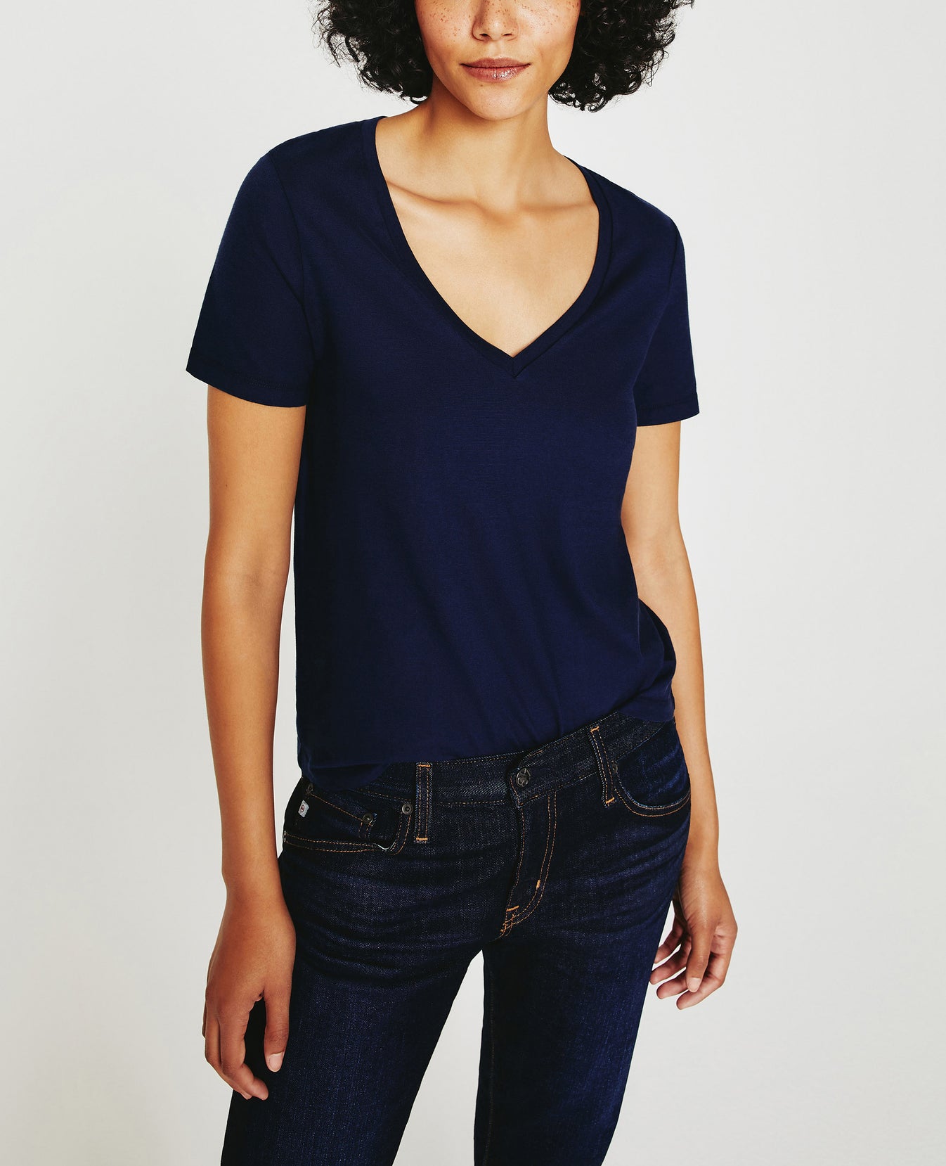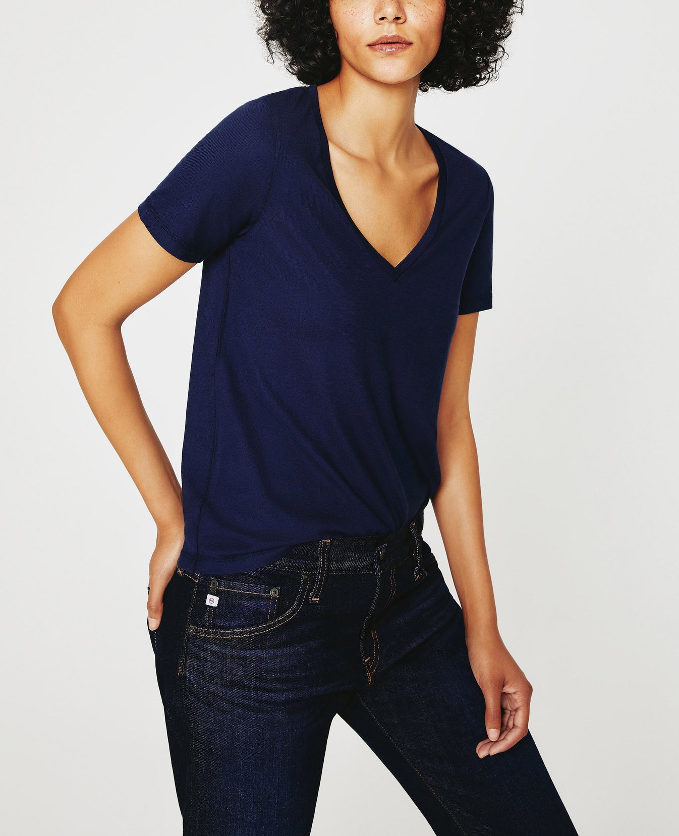 The Jagger V-Neck tee in deep navy is a classic, added to our Basic Essentials collection to offer effortless styling options for your wardrobe. The thinner rib neckband gives imparts a modern feel to a classic neckline. Our Jersey Knit offers a luxurious comfort that is unrivaled—knitted with both S-twist and Z-twist yarn to sustain longevity and stability, preventing unnecessary twisting and torquing. During the production process, the S-twist yarn is spun counter-clockwise creating a right-handed twill. The Z-twist yarn works in opposition, spinning clockwise for a left-handed twill. This opposition—when working together—yields a softer, more durable fabrication and gives strength to the yarn making it more difficult to pull apart. Designed in 100% Cotton.