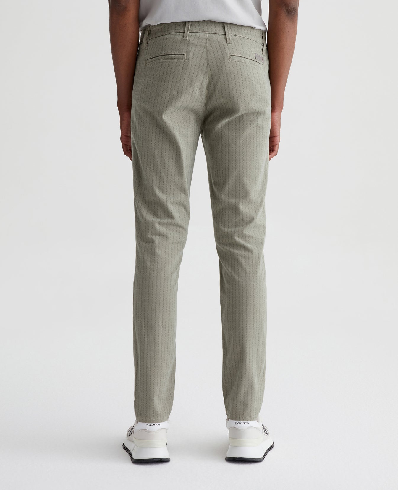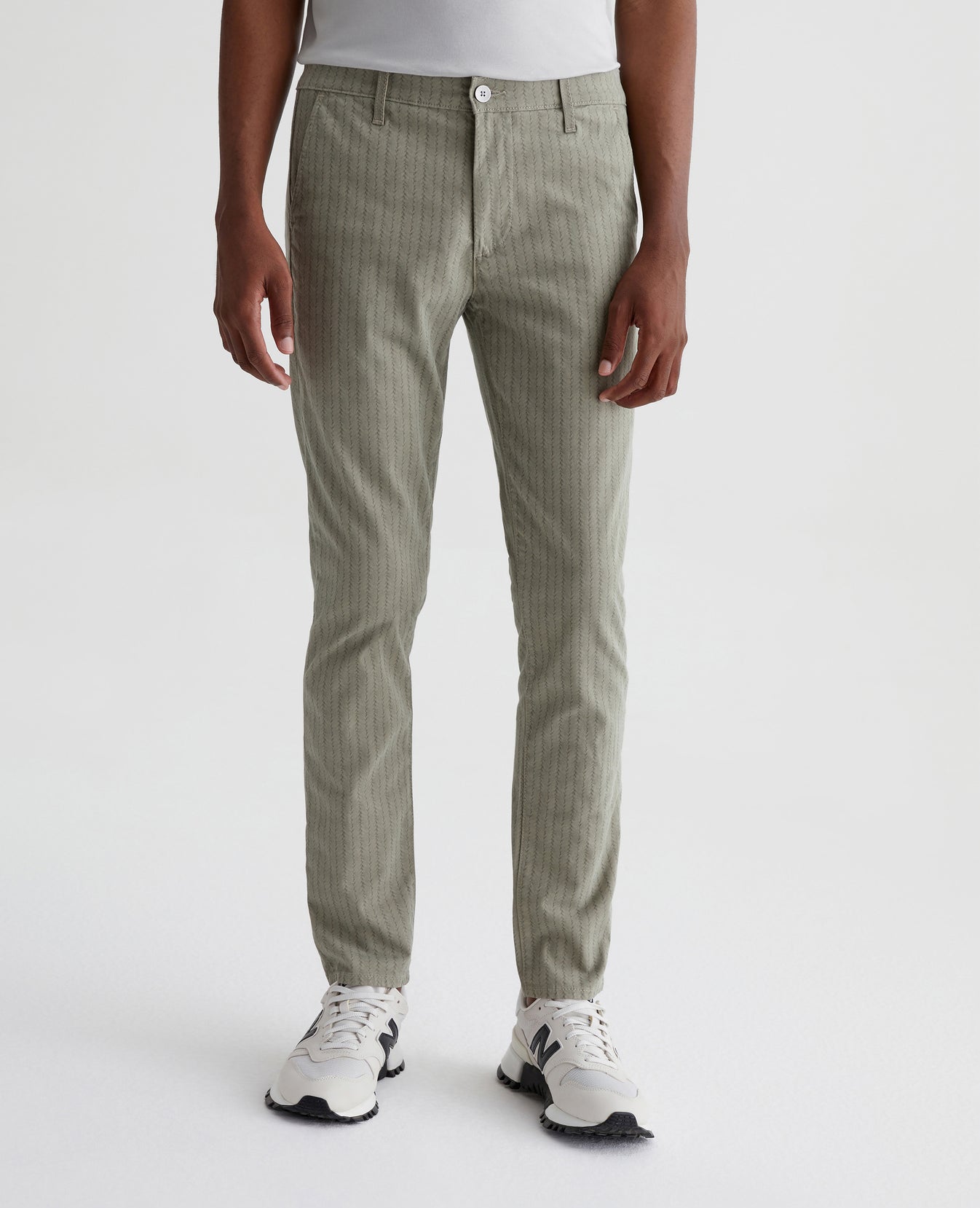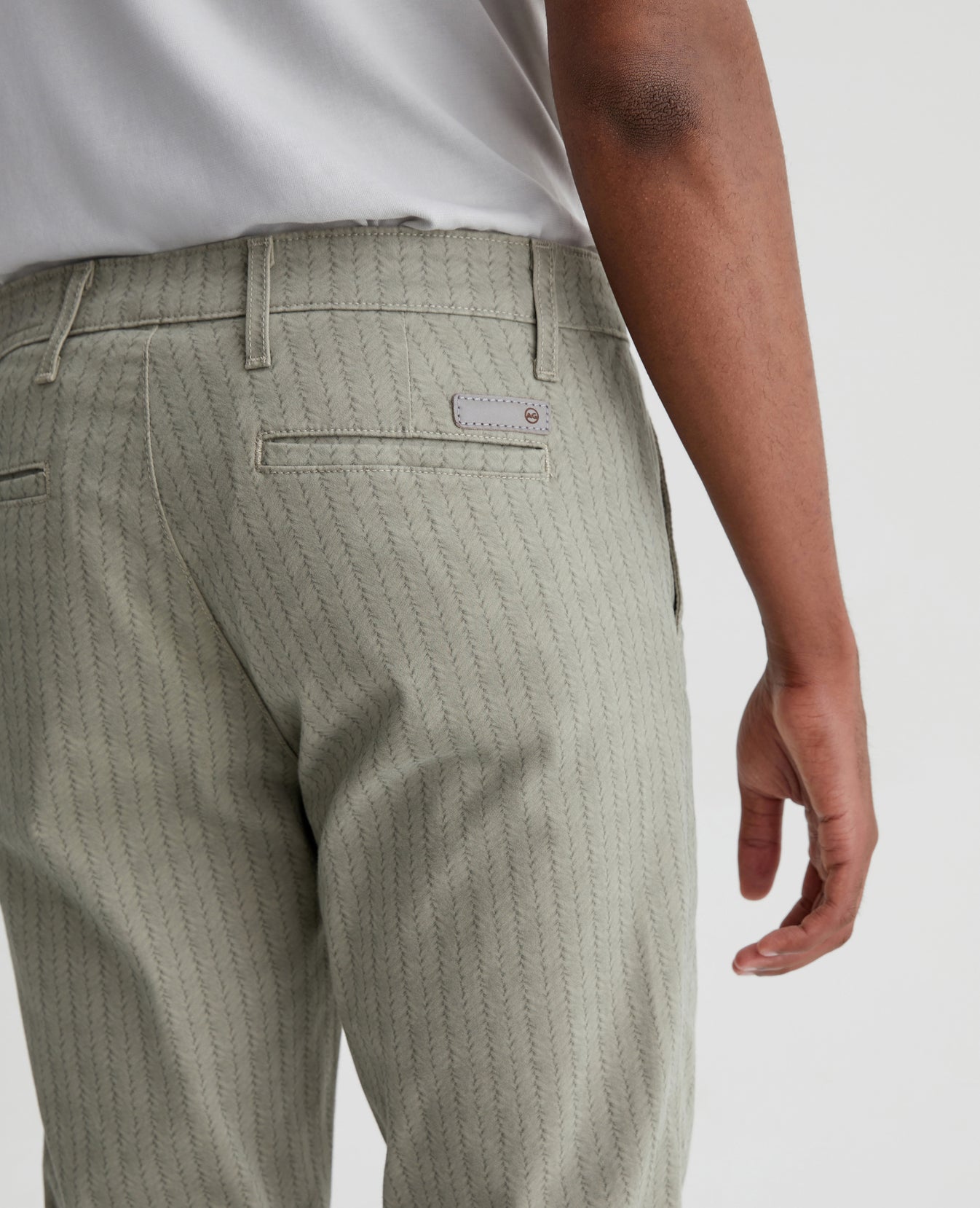 Jamison is a skinny trouser for men, updated for the season in a green braid-like print. The pair has a slim upper block and tapered leg openings. This men's slim skinny pant is designed in 7.4 oz. Sueded Stretch Blithe Sateen, a lightweight sateen fabric with comfort stretch and a soft, refined hand. Slash front pockets and button-fastened welt back pockets complete the tailored look.