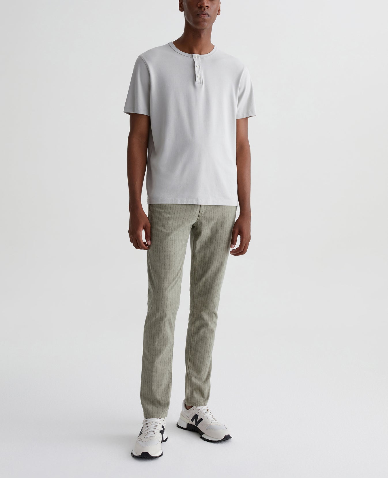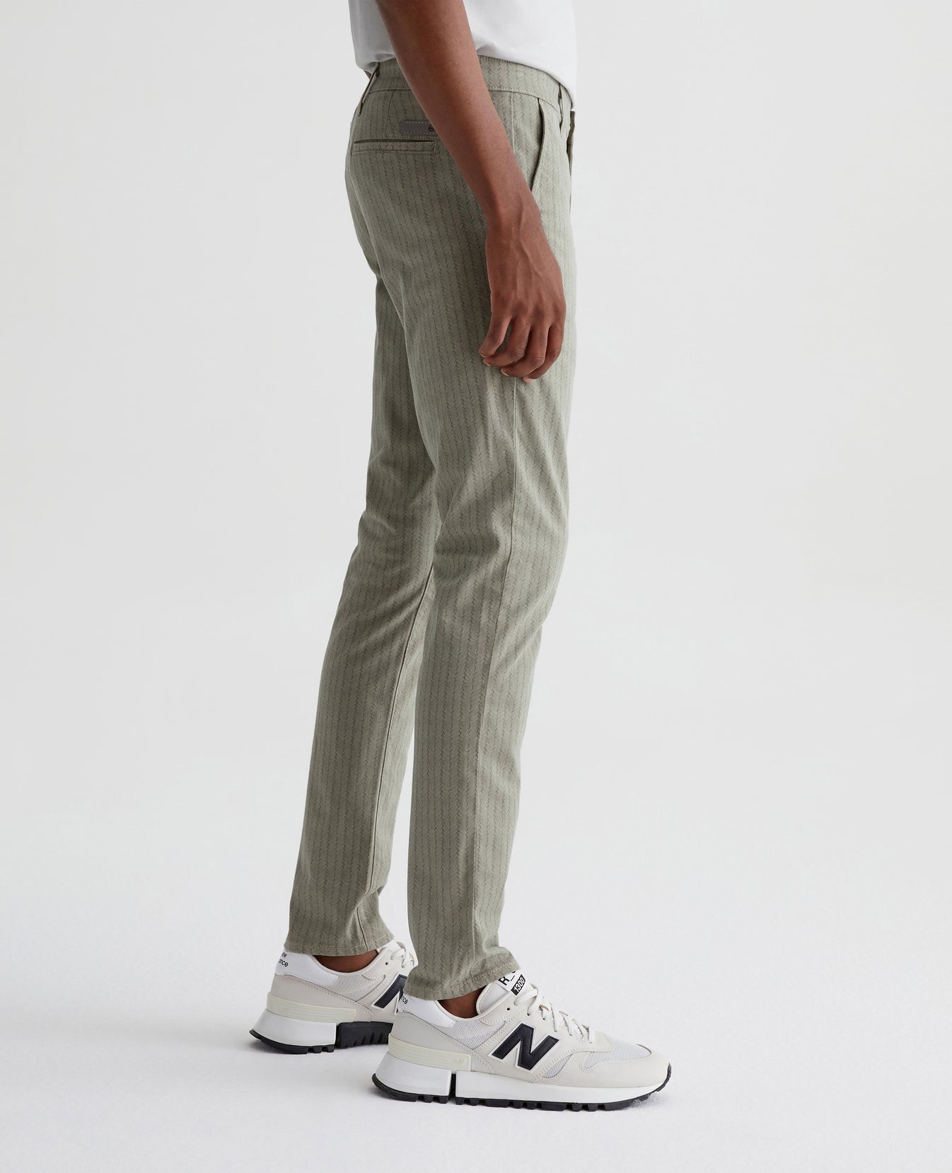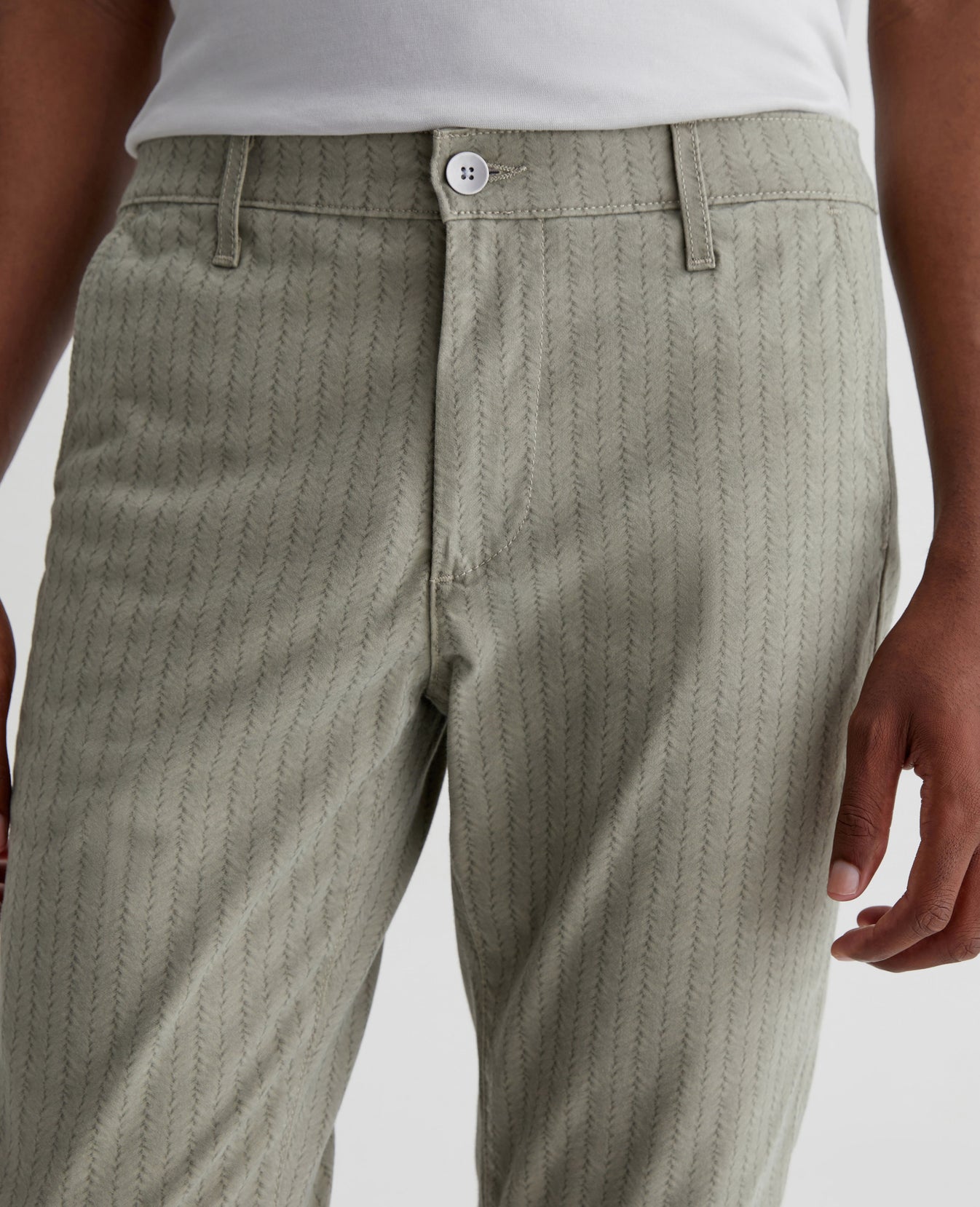 Jamison is a skinny trouser for men, updated for the season in a green braid-like print. The pair has a slim upper block and tapered leg openings. This men's slim skinny pant is designed in 7.4 oz. Sueded Stretch Blithe Sateen, a lightweight sateen fabric with comfort stretch and a soft, refined hand. Slash front pockets and button-fastened welt back pockets complete the tailored look.