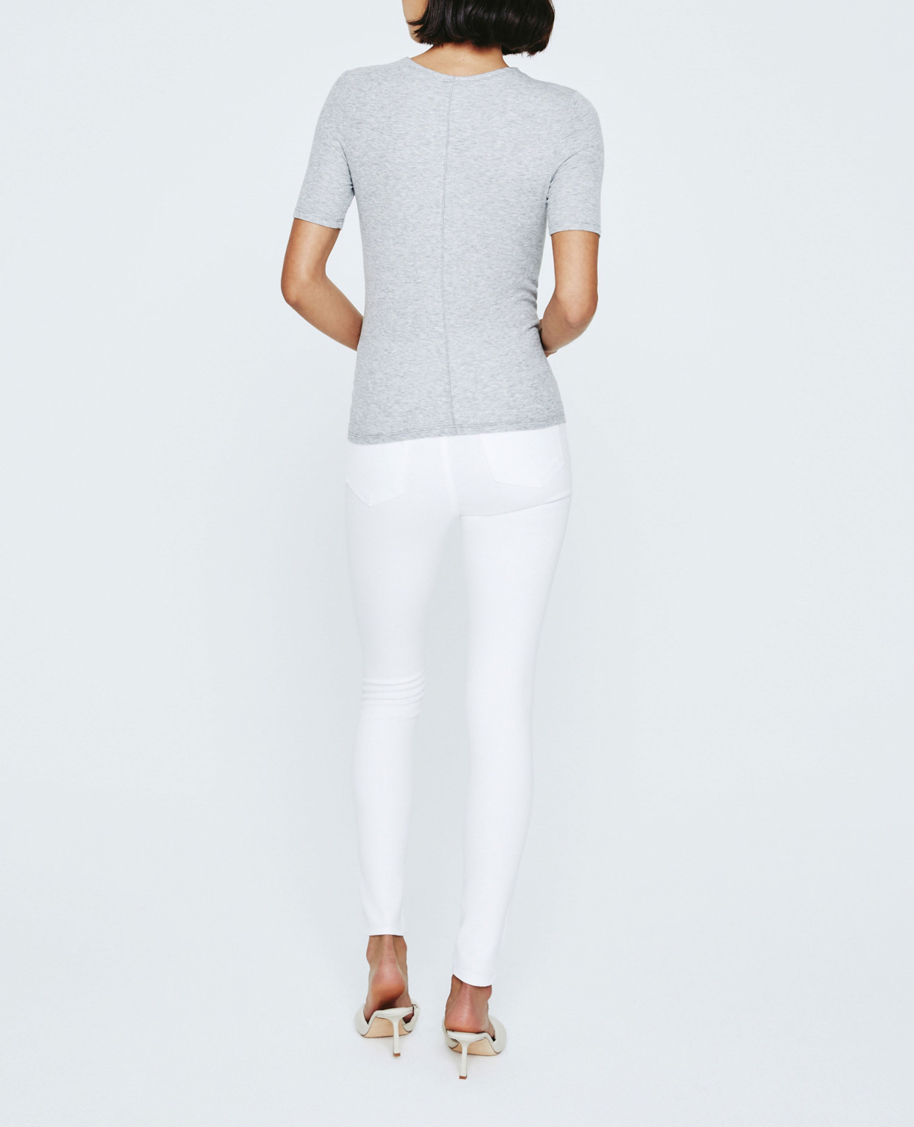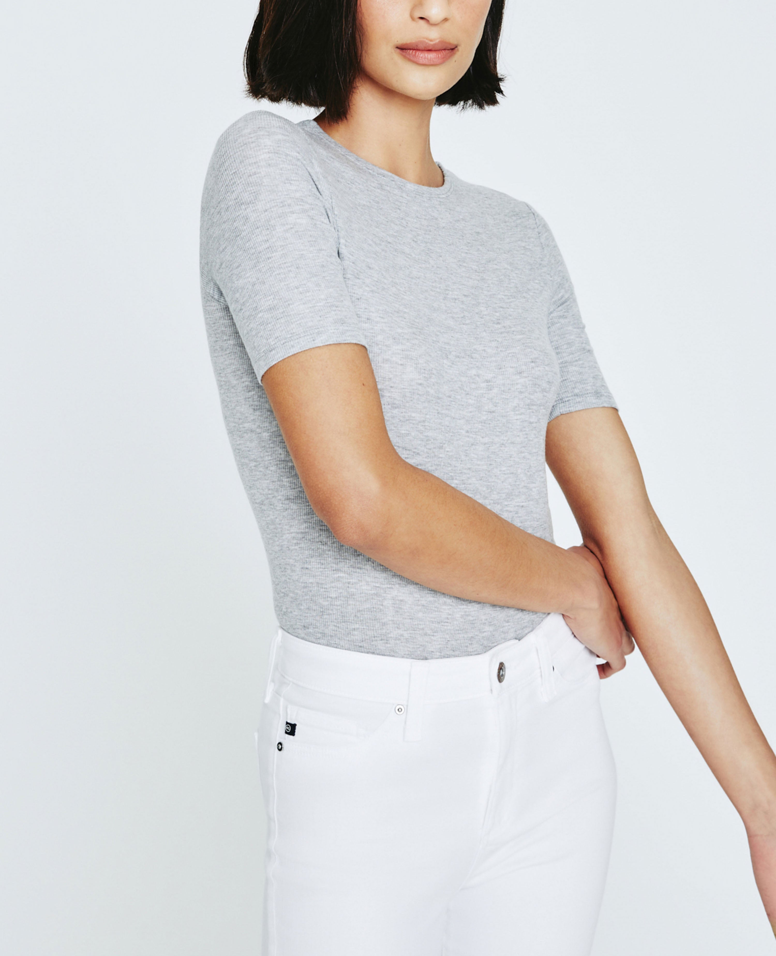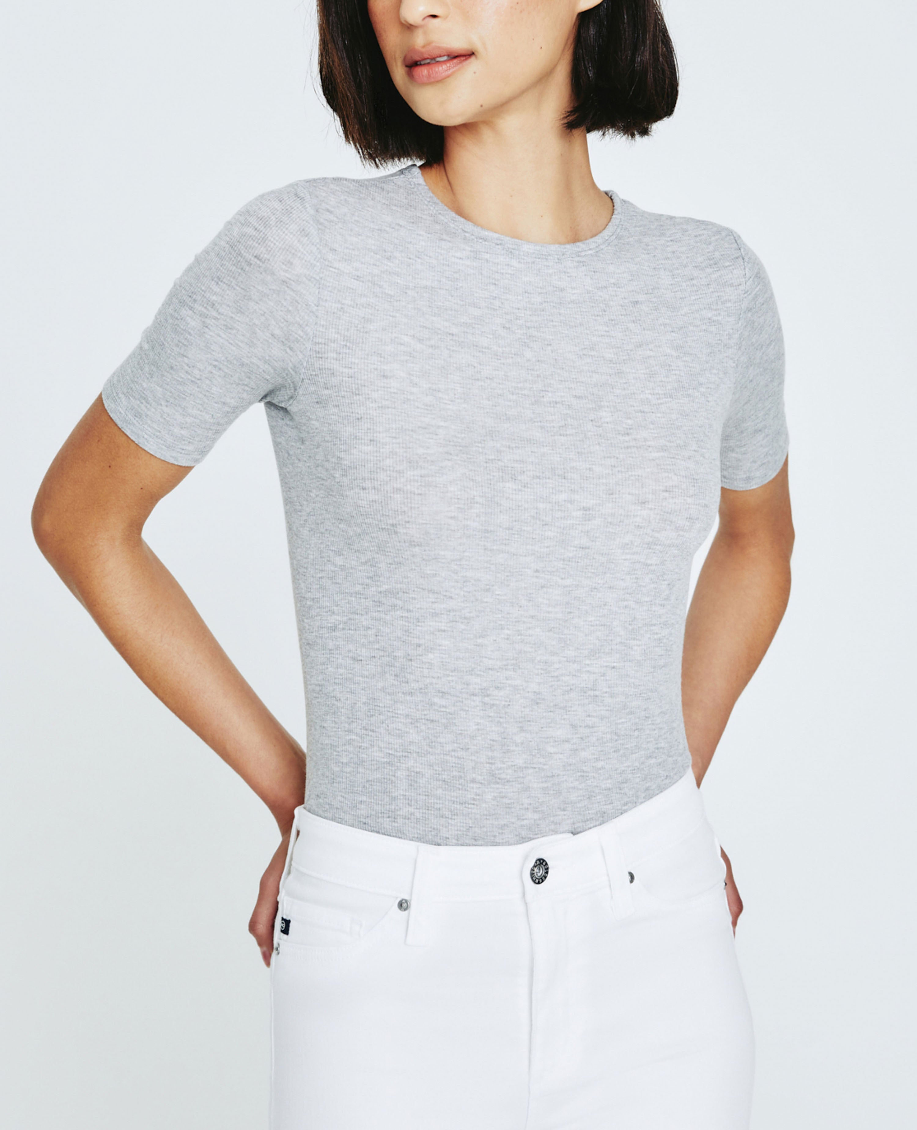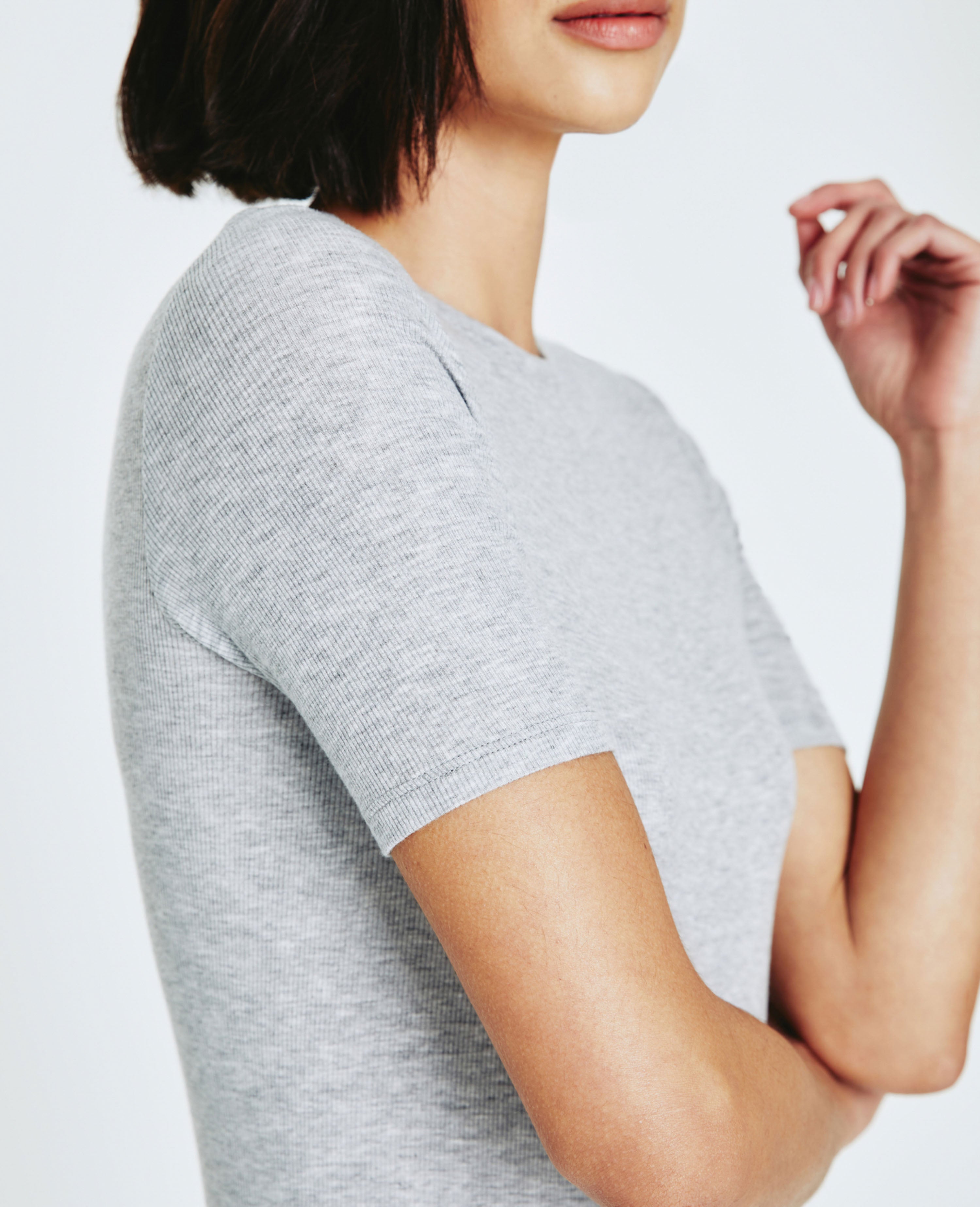 A modest piece that’s made to layer. Our Jane Short Sleeve Crew with elbow sleeves features a clean, fitted silhouette. Our in-house looms deliver the precision knitting needed to accomplish the characteristic 2 X 1 weave that lends to the fabric’s superior comfort and draping qualities. Designed in a premium heather grey spandex and 2 X 1 Lyocell Rib fabrication. Made with Eucalyptus, our lyocell is plant-based, biodegradable, and uses 20% less resources to develop.