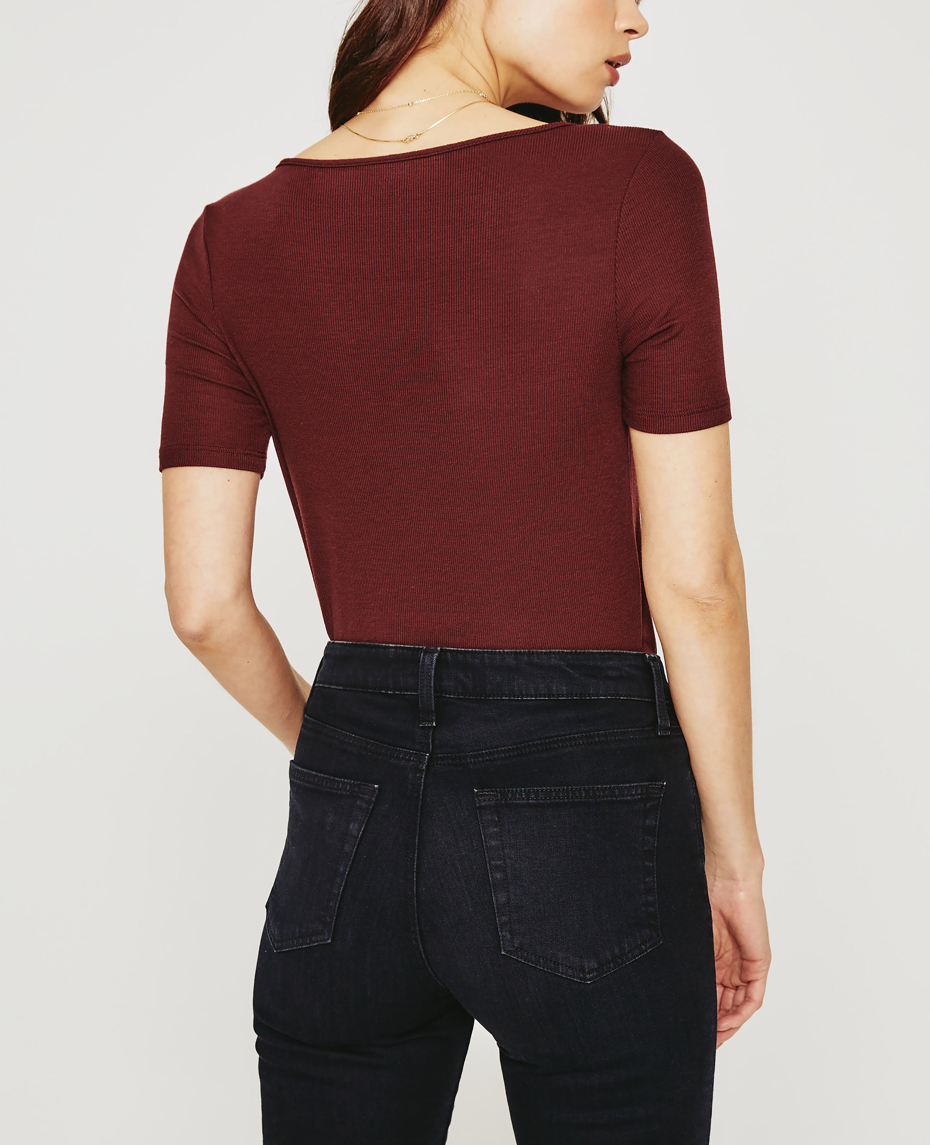 The Jaxon Scoop for women is a fitted short-sleeve tee with a scoop neckline edged by slim self-binding. Made from an eco-friendly 2x1 Lyocell Rib fabrication in a rich brown shade, it's luxuriously soft and comfortable.