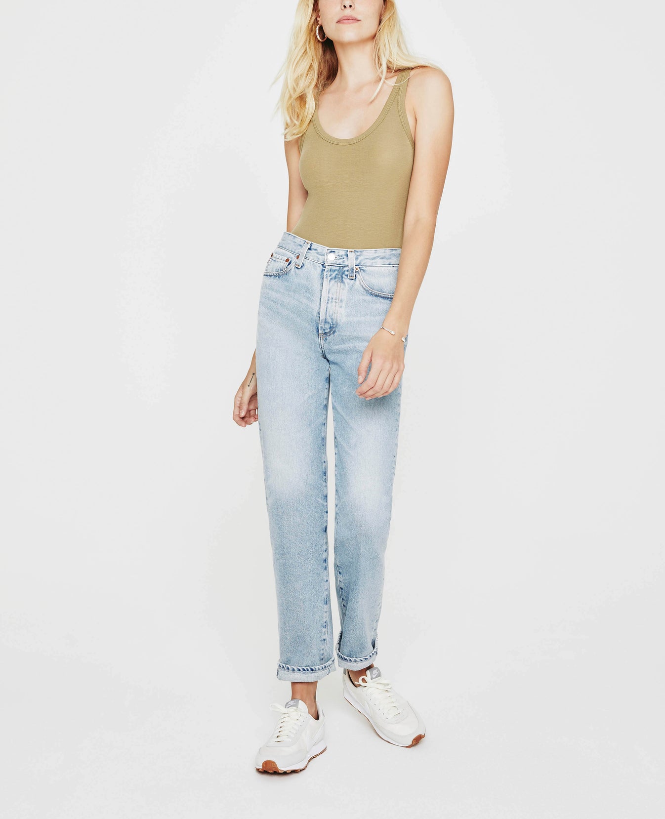 The Jaxon Tank for women features a beige hue, fitted silhouette, and slim racer-inspired straps with scoop neckline. This women’s tank top offers self-binding details for a clean, minimal aesthetic for easy layering and versatility. Designed in an eco-friendly 2x1 lyocell rib fabrication, offering touchable softness and luxury in a wider rib construction.