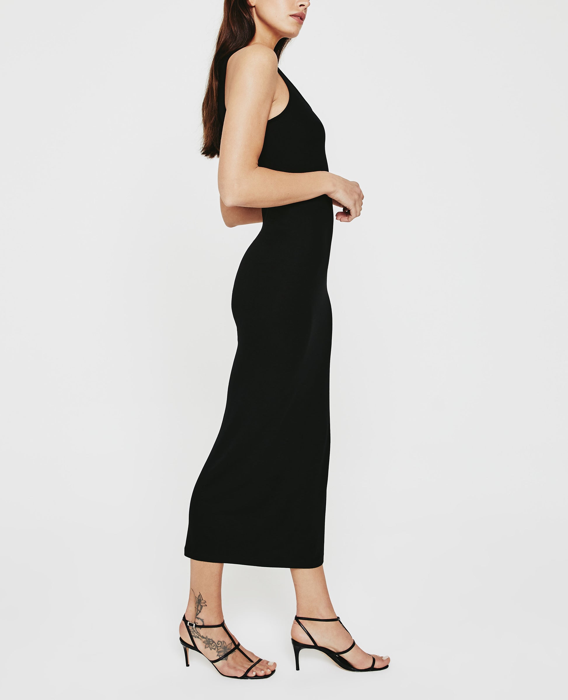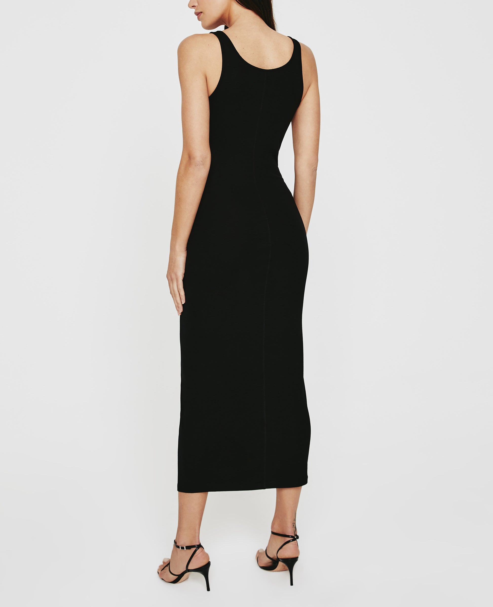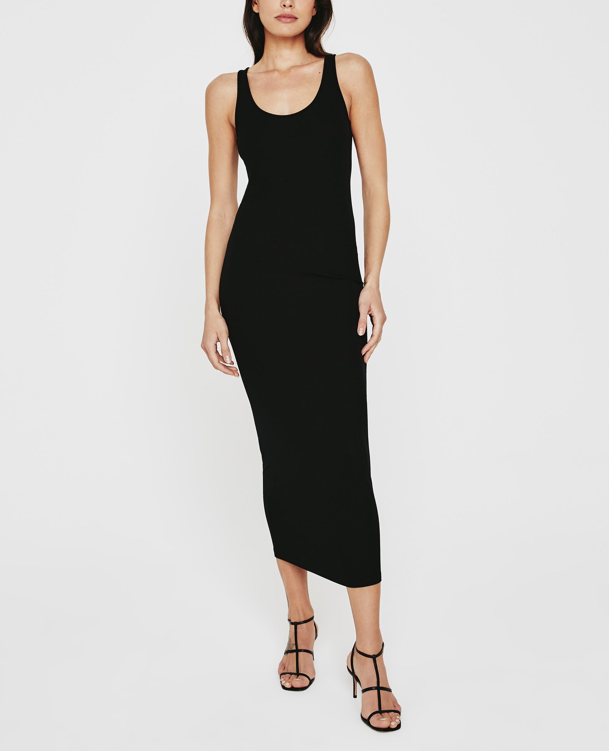 Our Jean Extended Scoop Neck Tank Dress shaped in a mid-calf length. This ribbed knit dress features a luxurious fabric that sculpts a more fitted silhouette for effortless contour. Our in-house looms deliver the precision knitting needed to accomplish the characteristic 2x1 weave that lends to the fabric’s superior comfort and draping qualities. Designed in a premium black spandex and 2x1 Lyocell Rib fabrication.