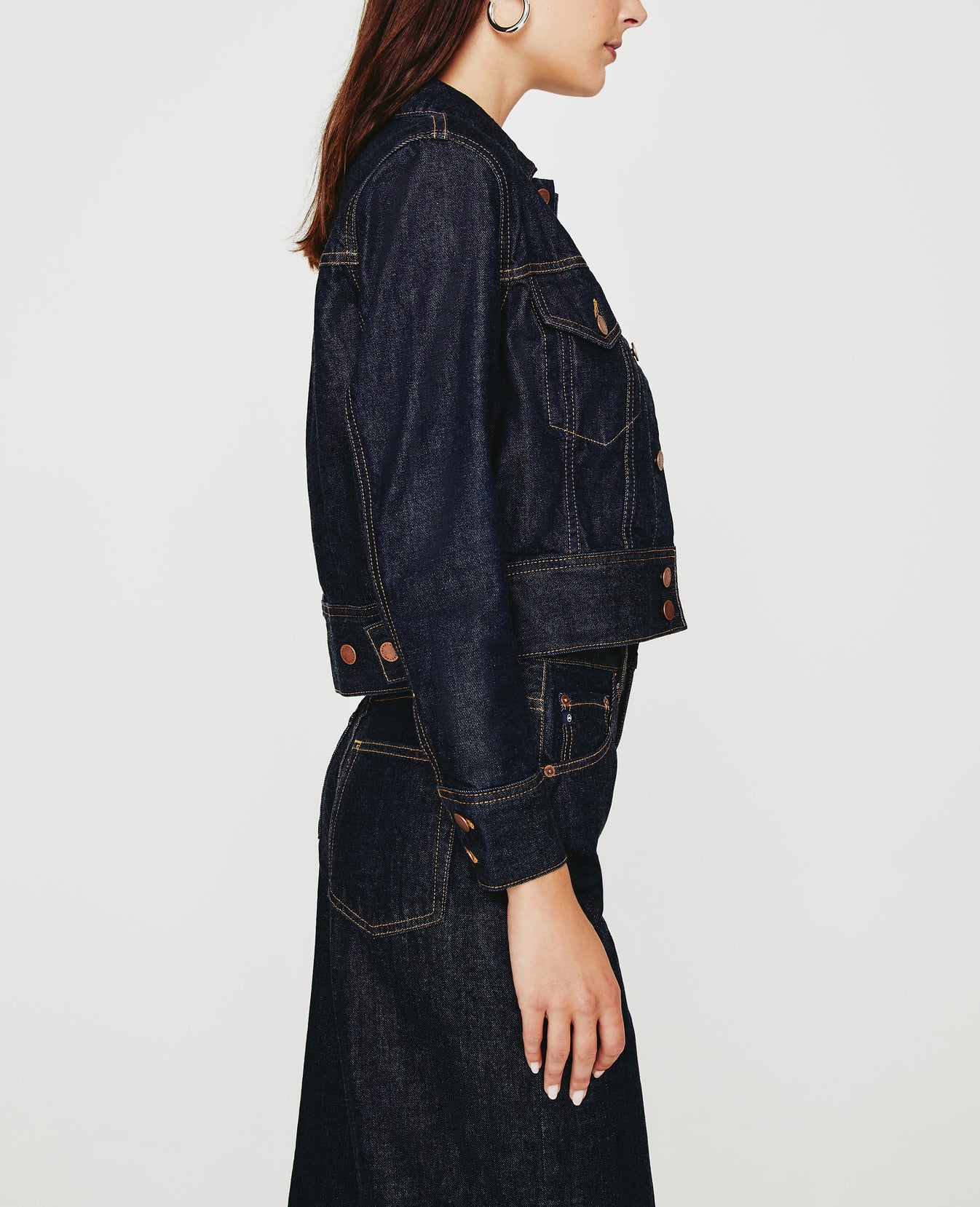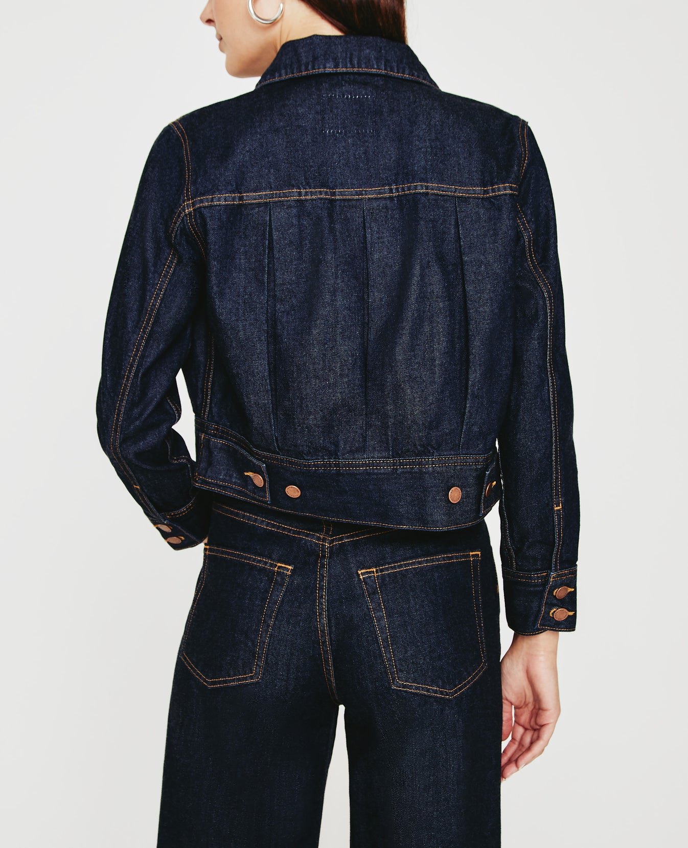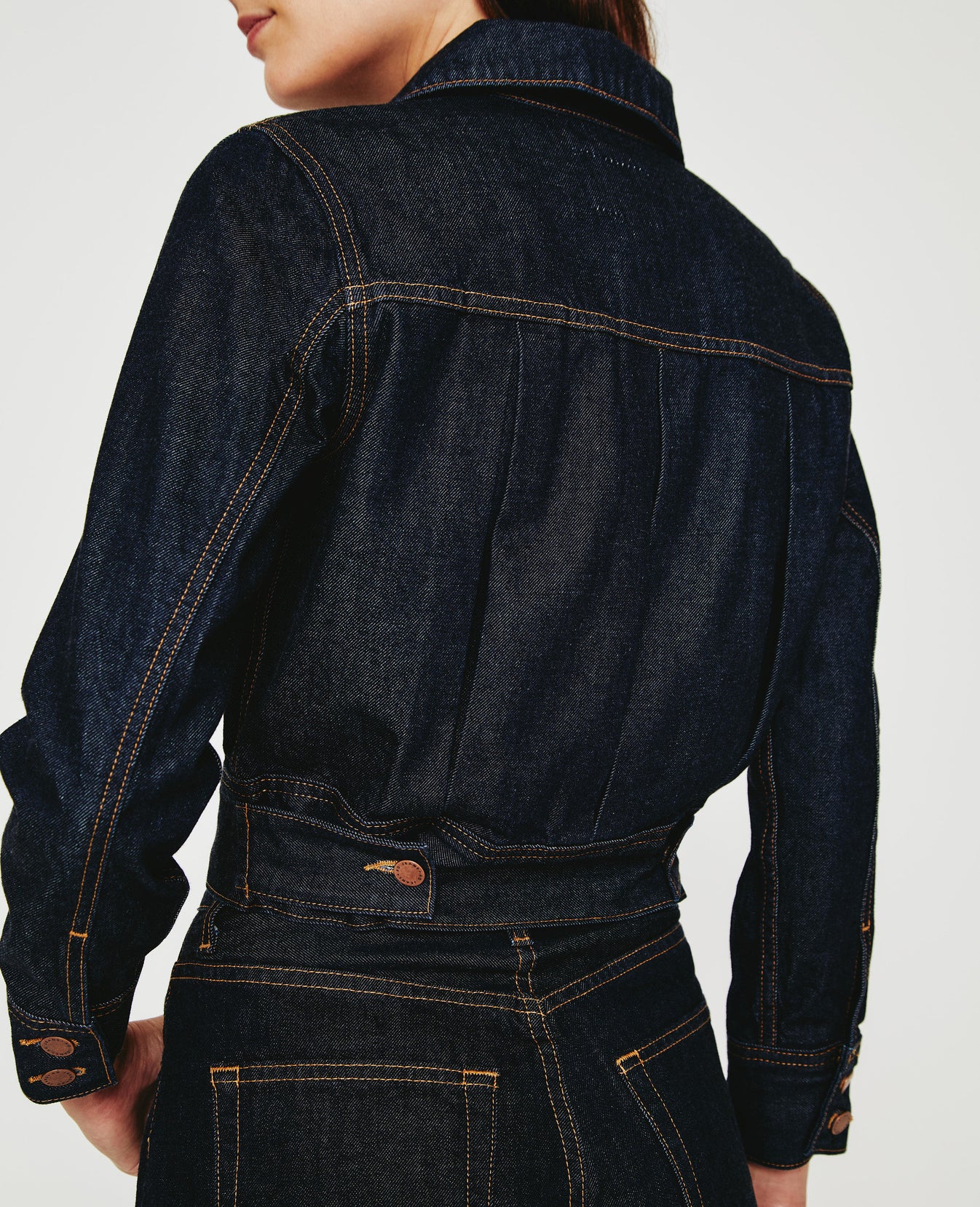 Jemma is an off-the-runway, cropped fashion jacket. Jemma offers a wide waistband and cuff finished with a double button closure. A surprise feature of this fashion-forward silhouette is the triple box pleat and adjustable waistband that puts styling options in the hands of the woman wearing it. This jacket sits beautifully in our resin rinse group with Deven, and features antique copper hardware, vintage thread colors, and a modern silhouette. Designed in 11.75 oz. Legion Denim.