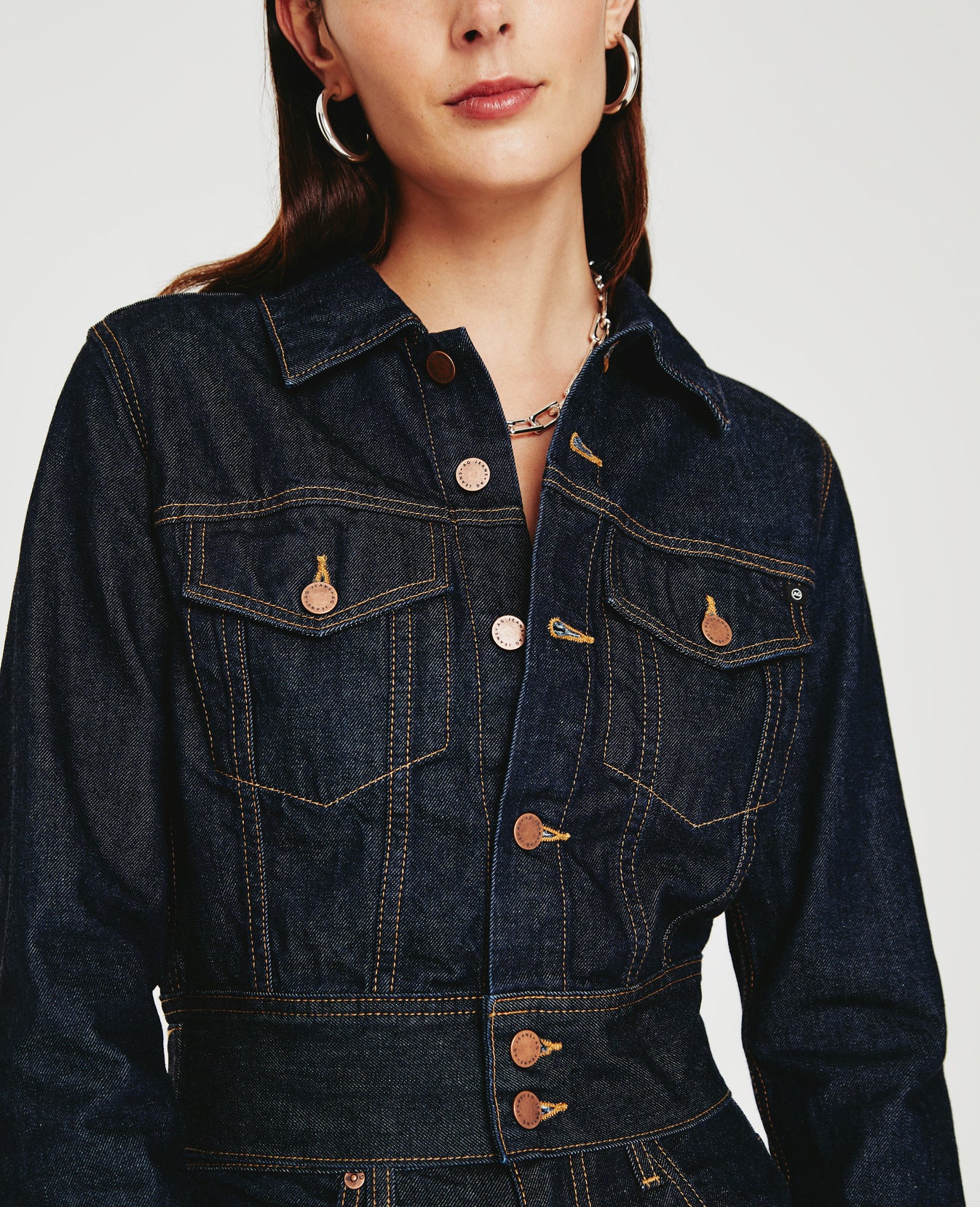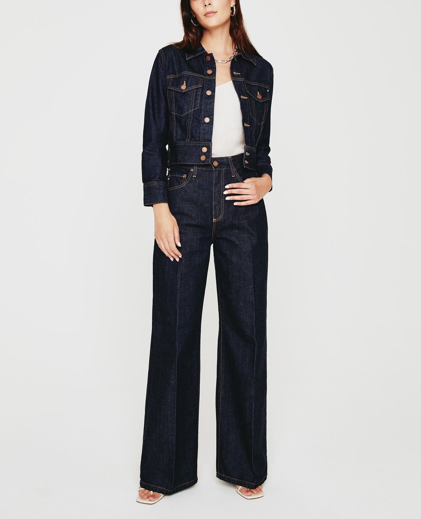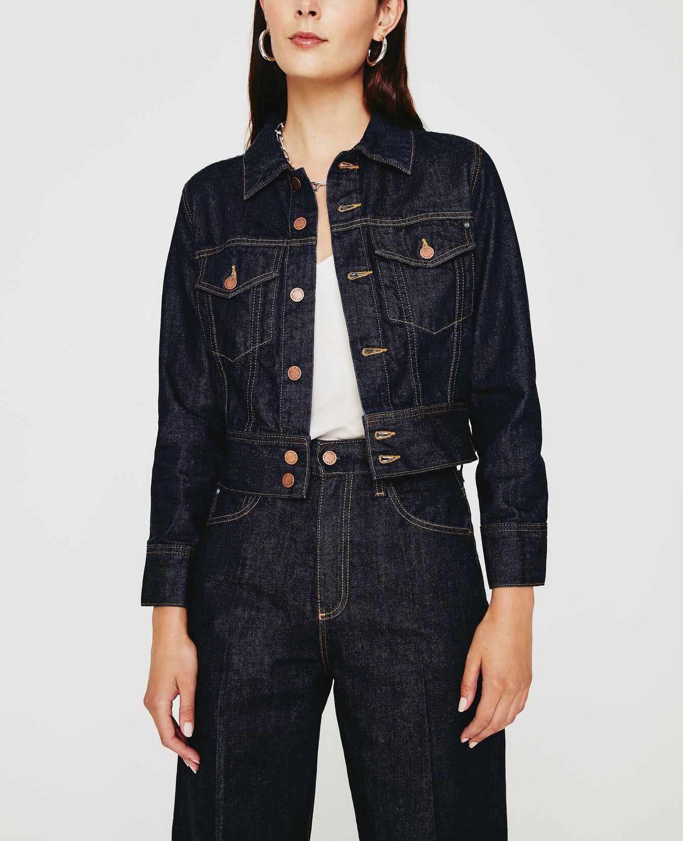 Jemma is an off-the-runway, cropped fashion jacket. Jemma offers a wide waistband and cuff finished with a double button closure. A surprise feature of this fashion-forward silhouette is the triple box pleat and adjustable waistband that puts styling options in the hands of the woman wearing it. This jacket sits beautifully in our resin rinse group with Deven, and features antique copper hardware, vintage thread colors, and a modern silhouette. Designed in 11.75 oz. Legion Denim.