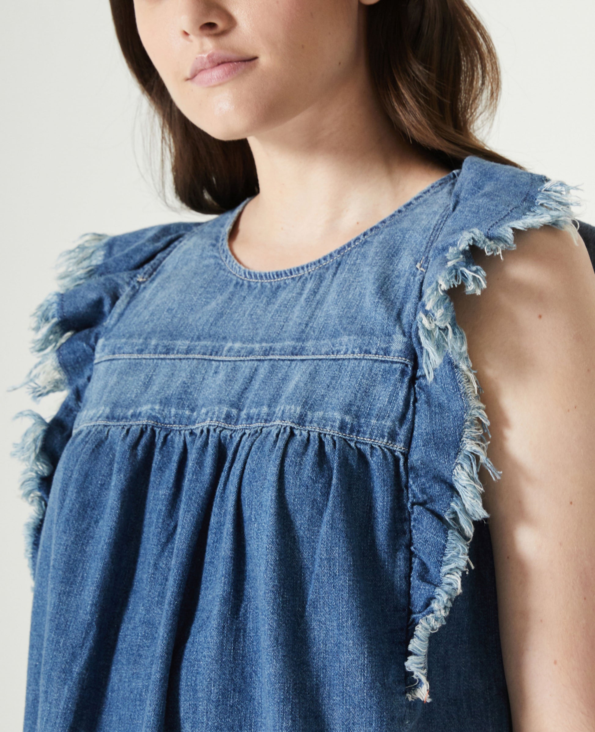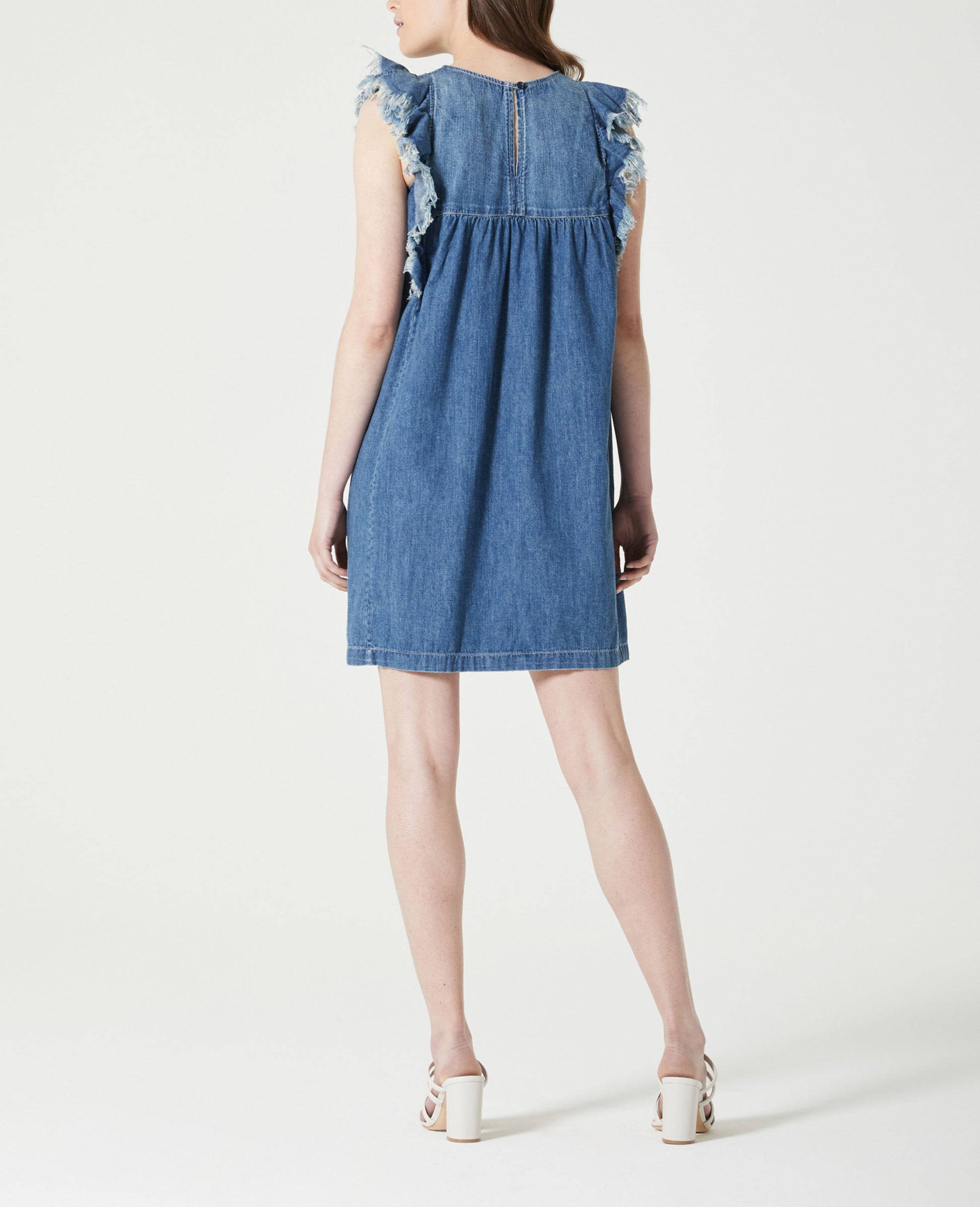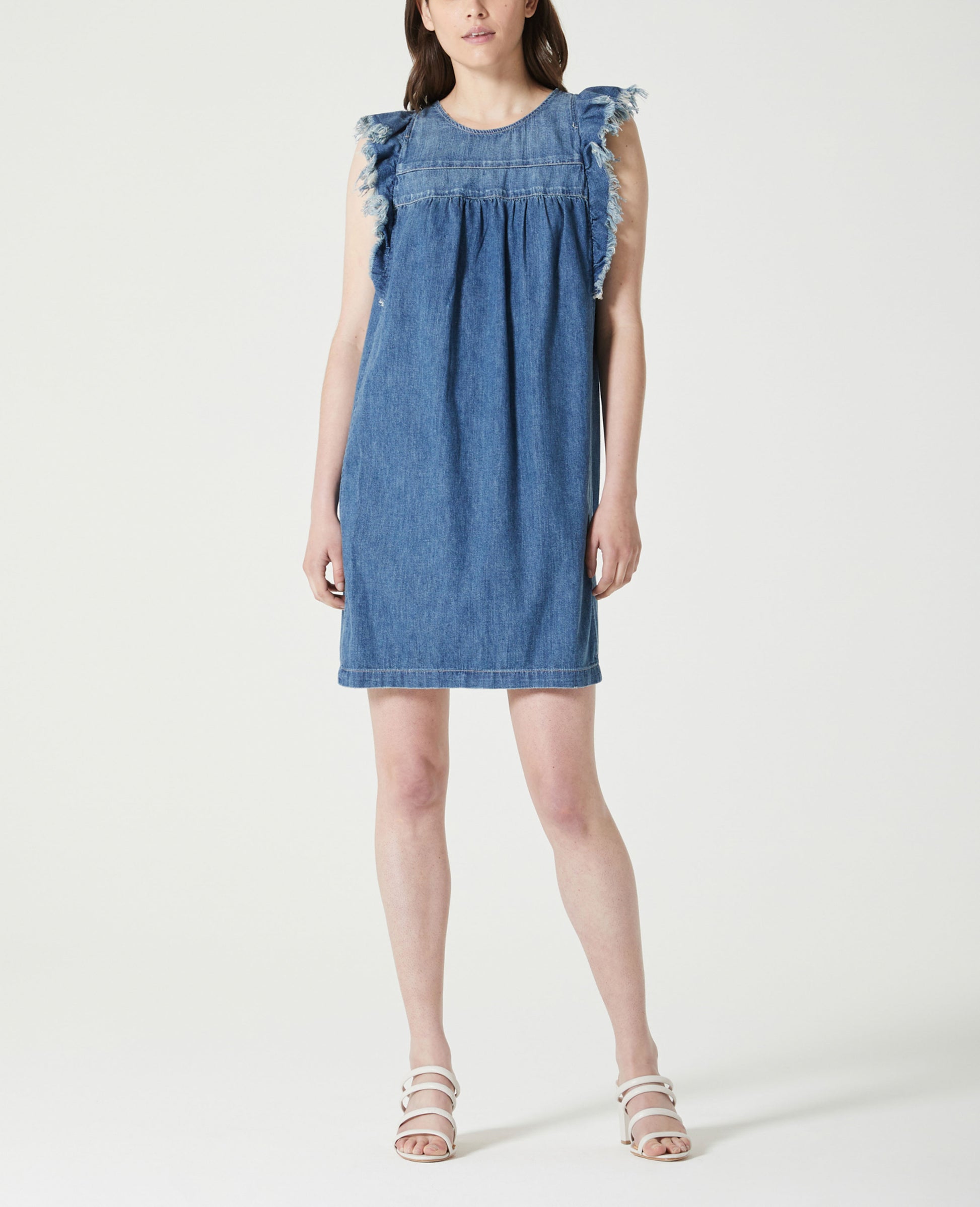 A roomy fit and scoop neckline give this dress a simple shape while raw edge sleeves are edgy and worn-in. Cut from our premium Cove denim for a heightened take.