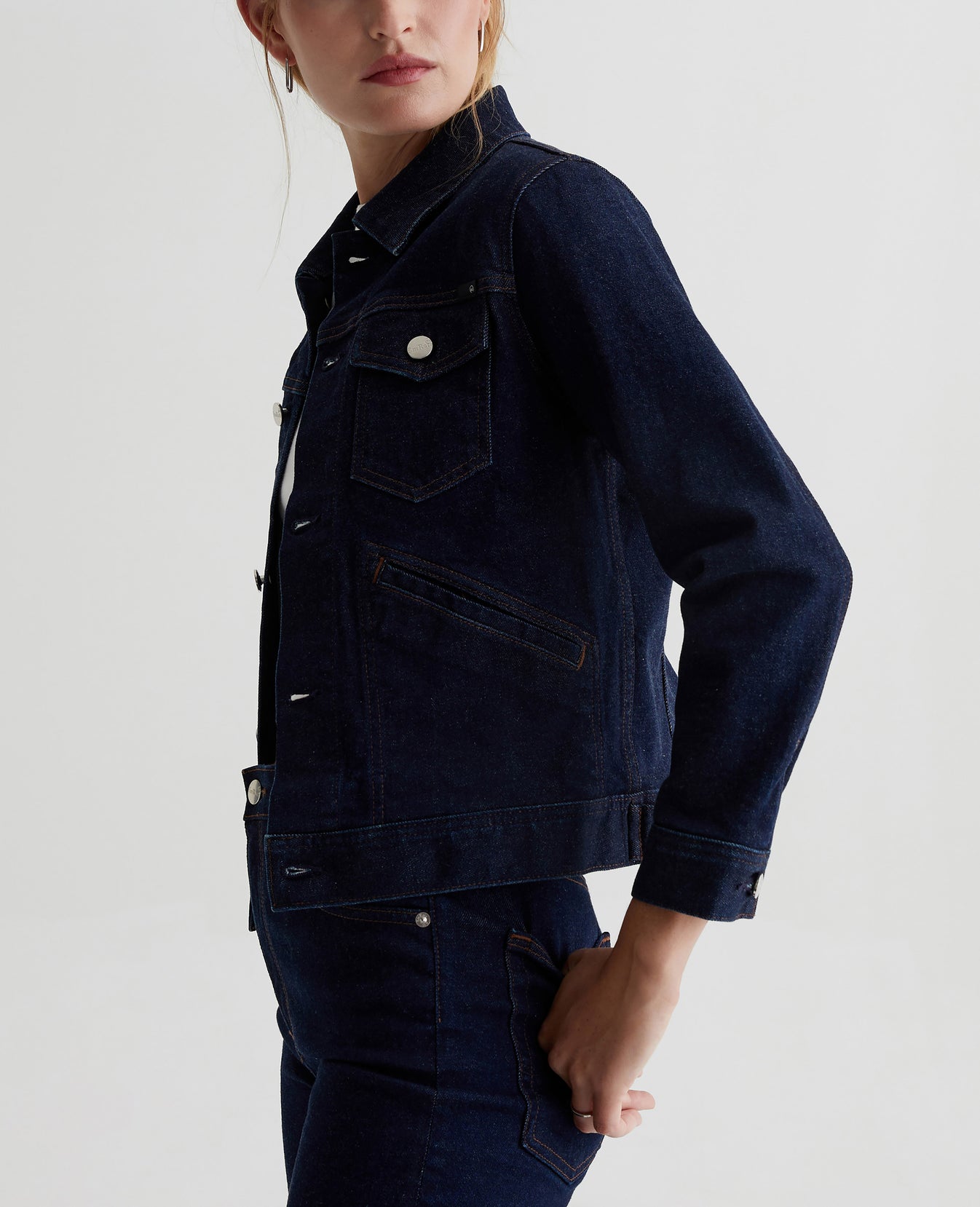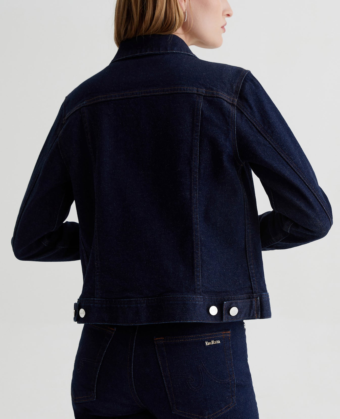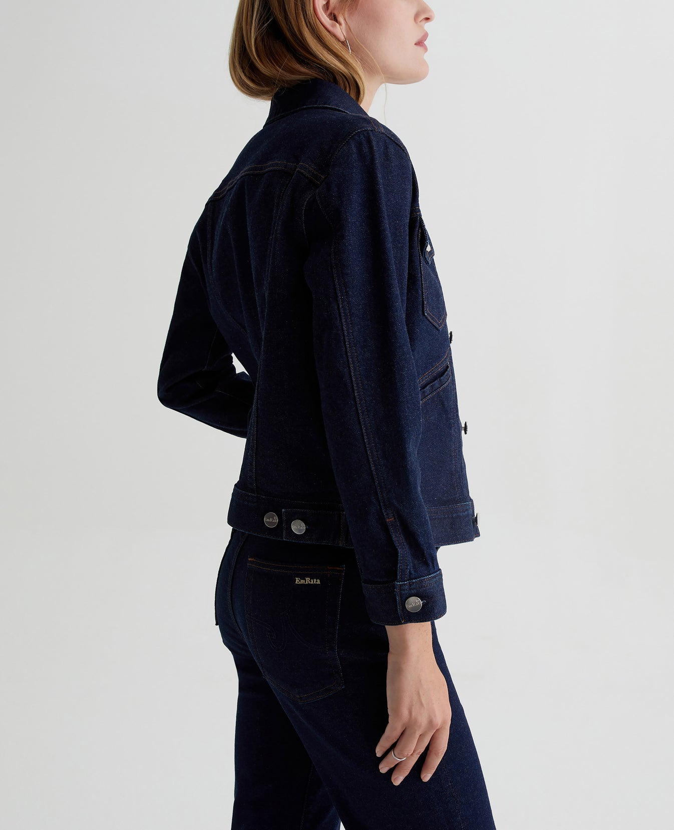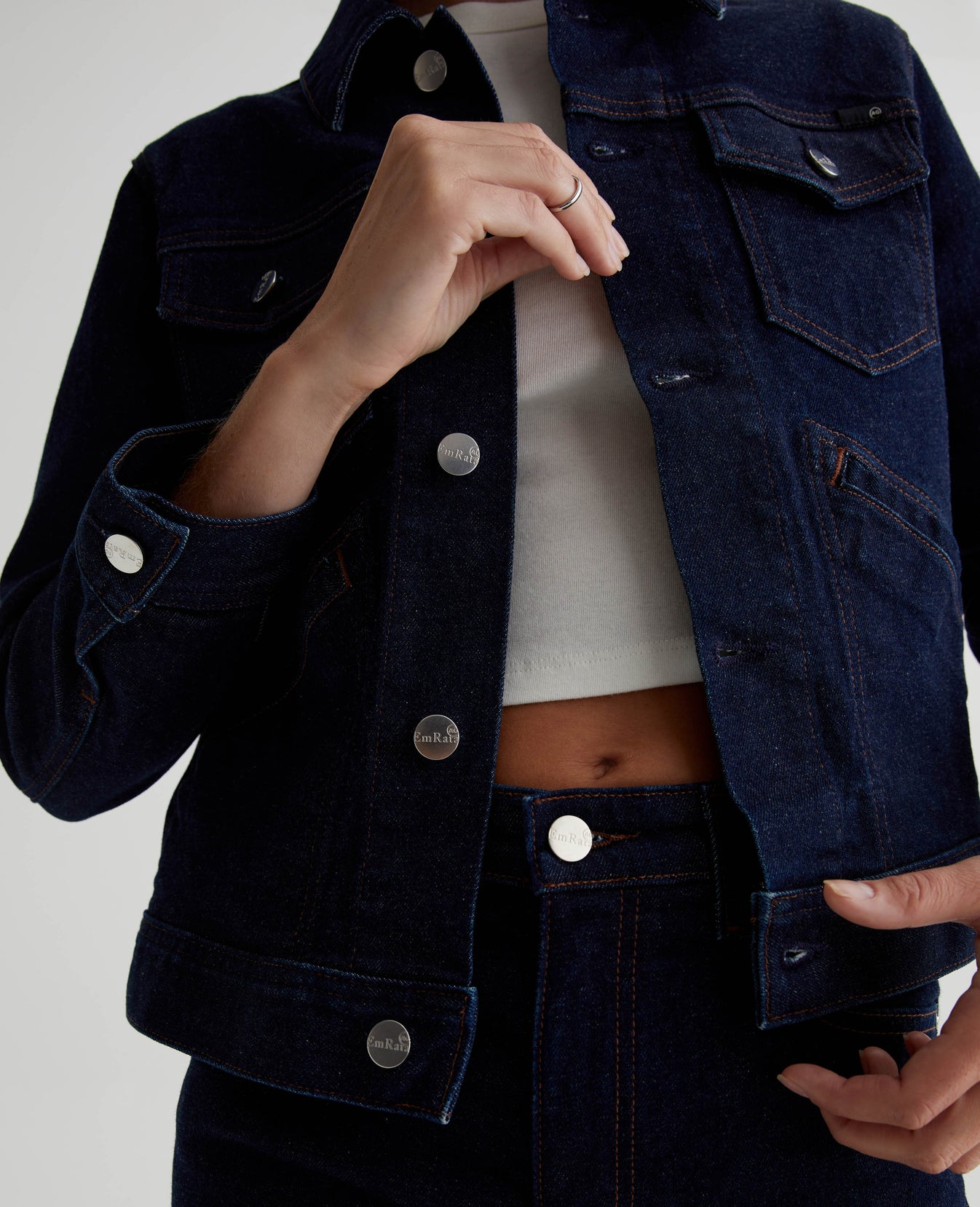 The EmRata x AG Jerrie Jacket is a sleek shrunken denim jacket with an elevated modern allure. The 12 oz. Classic Comfort Stretch Denim ensures comfort and ease of movement. The shrunken fit, with its bracelet length sleeves, defies the typical trucker with its fitted chic silhouette that pairs back to dark washed denim for a polished look. Finished with complete contrast stitching and custom Italian EmRata emblazoned hardware. Designed in partnership with Emily Ratajkowski, the EmRata x AG capsule reflects the model's personal style with a curated collection of versatile pieces able to pair effortlessly together for everyday elevated style.