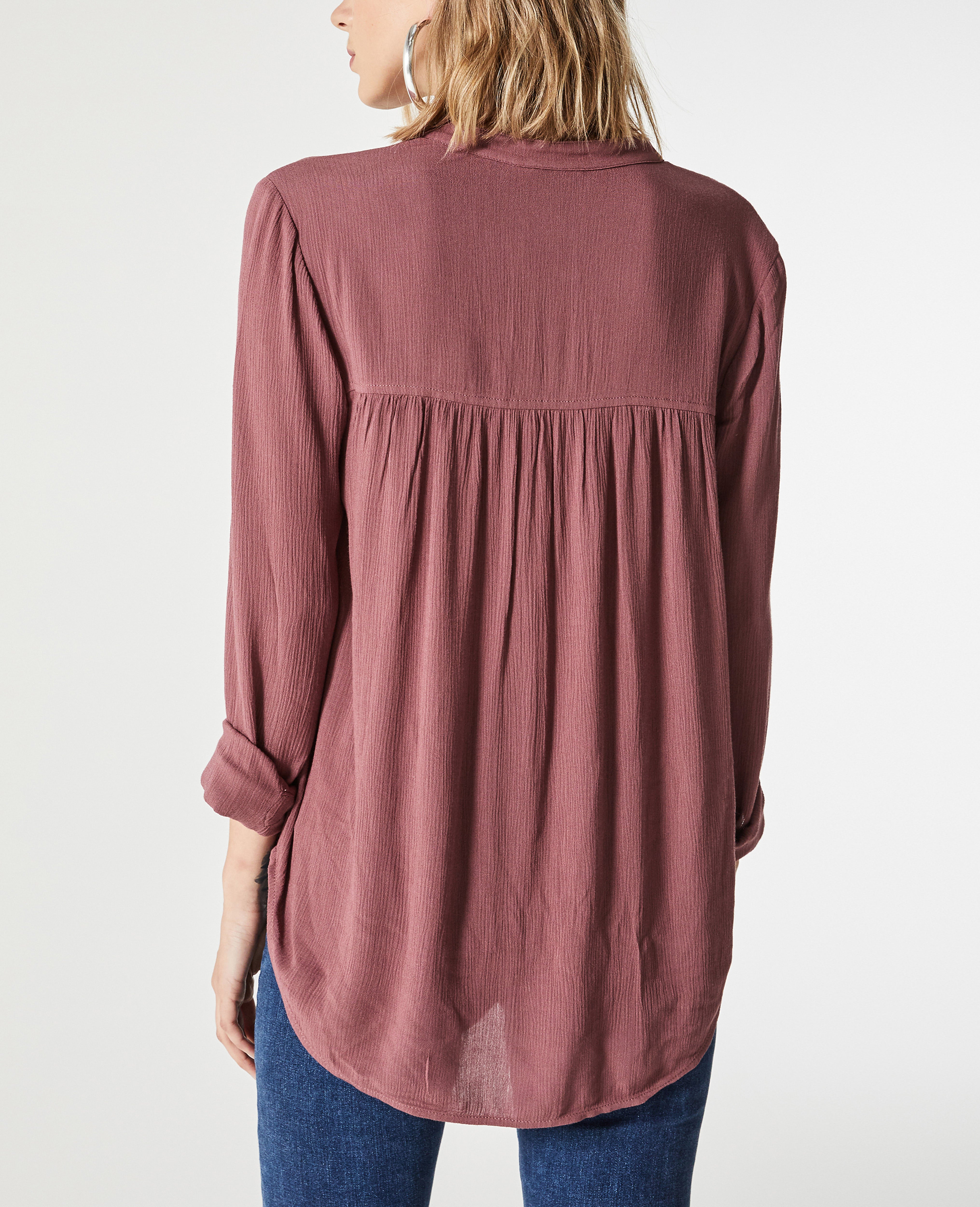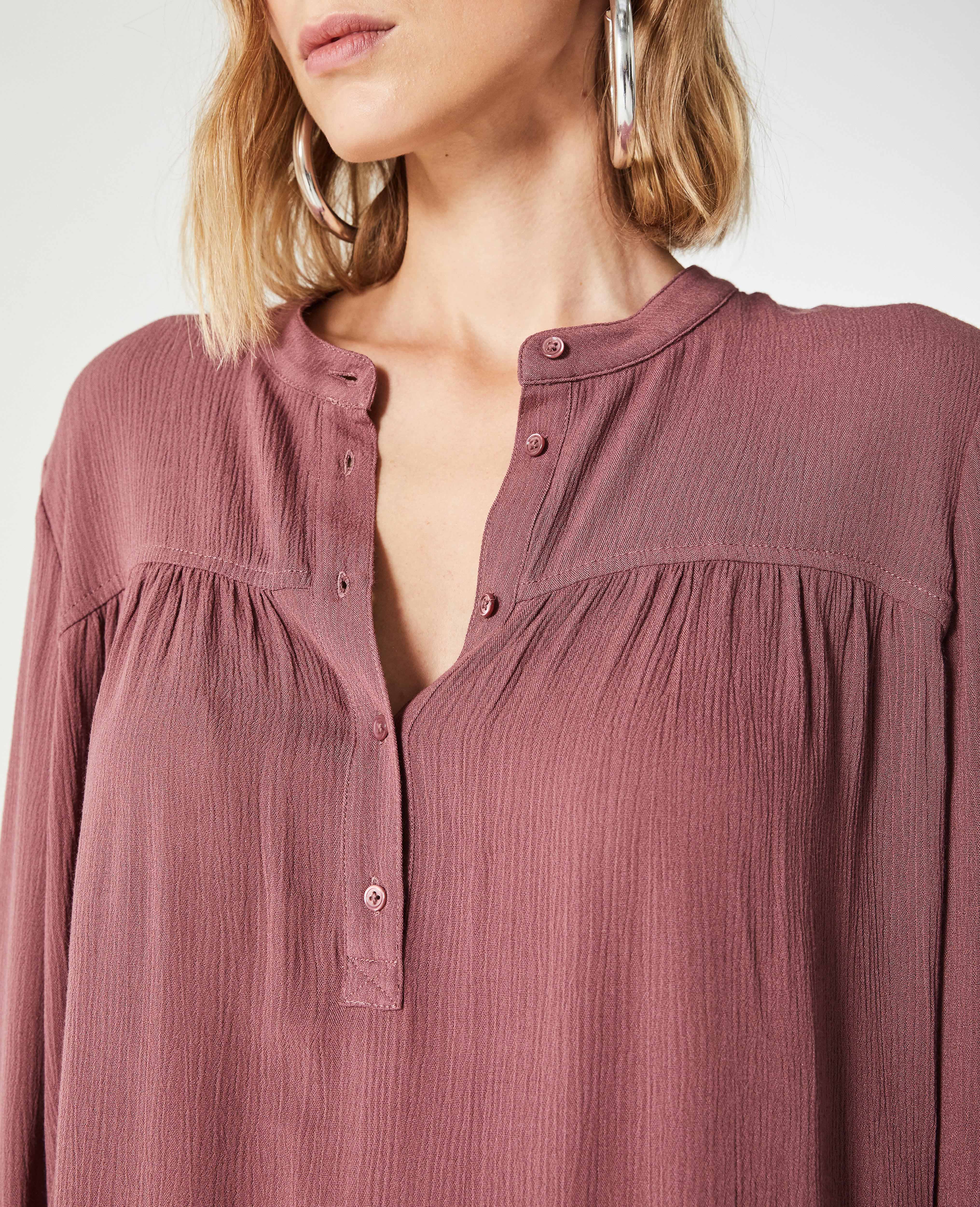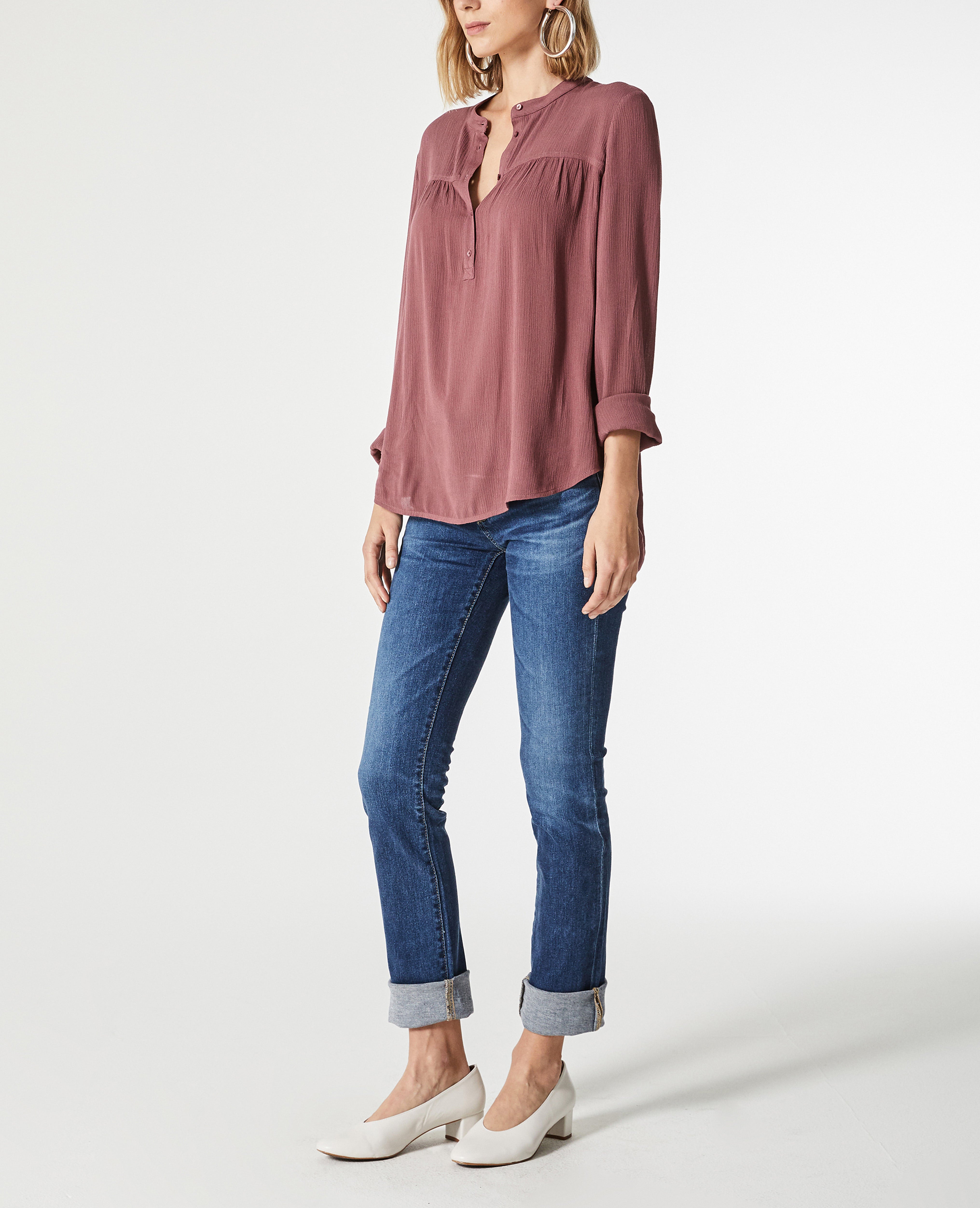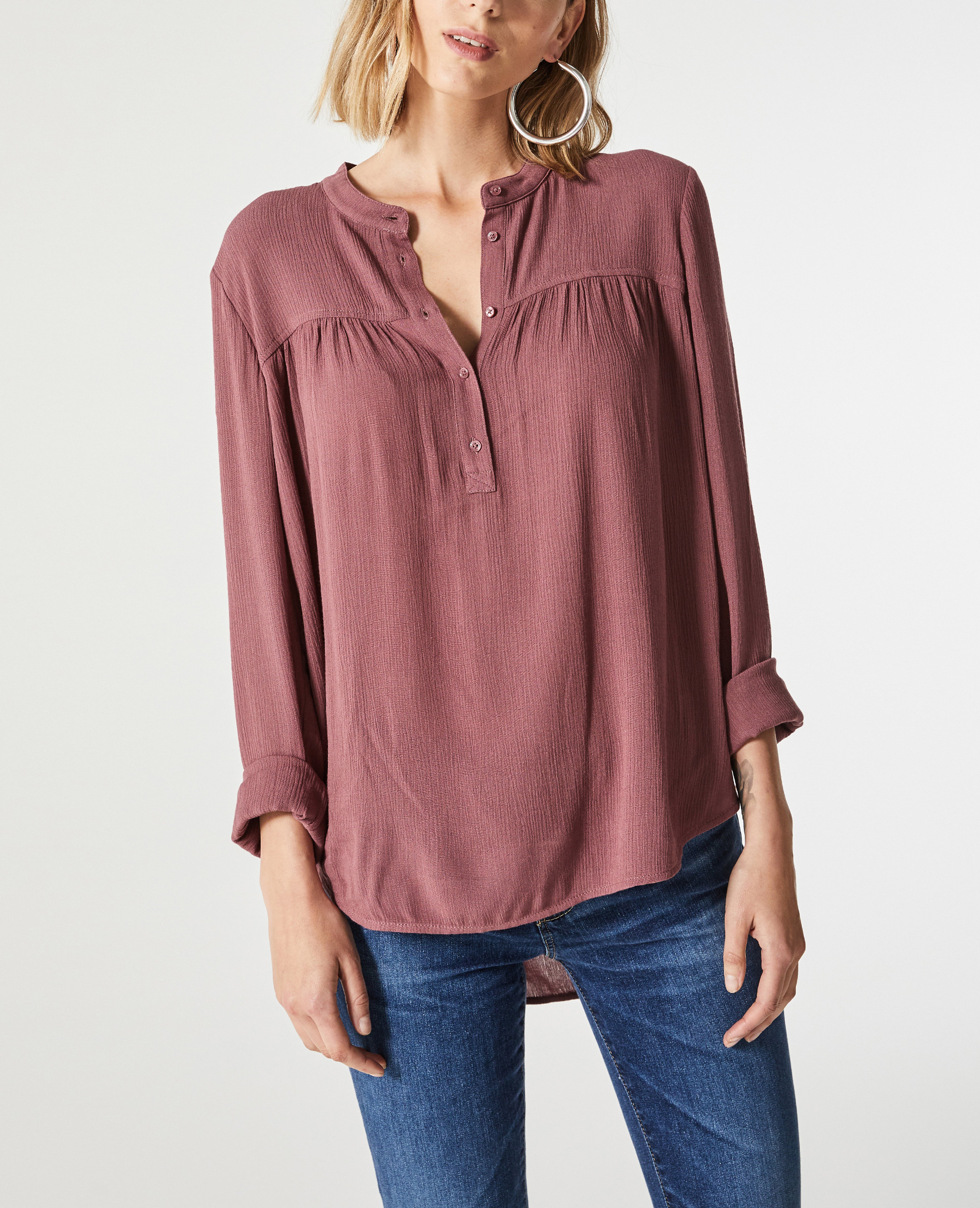 The Jess Shirt is a lightweight knit blouse is cut roomy with a henley partial button front closure.