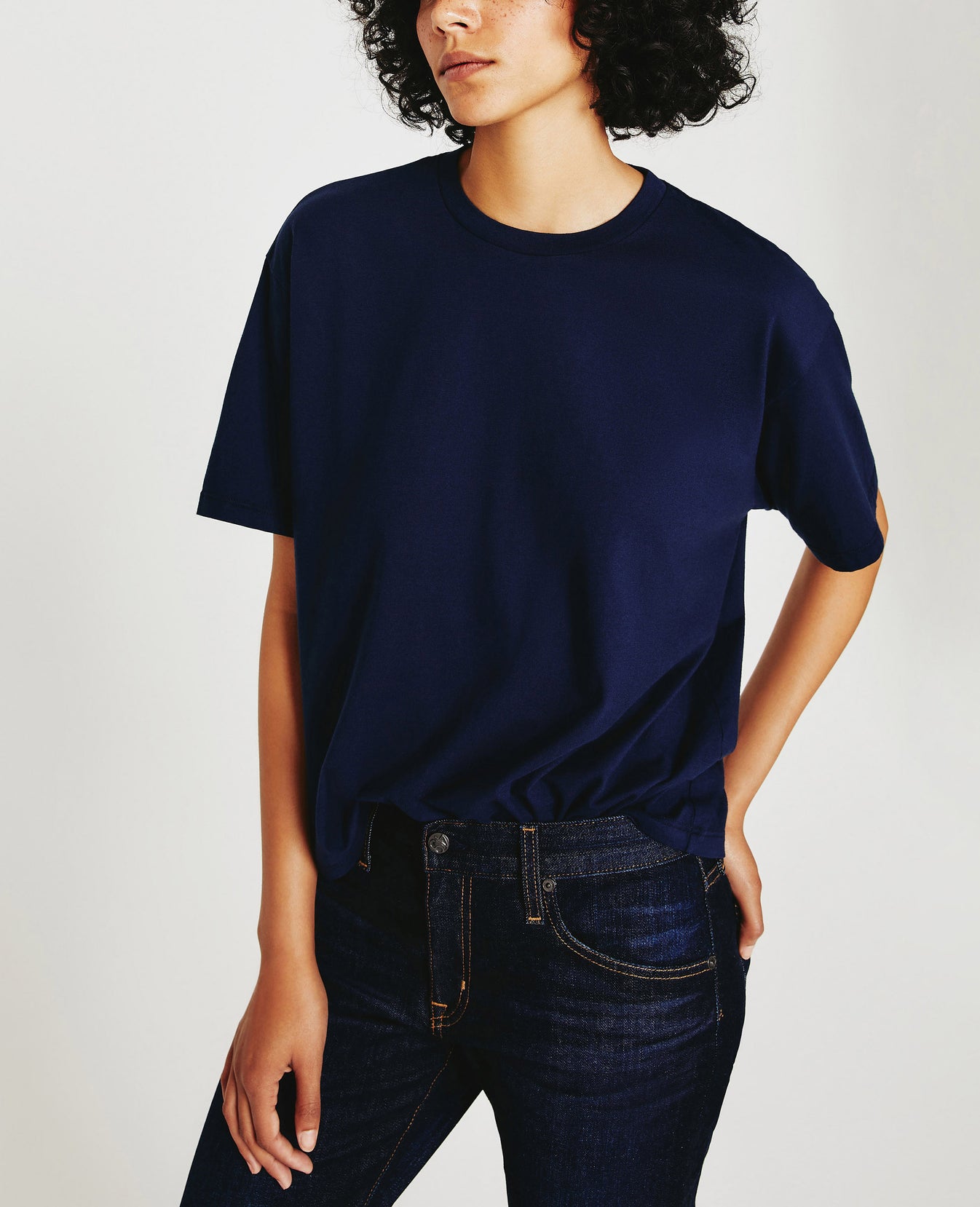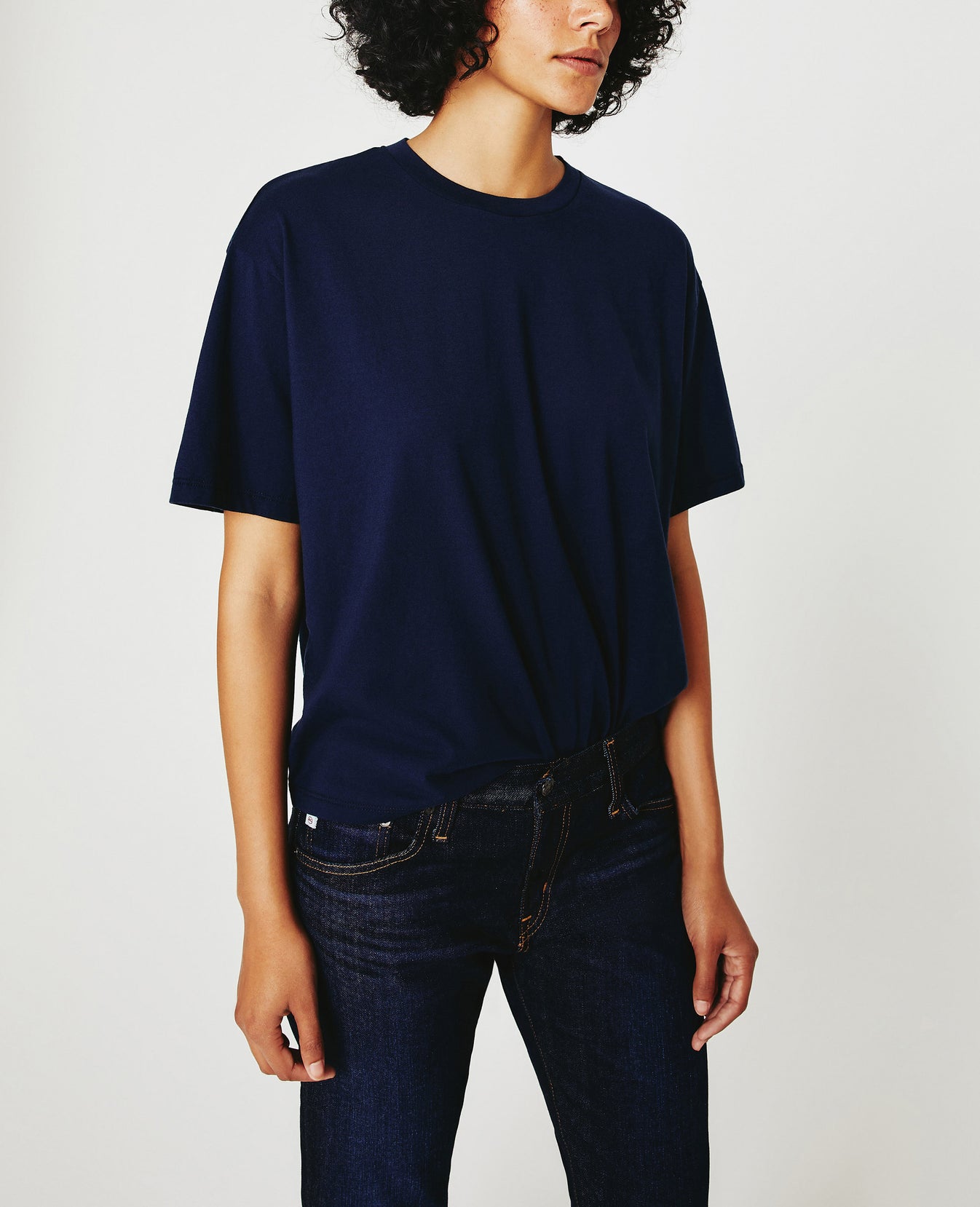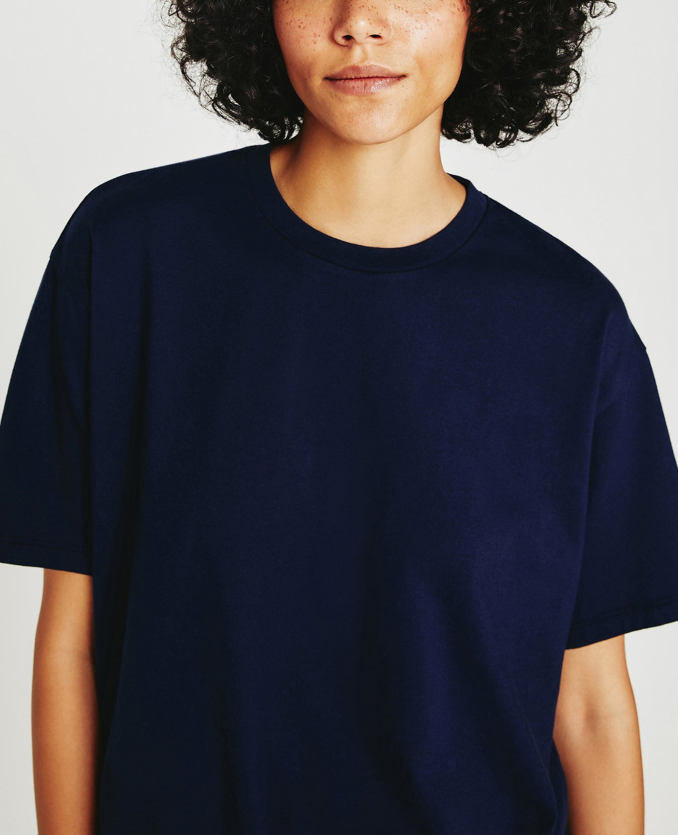 The Karter Ex-Boyfriend Short Sleeve Crew in navy is our first introduction to a relaxed fit short sleeve crew. Drop shoulders creates a modern, oversized take on the “borrowed from your boyfriend” look. Our Jersey Knit offers a luxurious comfort that is unrivaled—knitted with both S-twist and Z-twist yarn to sustain longevity and stability, preventing unnecessary twisting and torquing. During the production process, the S-twist yarn is spun counter-clockwise creating a right-handed twill. The Z-twist yarn works in opposition, spinning clockwise for a left-handed twill. This opposition—when working together—yields a softer, more durable fabrication and gives strength to the yarn making it more difficult to pull apart. Designed in 100% Cotton.