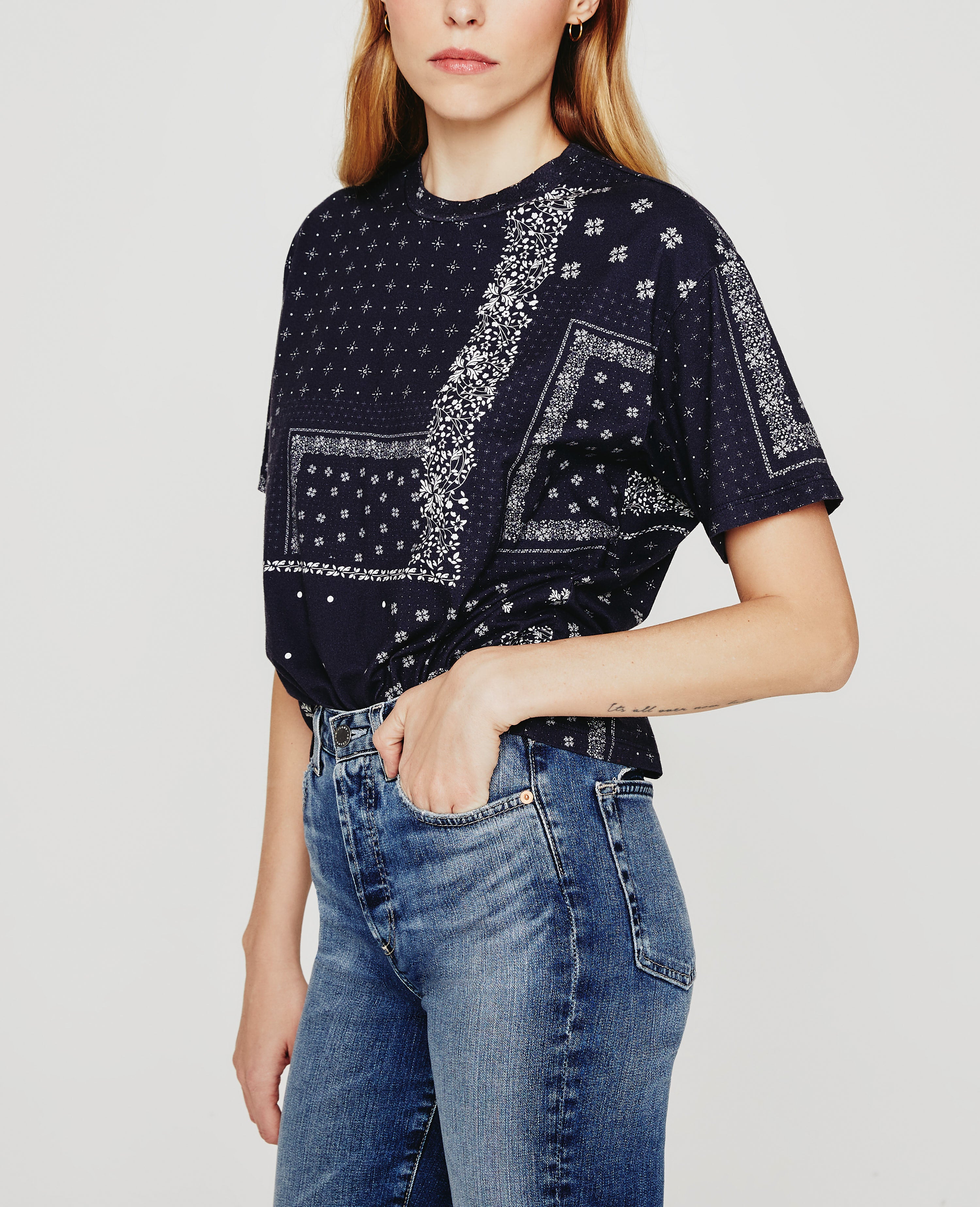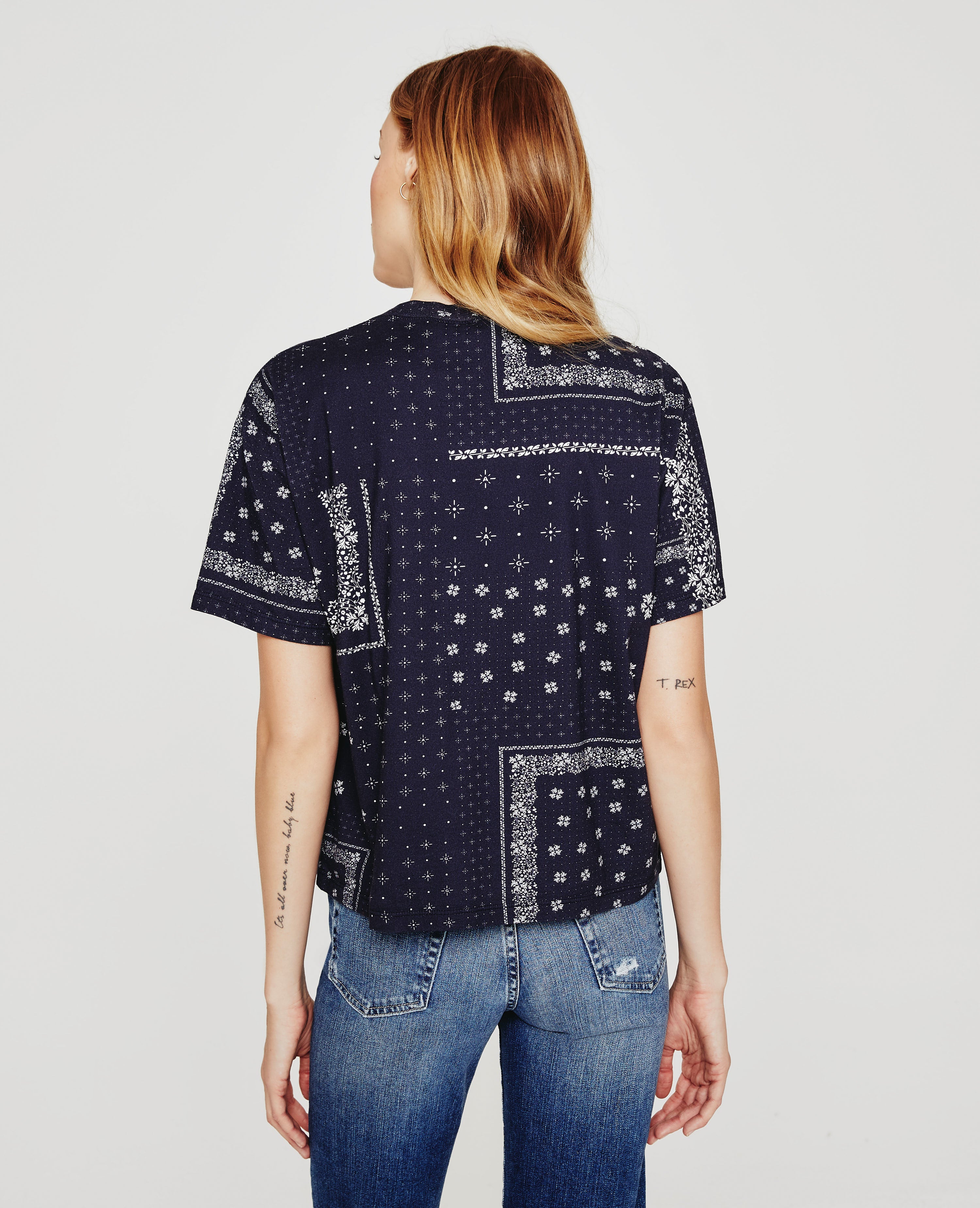 The Karter Ex-Boyfriend tee features a deep navy bandana print on our comfy Light Cotton Jersey fabric. This women's tee has a relaxed, easy fit with a crew neck and drop-shoulder construction.