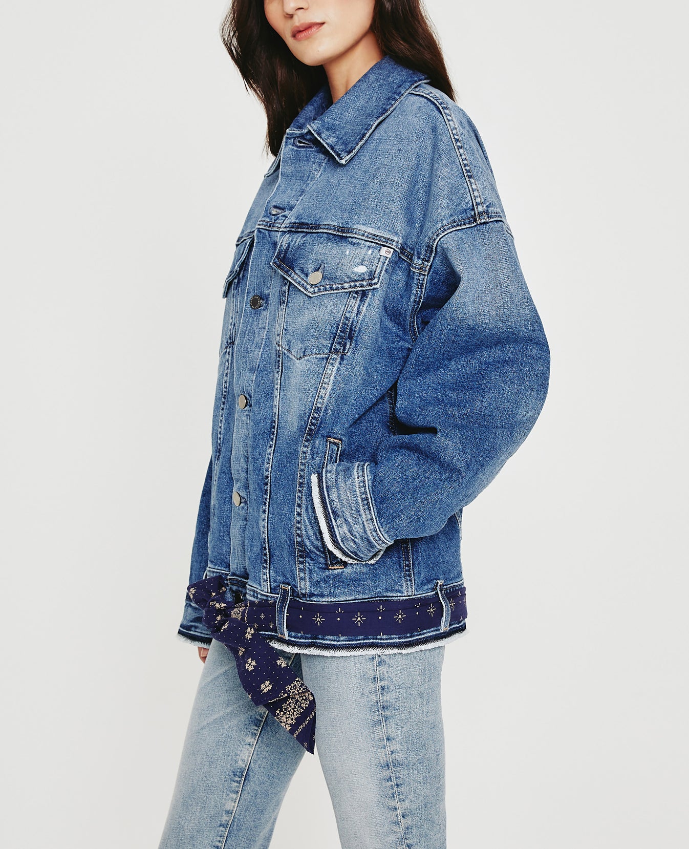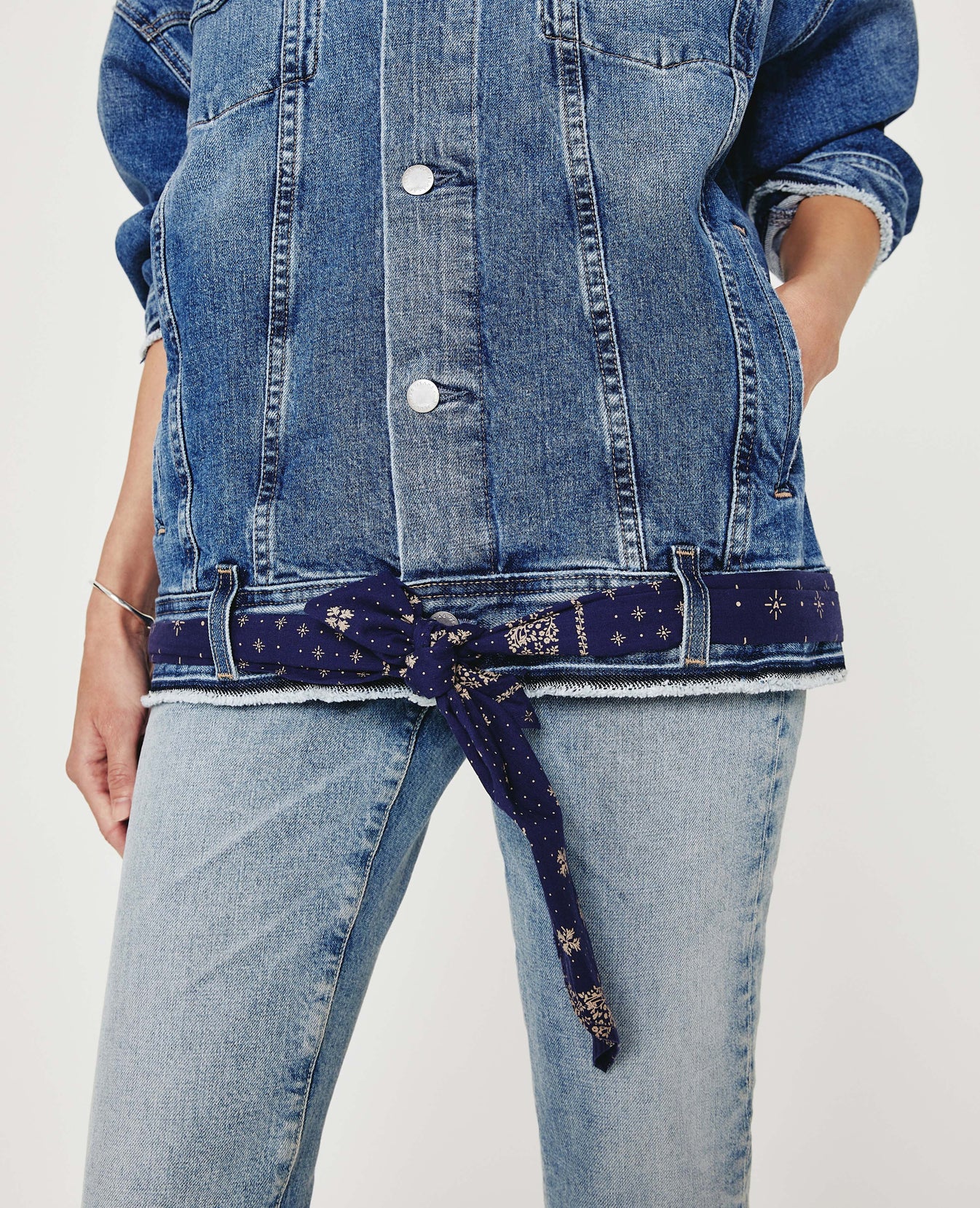 Our Kendrix Jacket is an oversized trucker jacket that comes with a bandana-print tie belt woven through the belt loops. This denim jacket for women is made from 11 oz. 360° Denim with vintage bi-stretch and a faded medium indigo wash. It's relaxed and easy to layer, designed with dropped shoulders, exaggerated hems, and an extended length. Frayed edges finish the look.
