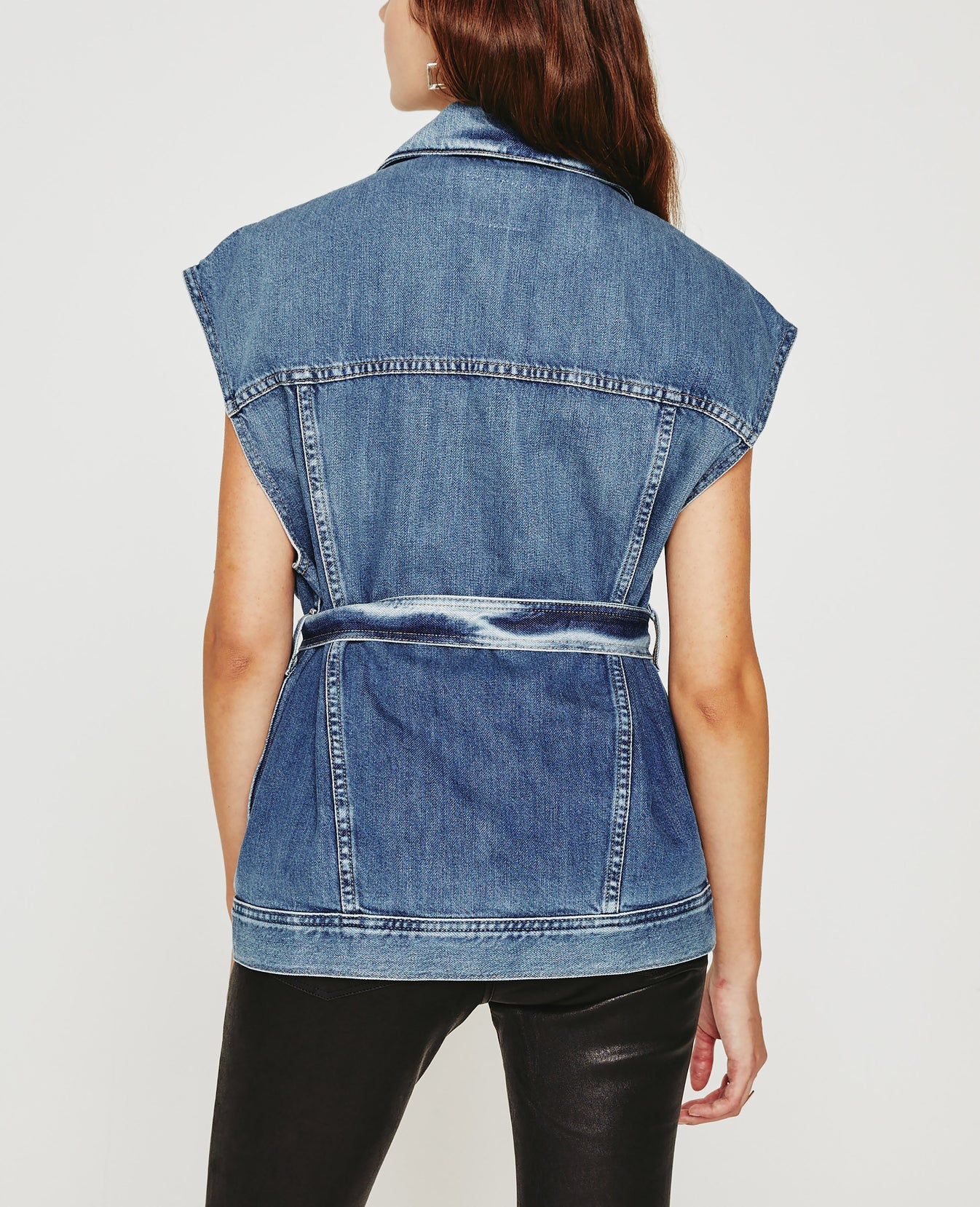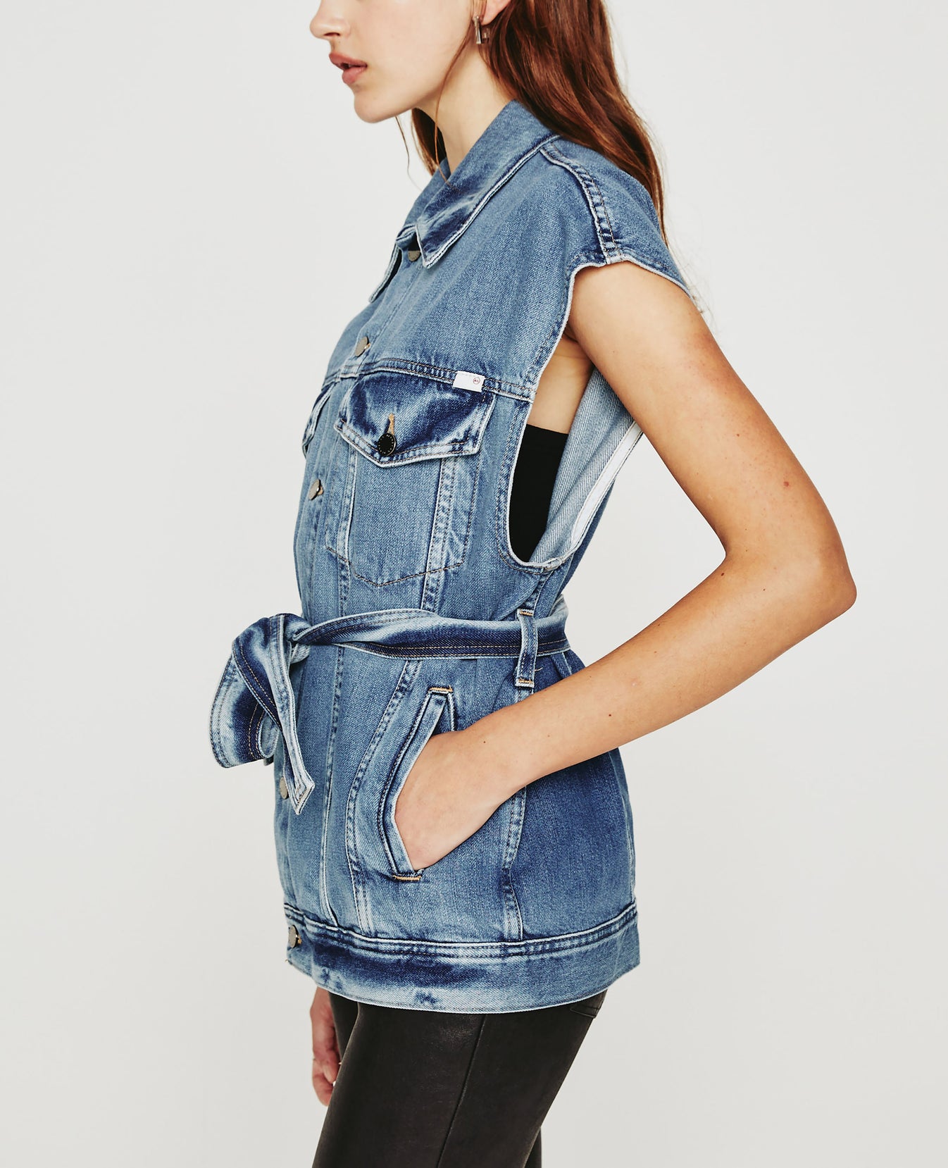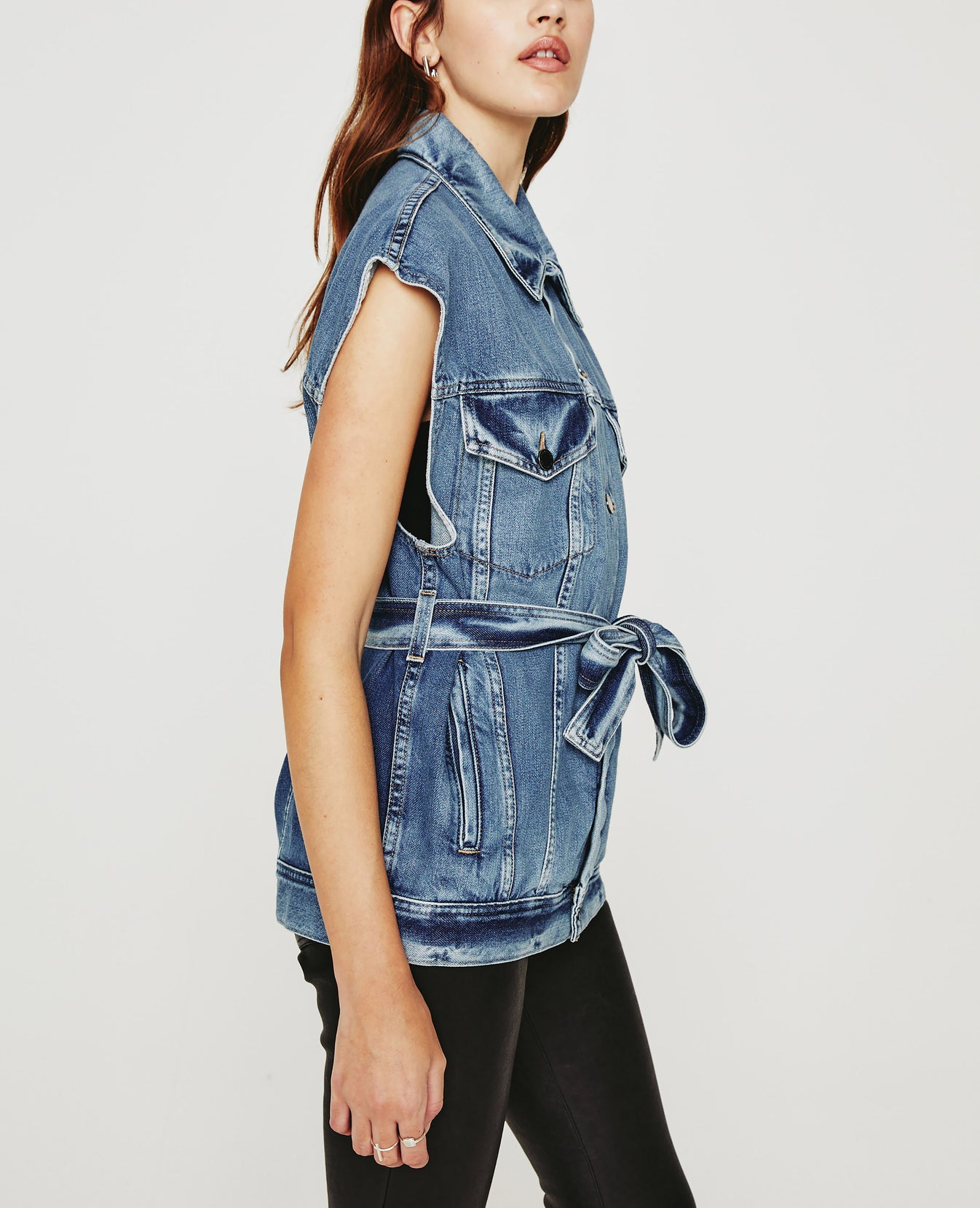The Kendrix Vest is a vintage-inspired oversized trucker style in a medium blue wash with allover fading. Made from nonstretch 12.75 oz. Savior Rigid Denim, it has an extended length and a removable tie belt to cinch the waist. Flap pockets, sturdy metal hardware, and concealed hip pockets complete the look.