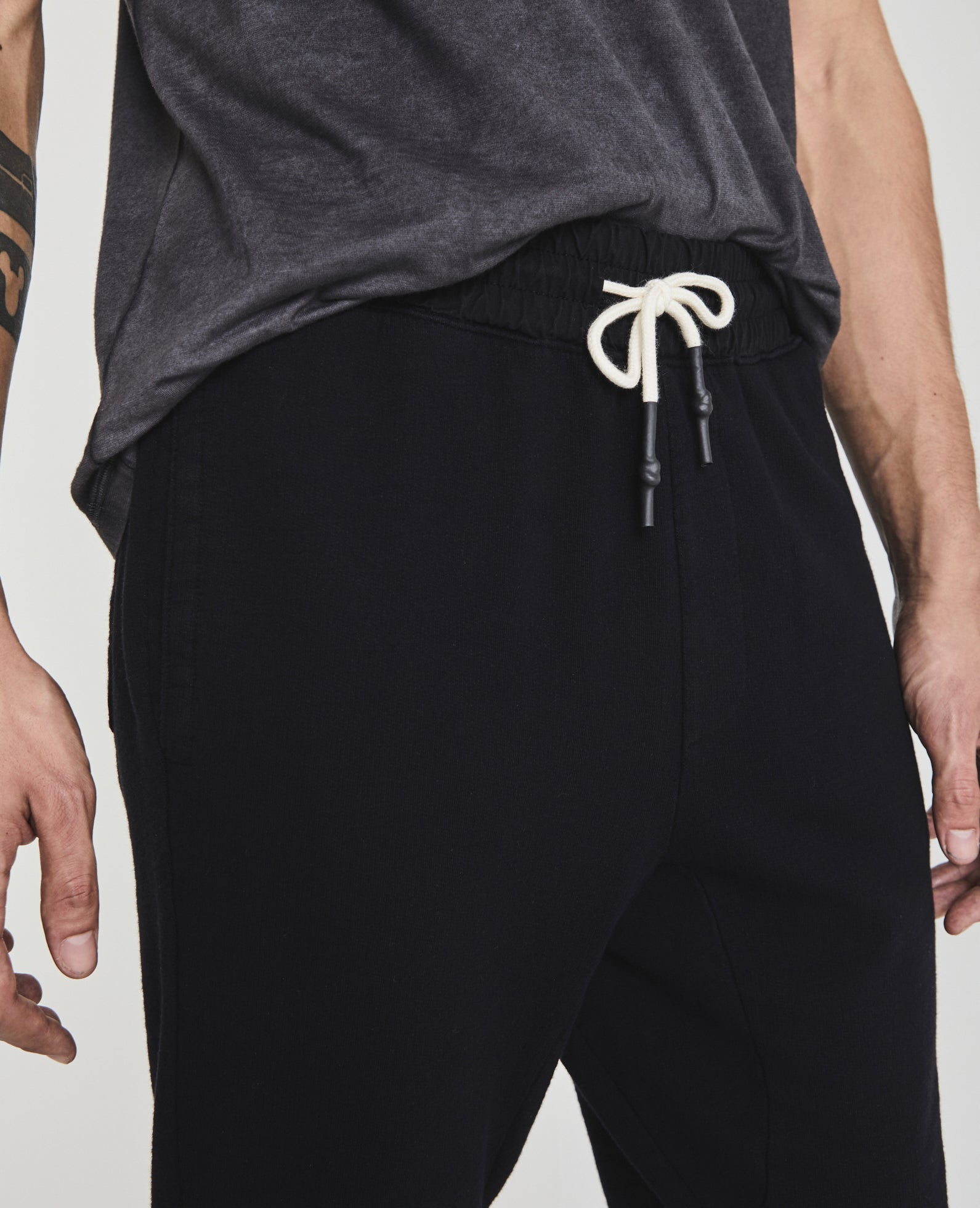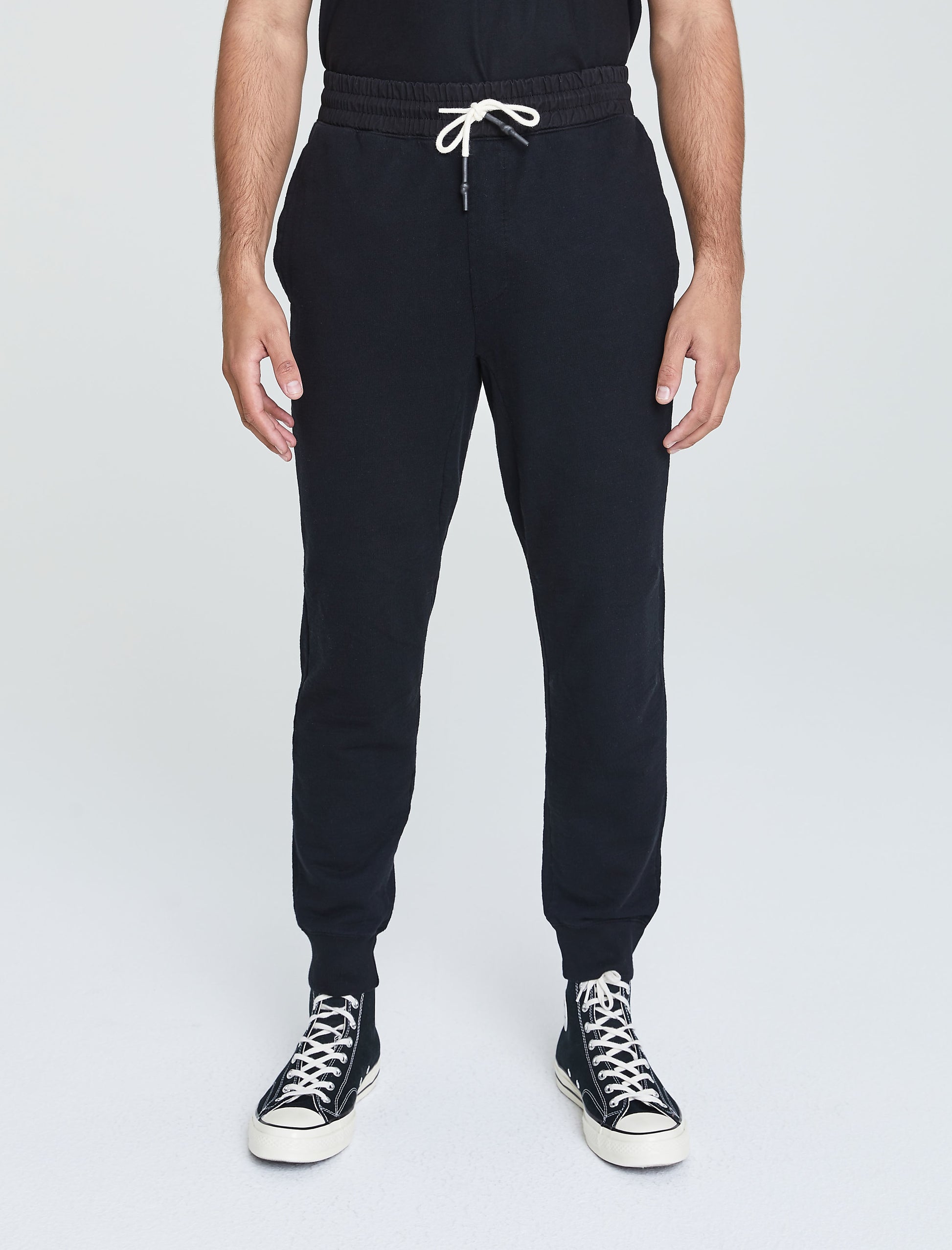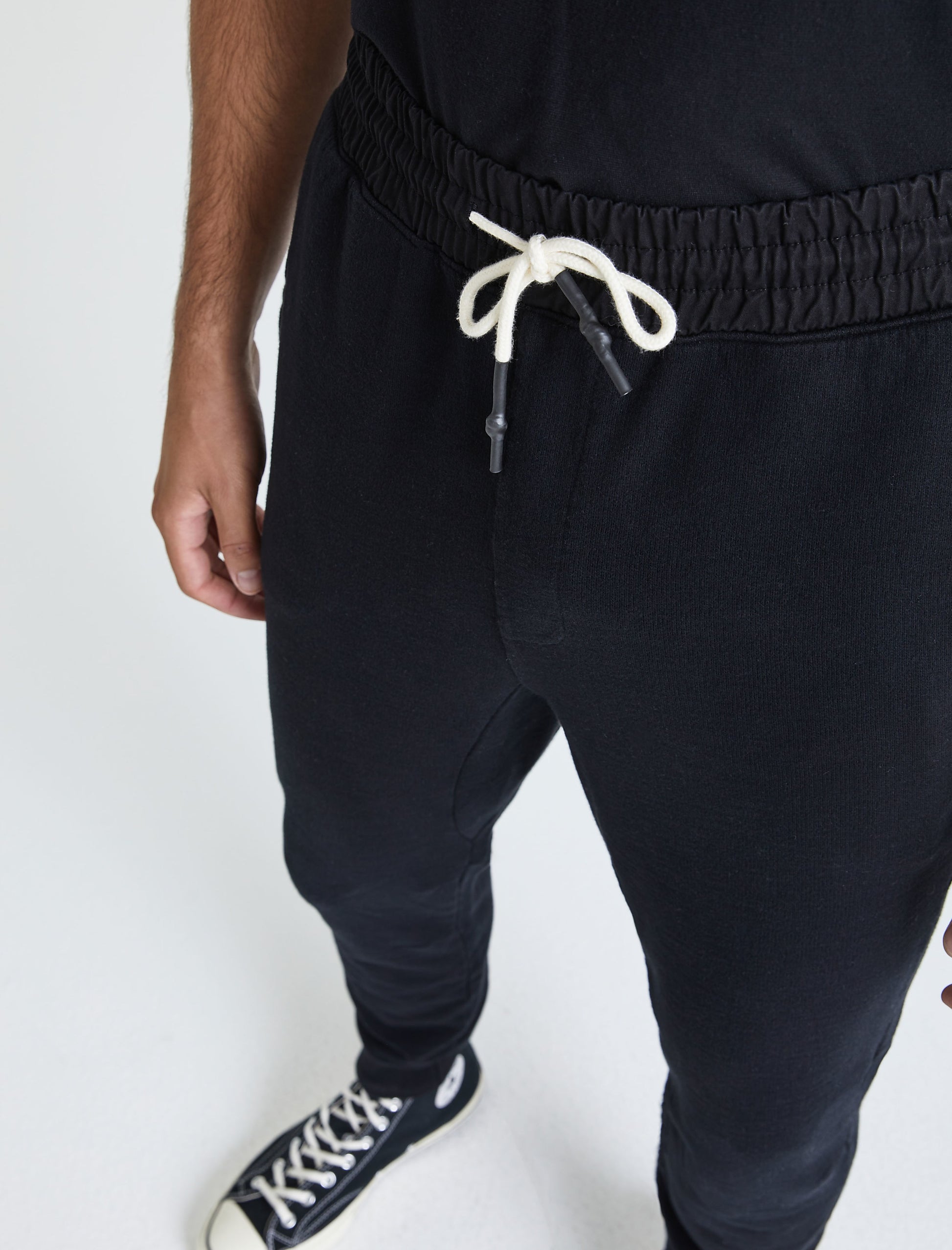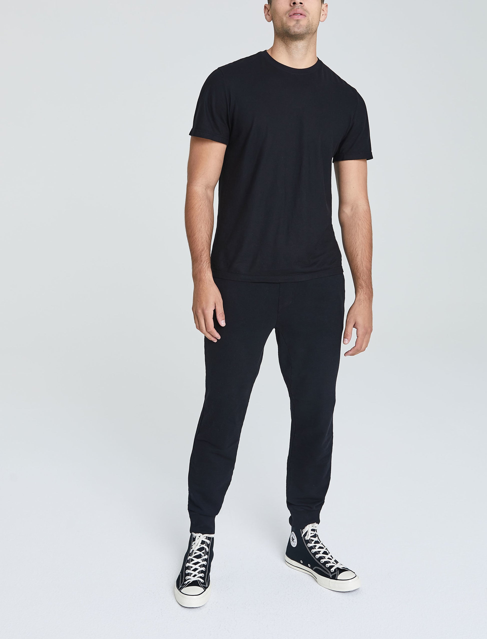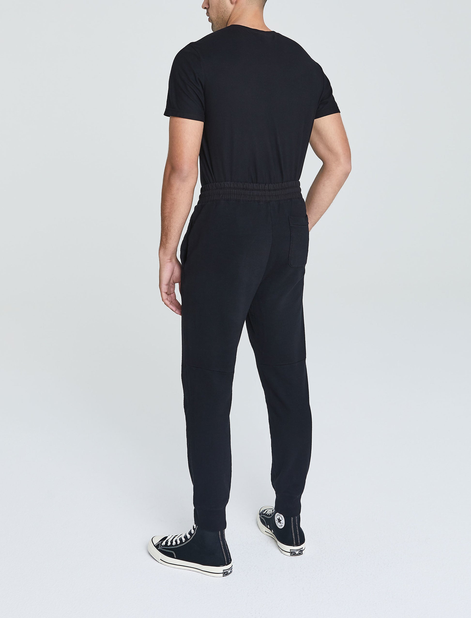 The Kenji Jogger for men features a deep black hue, slim silhouette, and drawstring waist with ruched construction. Finished with dipped draw ties, subtle bar tacks, gusset paneling, discreet side welt pockets, a single back pocket, and tapered leg openings with an elastic rib cuff. This men's sweatpant is designed in an exclusive AG-made terry featuring a lightweight feel, ultra soft touch, and a color-rich finish.