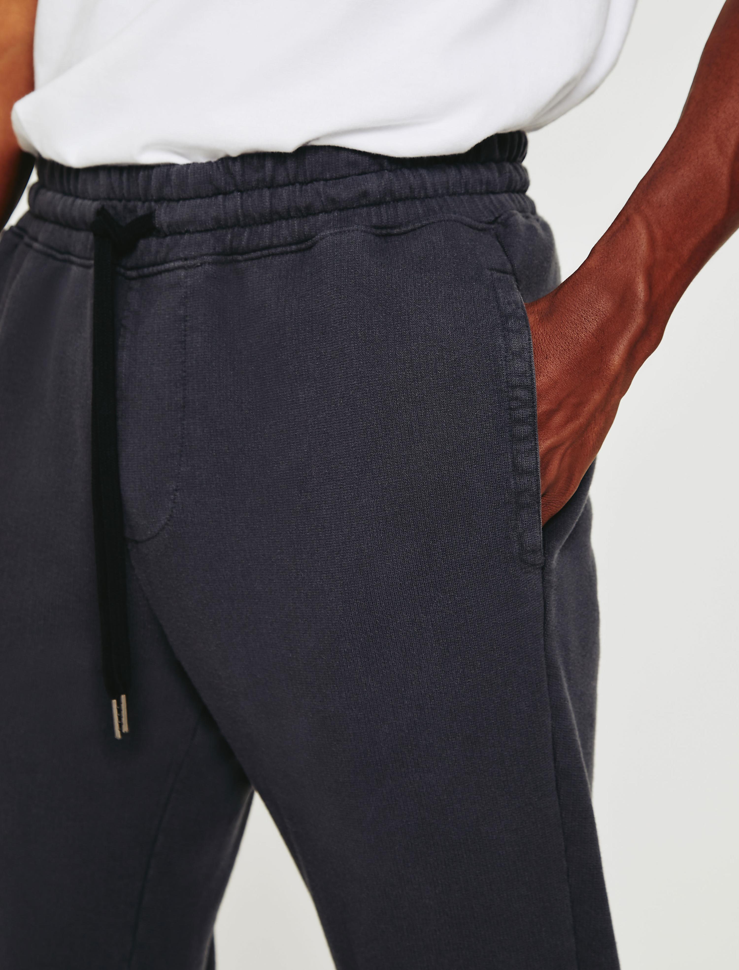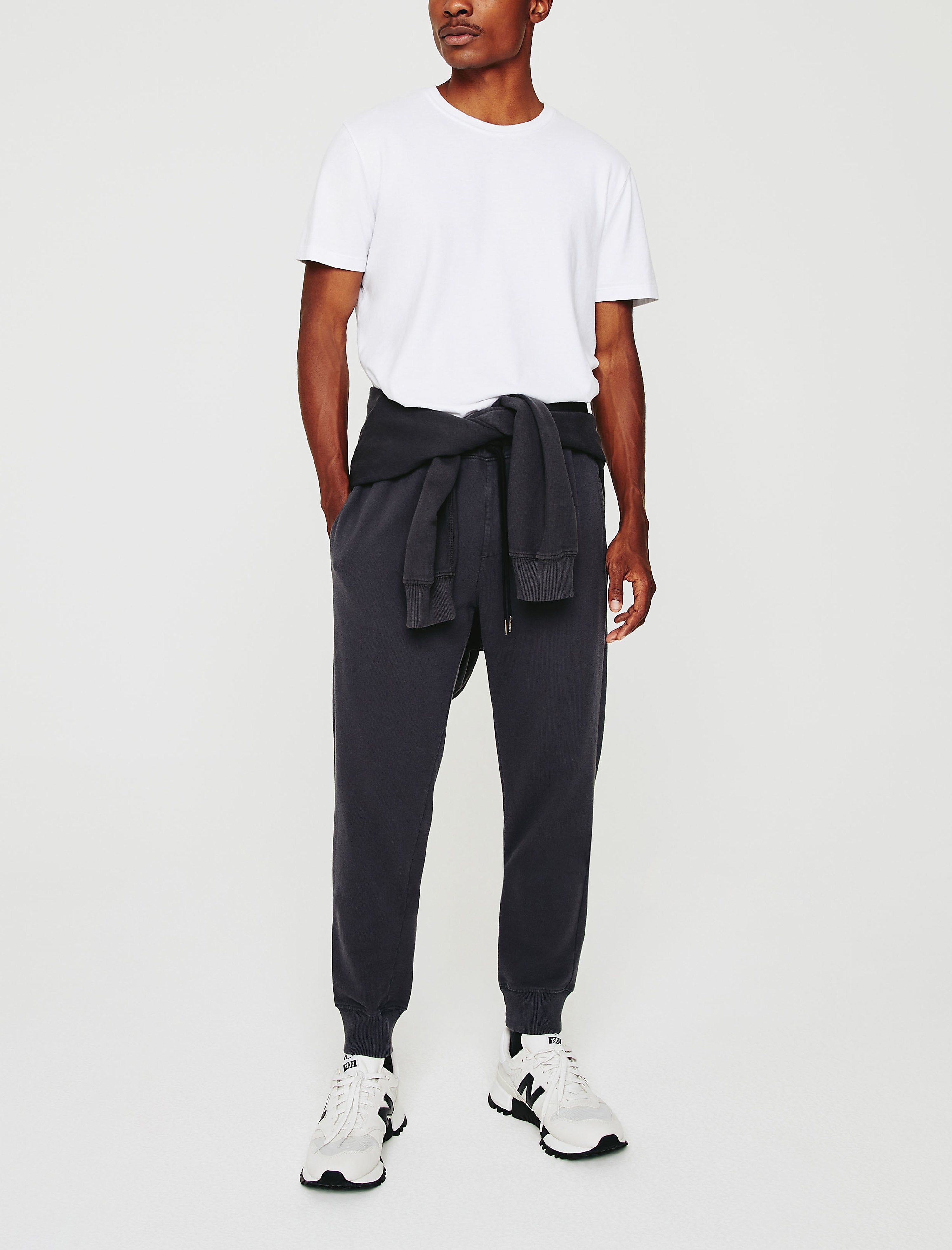 The Kenji Jogger for men features a dark grey hue, slim silhouette, and drawstring waist with ruched construction. Finished with dipped draw ties, subtle bar tacks, gusset paneling, discreet side welt pockets, a single back pocket, and tapered leg openings with an elastic rib cuff. This men's sweatpant is designed in an exclusive AG-made terry featuring a lightweight feel, ultra soft touch, and a color-rich finish. Our Essential Luxe Terry is an AG-exclusive, strengthened with our S&Z twist technique to prevent torquing.