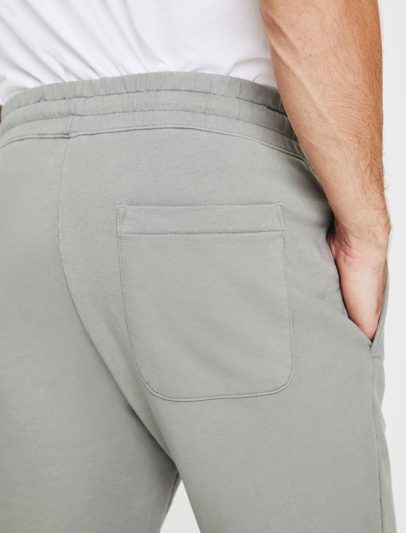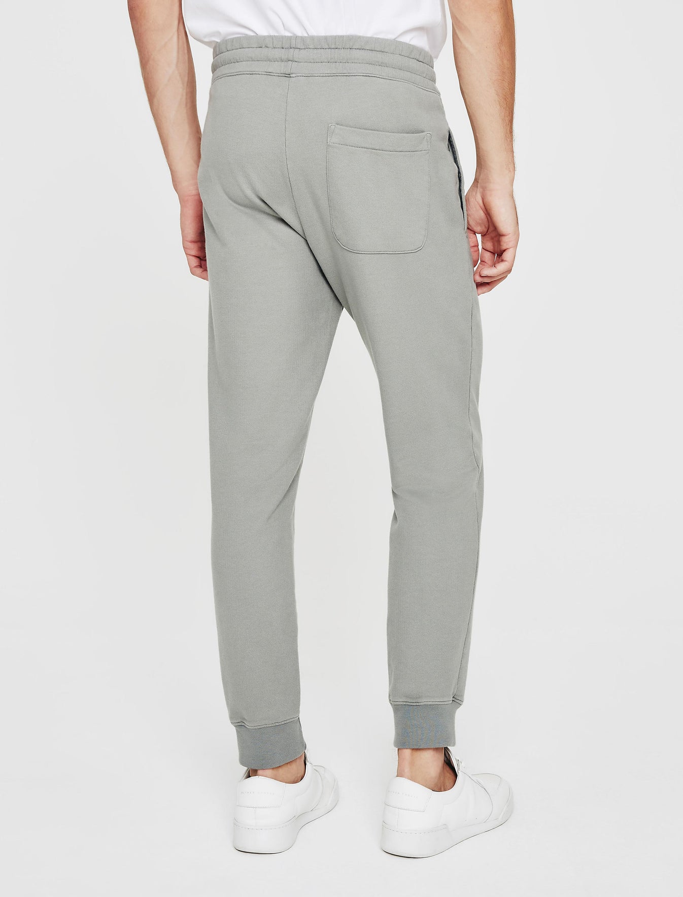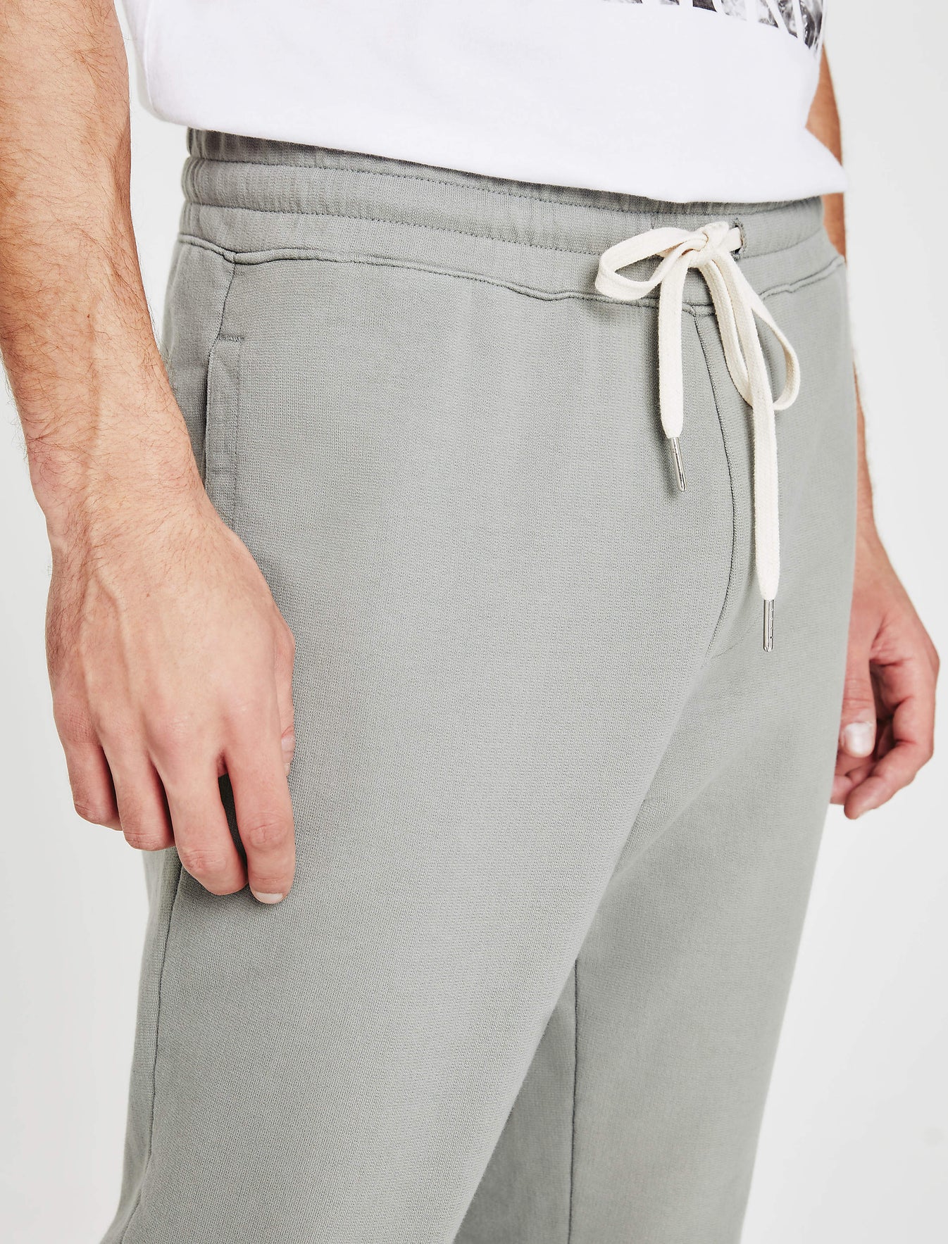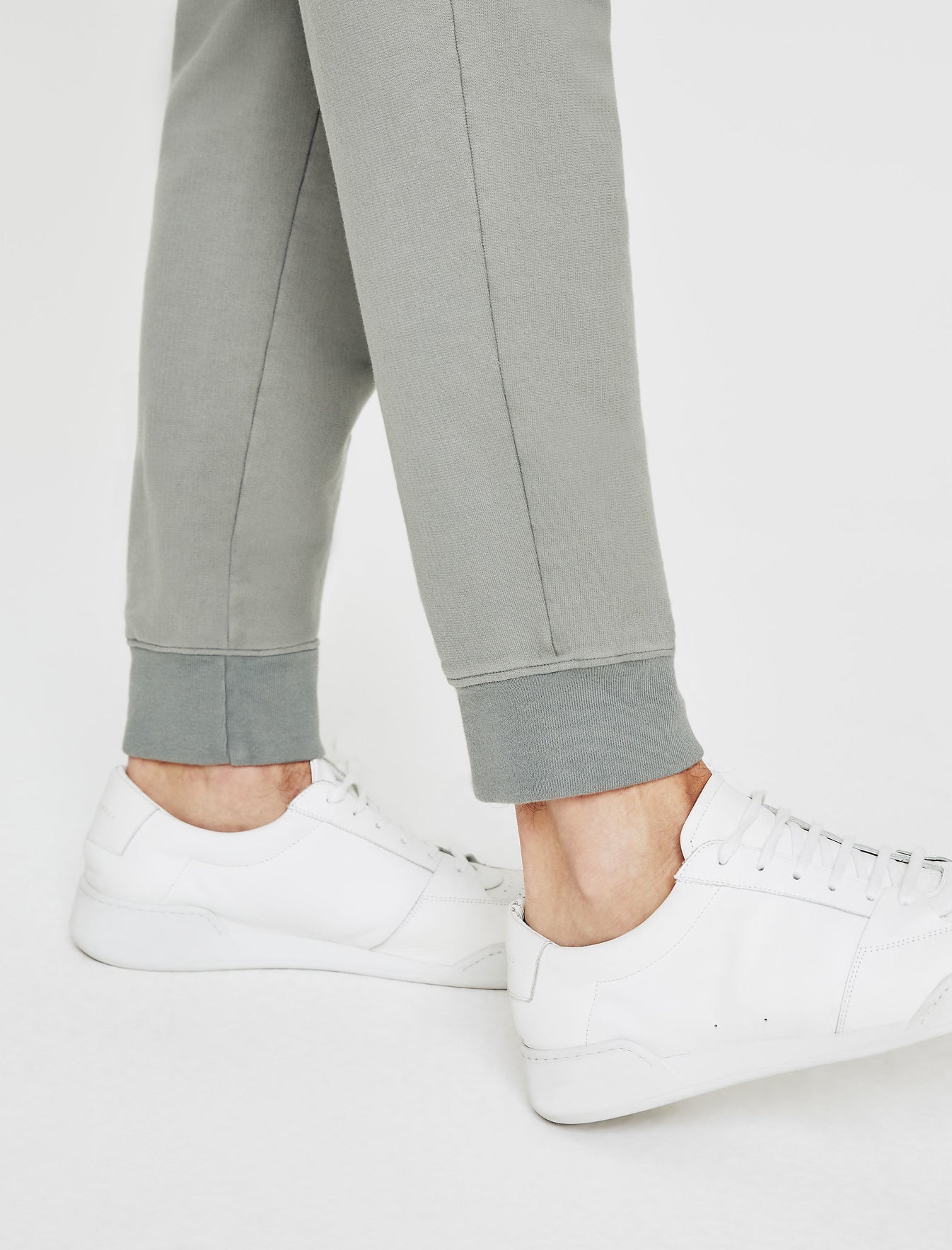 The Kenji Jogger for men features a slim silhouette with a ruched elastic waistband and contrast drawstring cinching. Done in a pale green shade, this men's sweatpant has tapered leg openings with elastic rib cuffs. The pair is designed in AG's exclusive Essential Luxe Terry featuring a lightweight feel, ultra soft touch, and S&Z twist construction to prevent torquing. Detailed with metal-tipped draw ties, subtle bar tacks, gusset paneling, discreet side welt pockets, and a single back pocket.