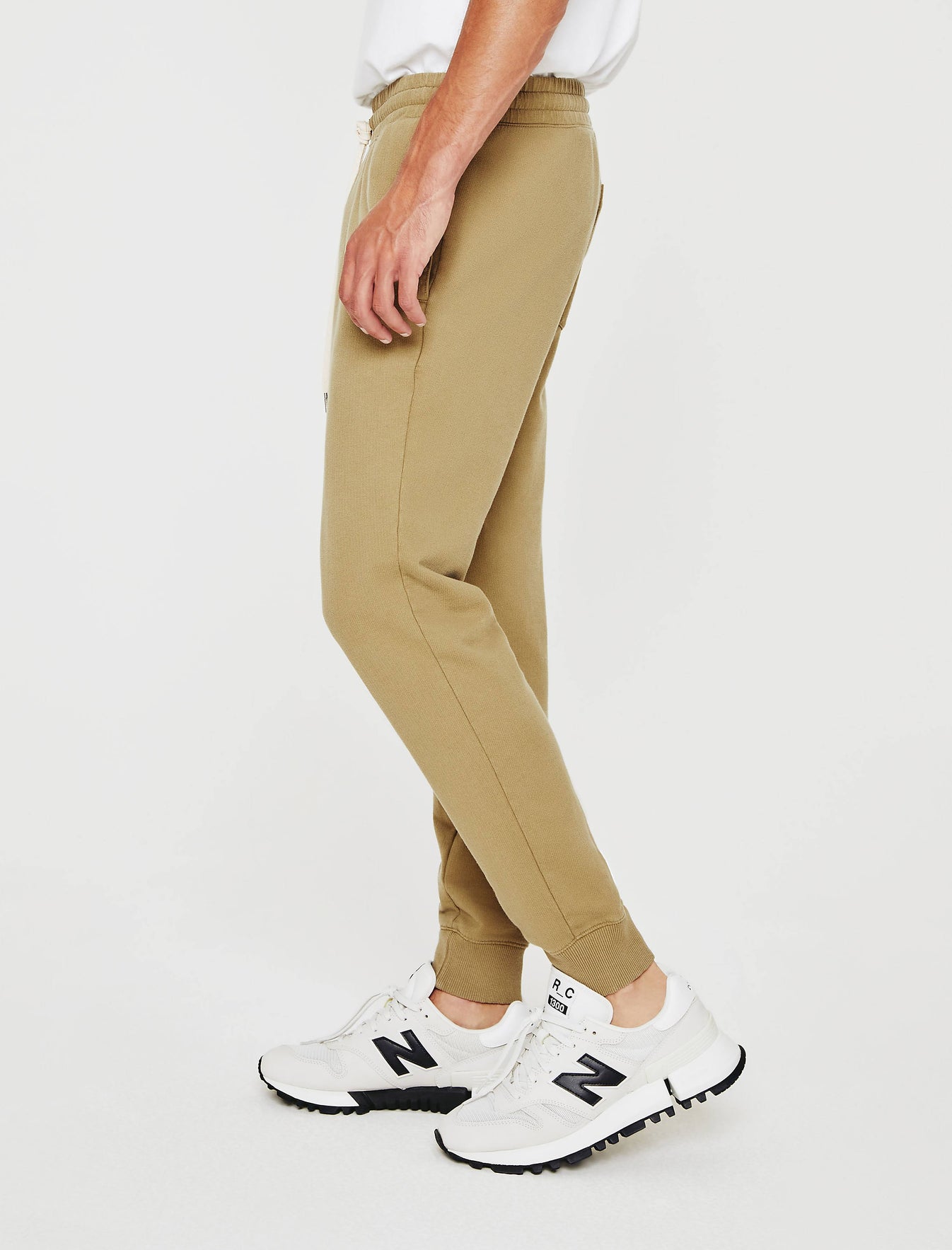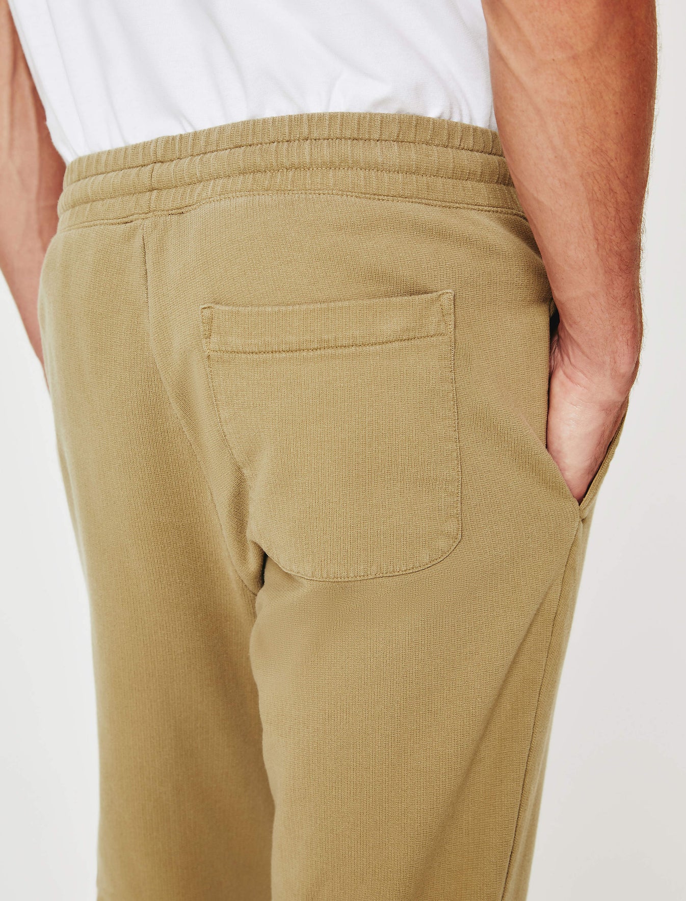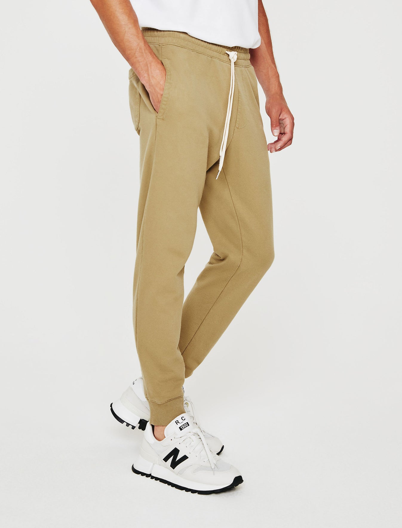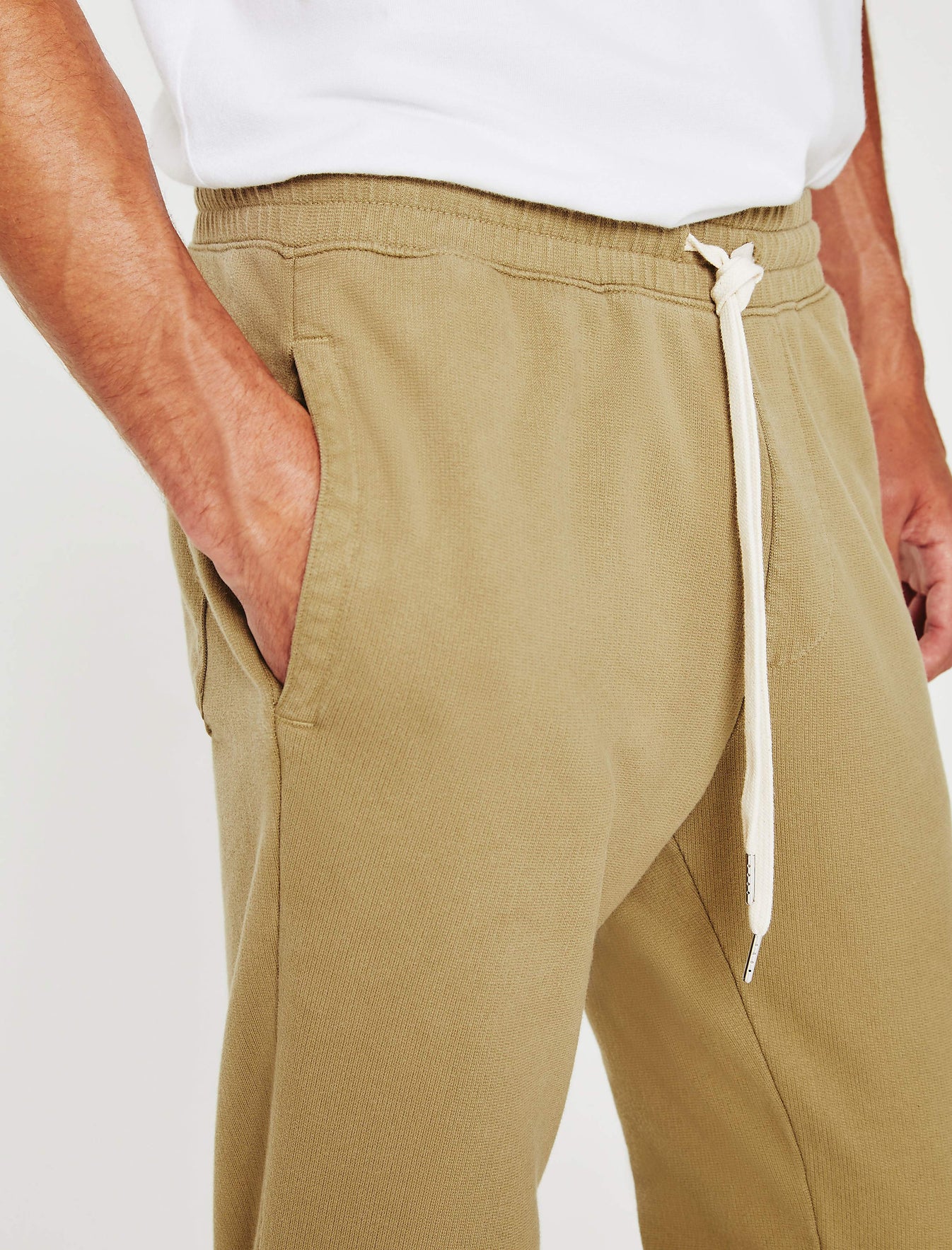 The Kenji Jogger for men features a beige hue, slim silhouette, and drawstring waist with ruched construction. Finished with dipped draw ties, subtle bar tacks, gusset paneling, discreet side welt pockets, a single back pocket, and tapered leg openings with an elastic rib cuff. This men's sweatpant is designed in an exclusive AG-made terry featuring a lightweight feel, ultra soft touch, and a color-rich finish. Our Essential Luxe Terry is an AG-exclusive, strengthened with our S&Z twist technique to prevent torquing.