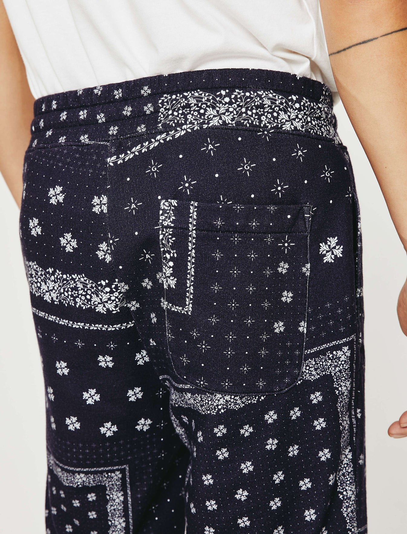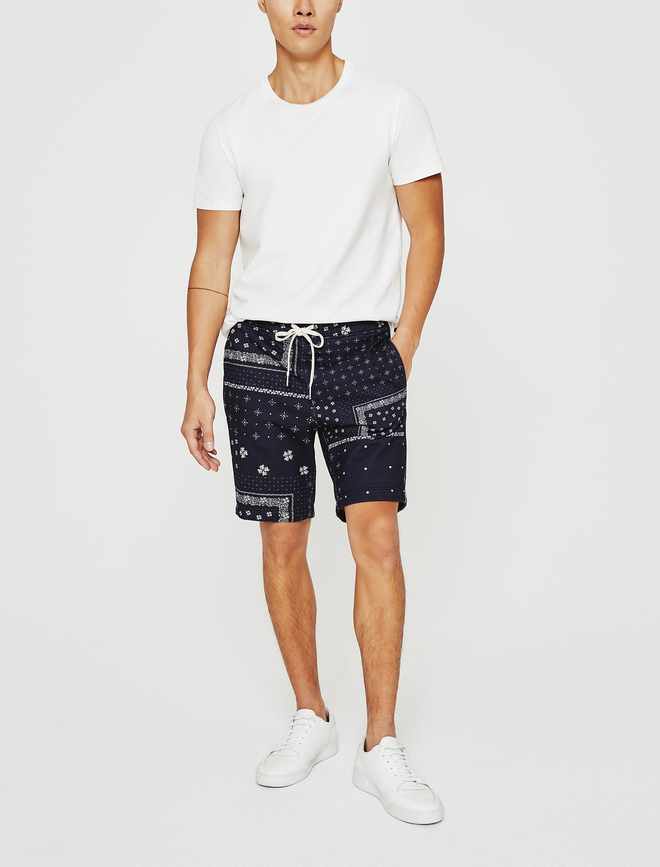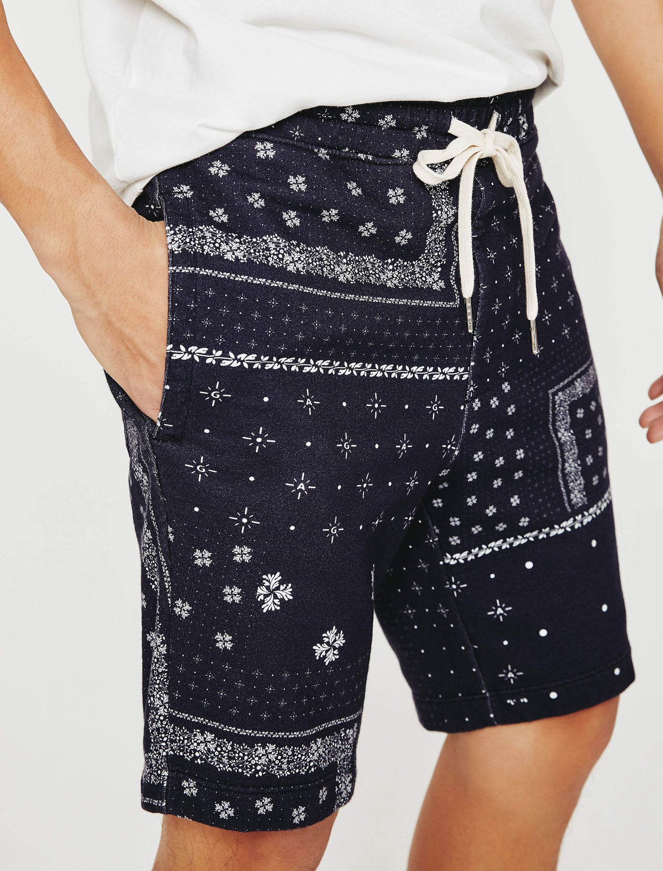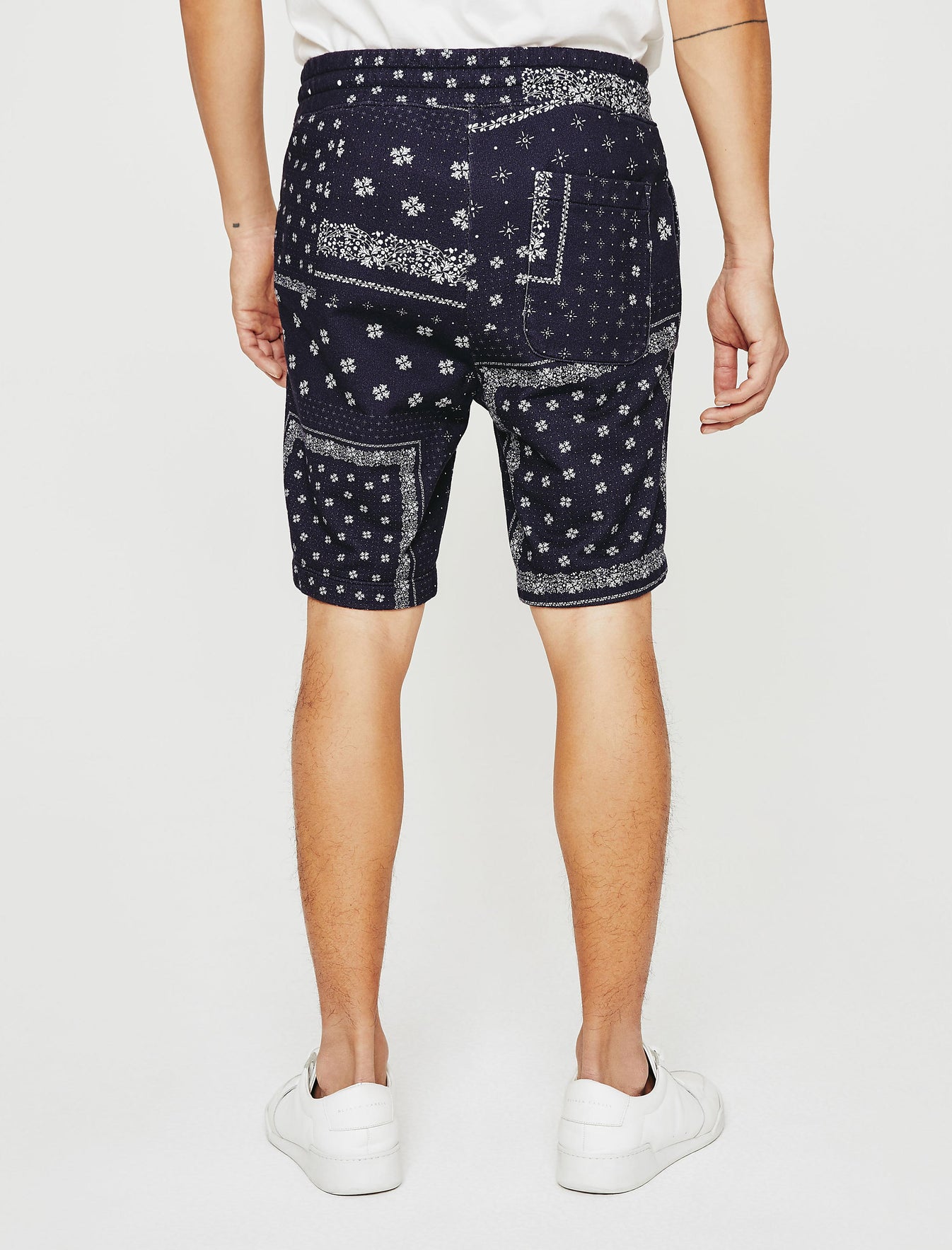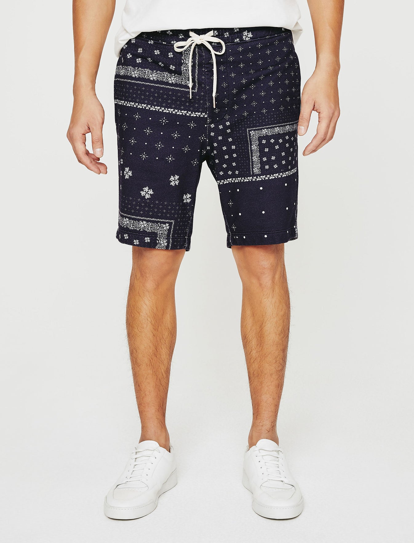 Our Kenji Sweatshort for men features our lightweight and ultra-soft Essential Luxe Terry in an allover bandana print. The style has a slim silhouette with a ruched elastic waistband and a contrast drawstring with metal-tipped ends. This men's sweatshort is detailed with subtle bar tacks, gusset paneling, discreet side welt pockets, and a single back pocket.