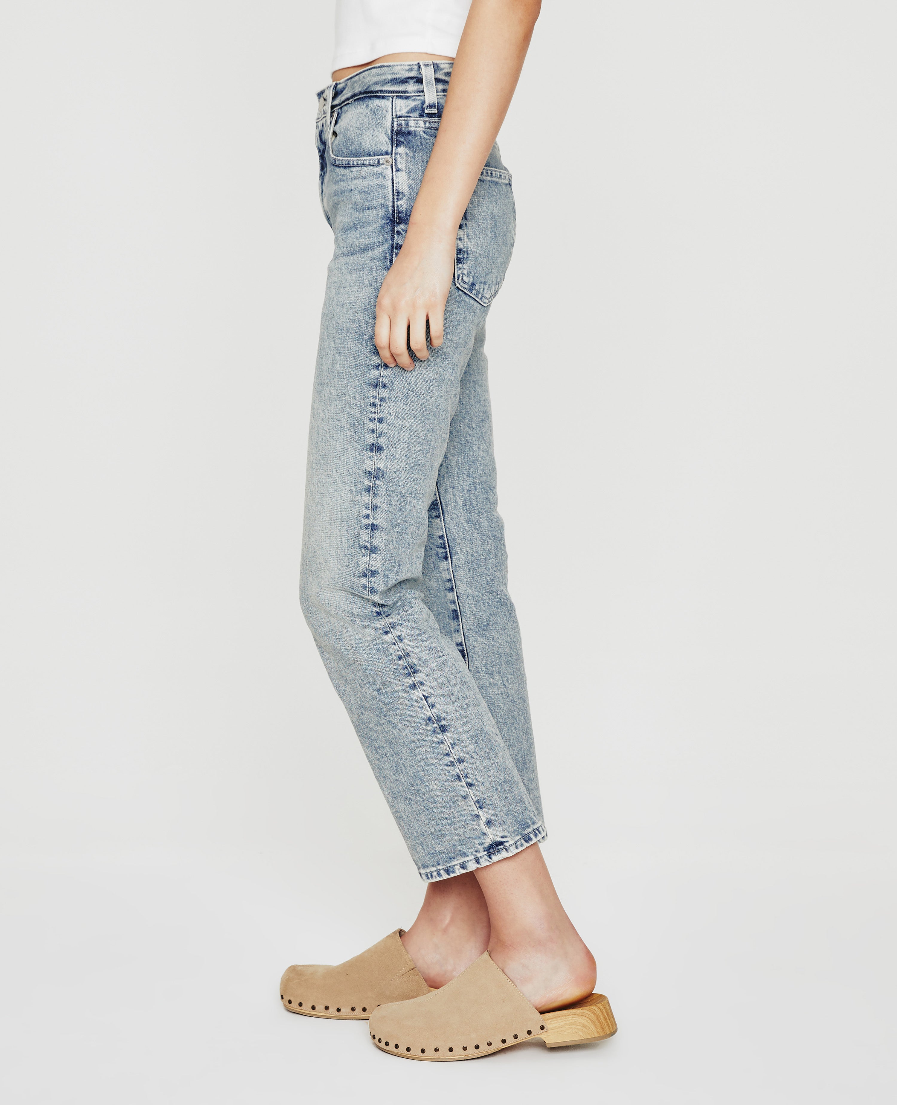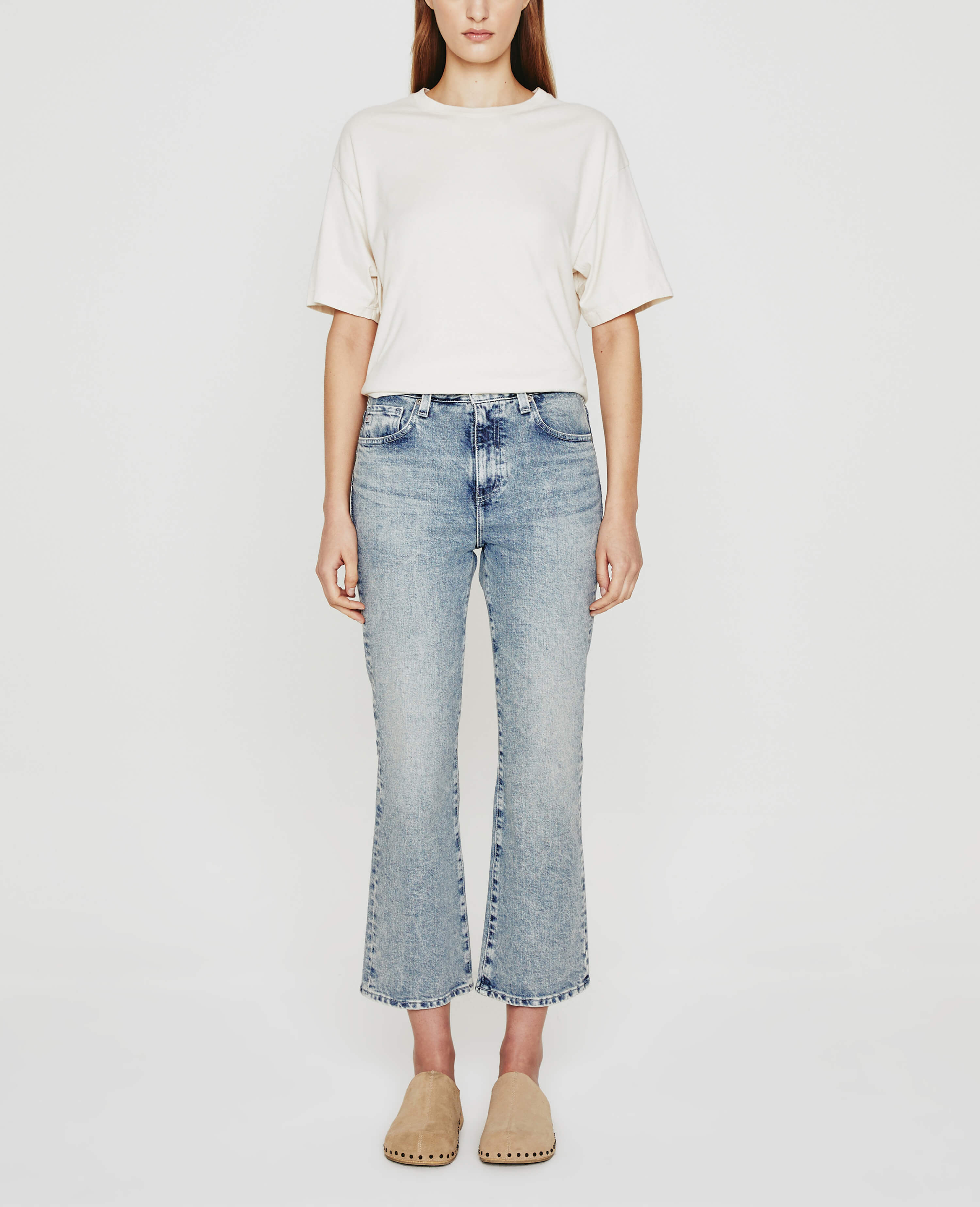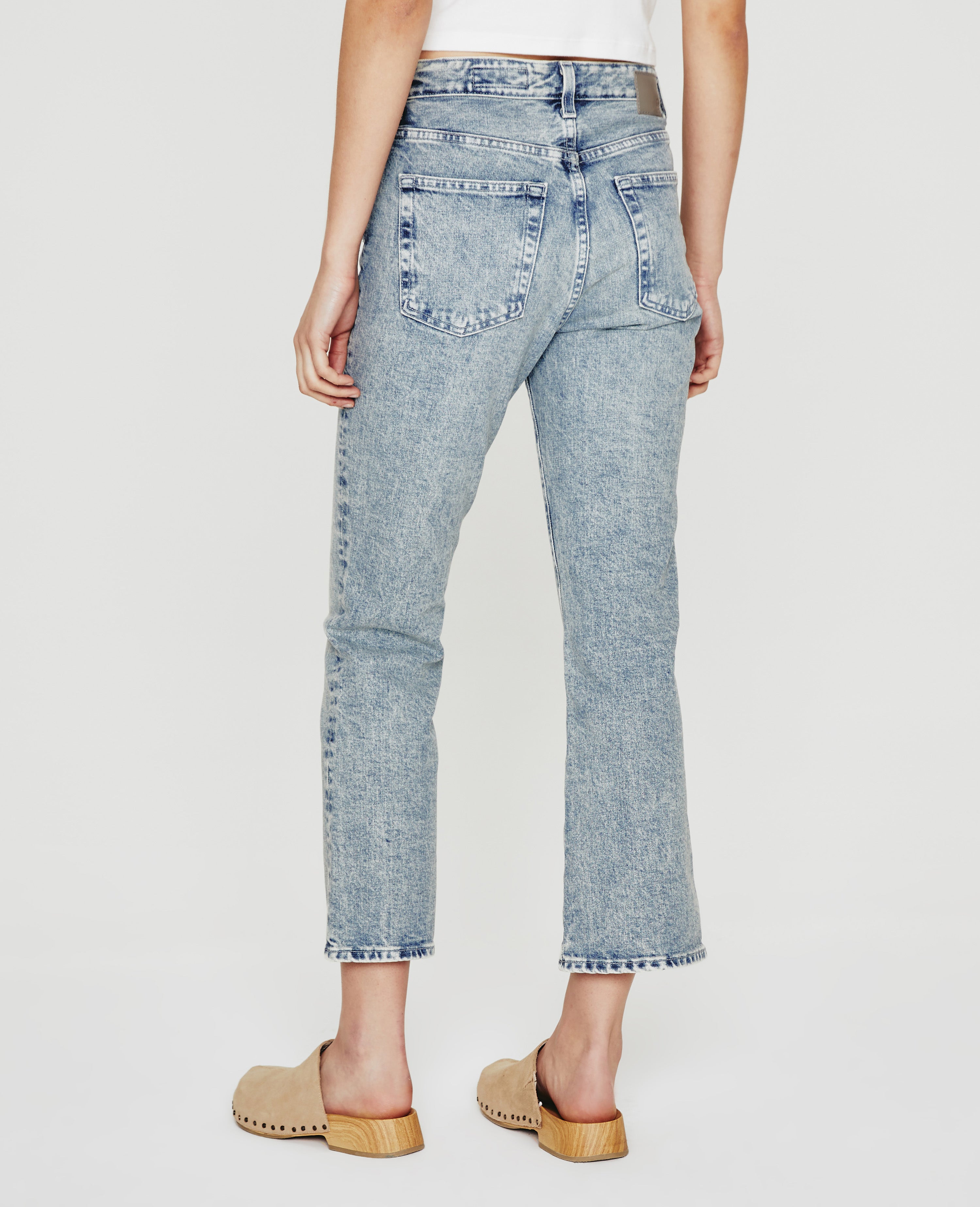 Kinsley is our high-rise pop crop jean with subtly flared cropped hems. This pair features 11 oz. 360° Denim with vintage bi-stretch construction and a light moonwash. It's got lots of highs and lows in the indigo, adding contrast along the seams and edges.