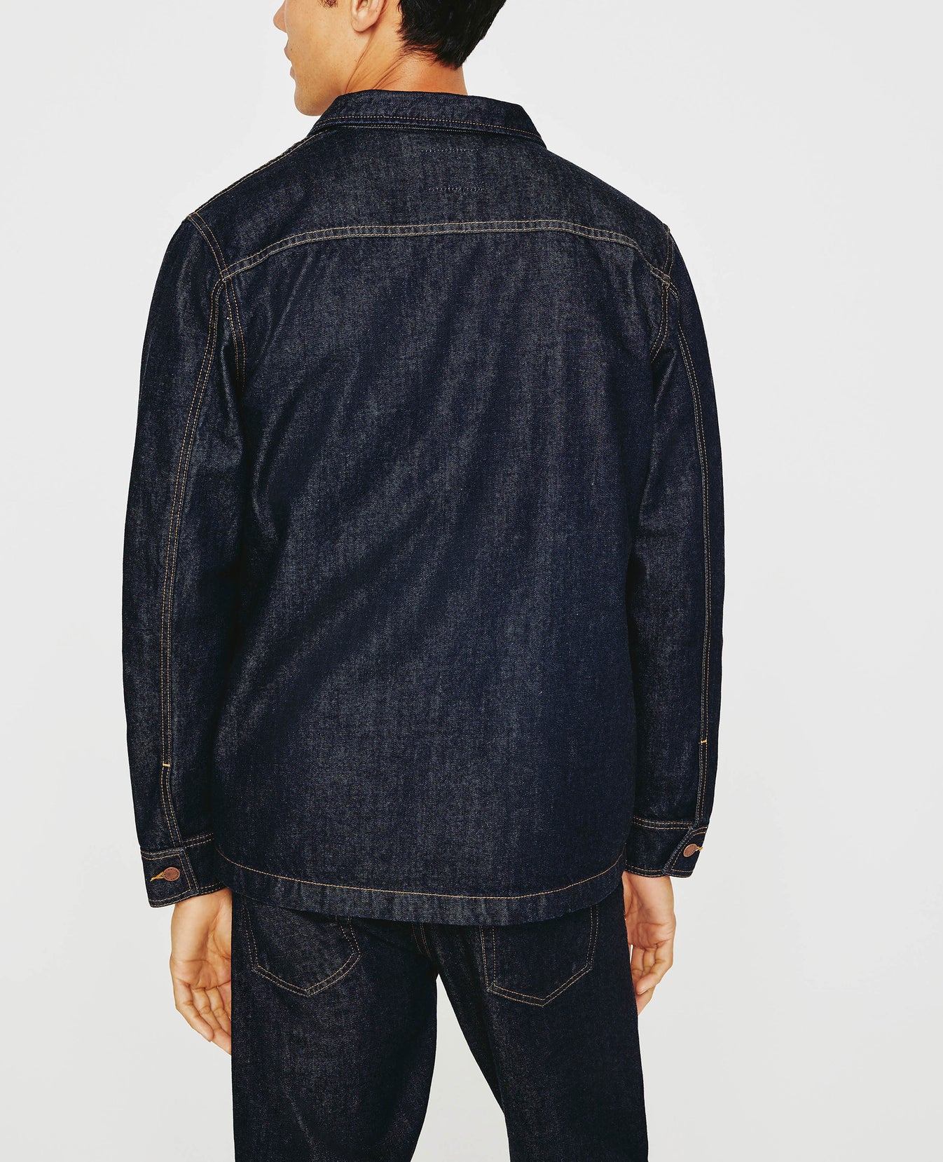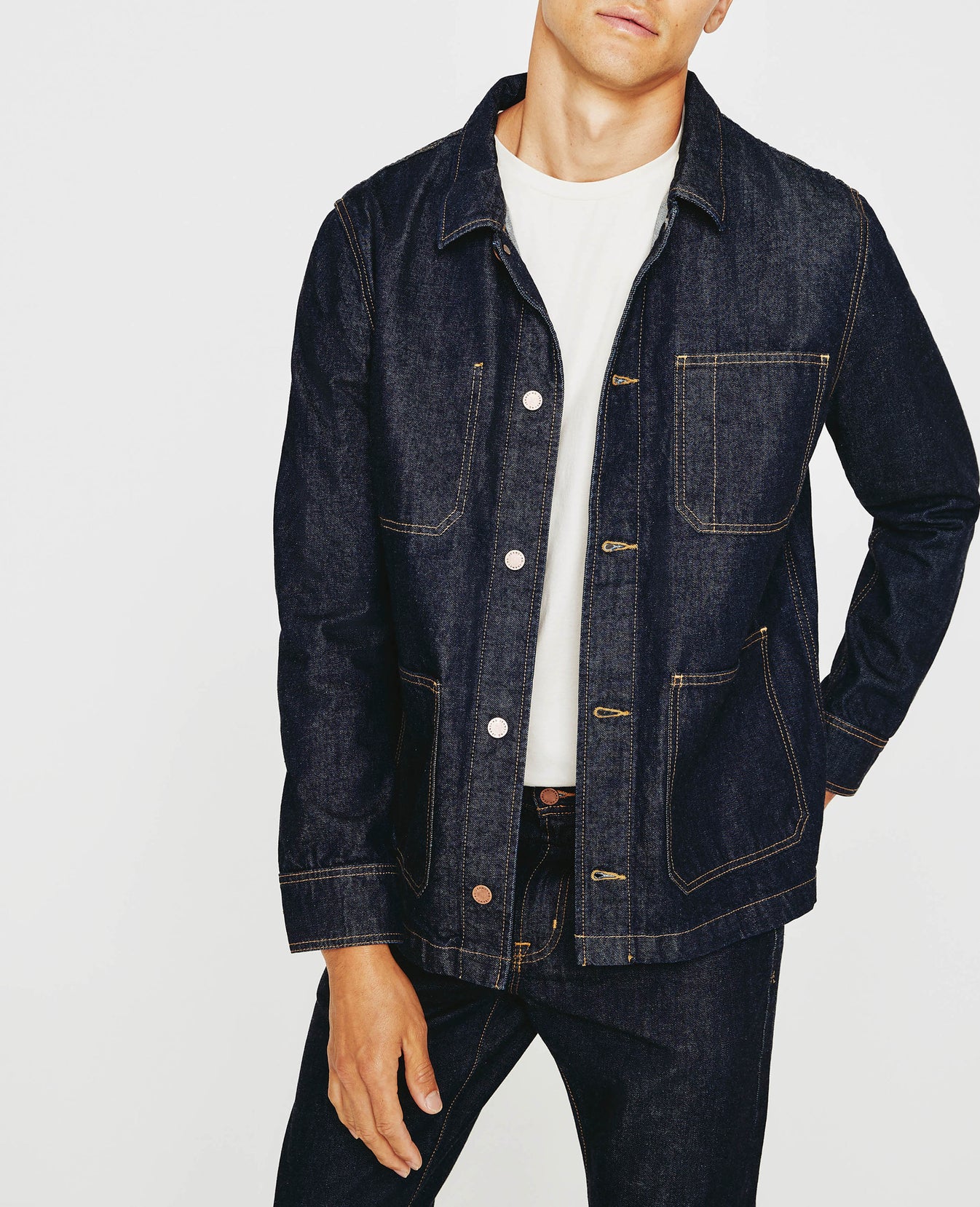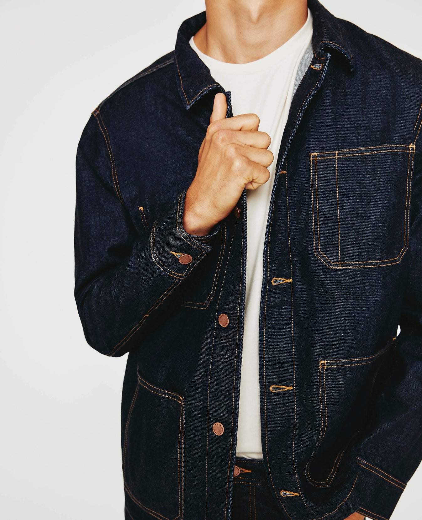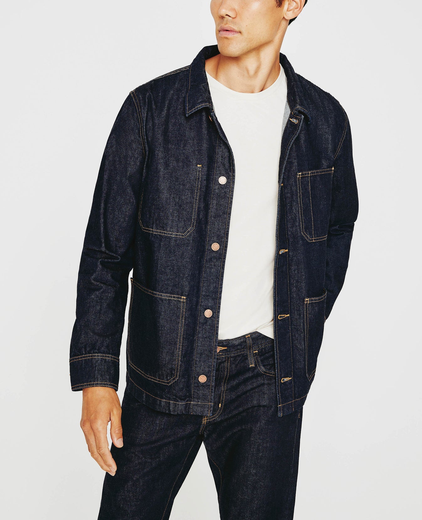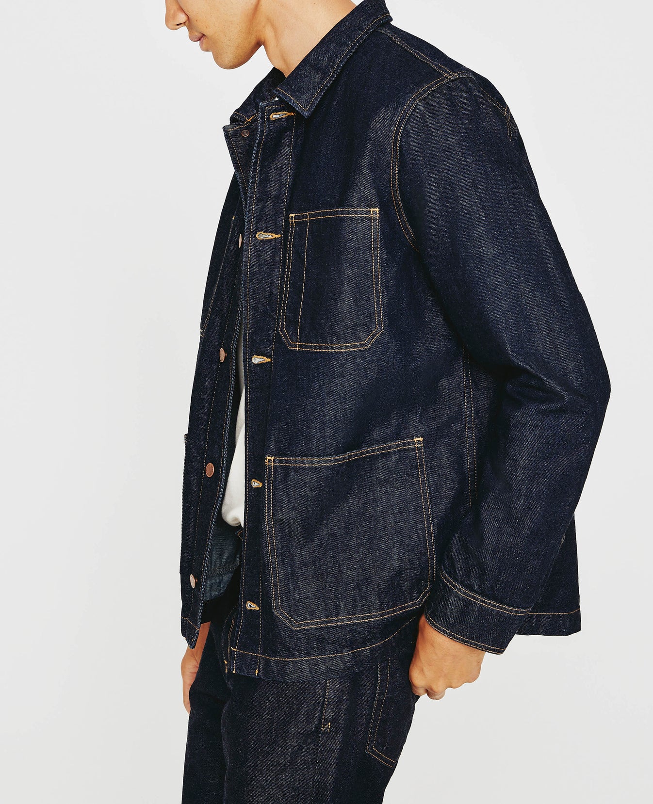 Our Kirin Chore Jacket appears in a dark denim wash with a resin rinse for a sophisticated finish. The jacket is designed in 11.75 oz. Legion Denim for a workwear jacket that wears durability well. Our Kirin Chore Jacket finesses a modern utility construction with multi-patch pockets.