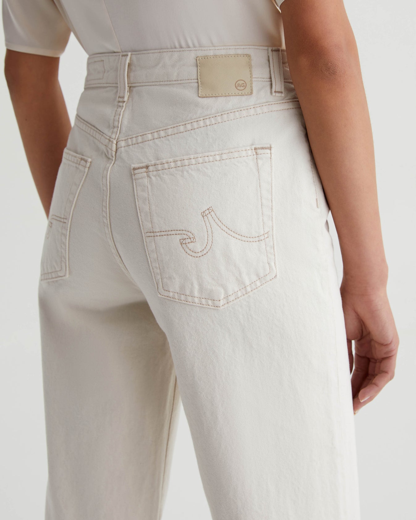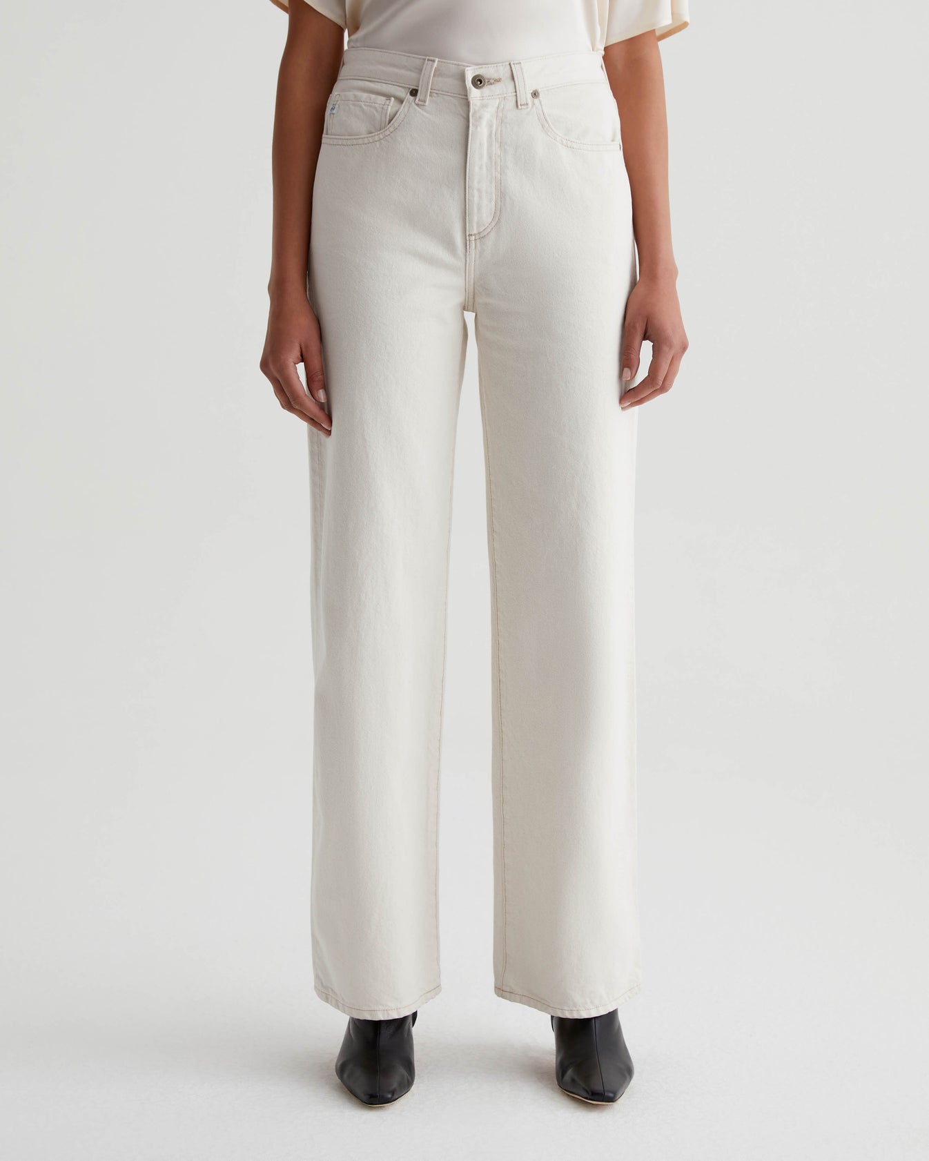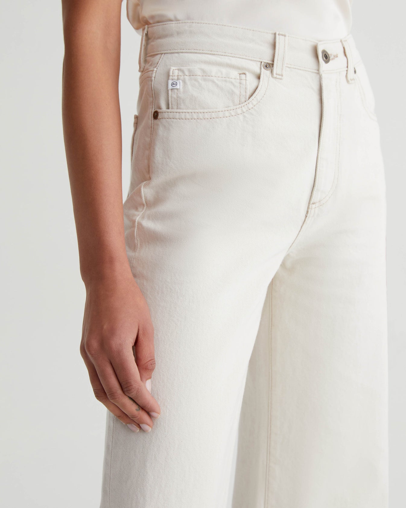 Our Kora jeans feature an ultra-high waist and a roomy wide-leg silhouette. This pair is cut from 100% cotton Natural Bull Denim in warm off-white. Tonal stitching adds subtle contrast, highlighting the classic five-pocket design.