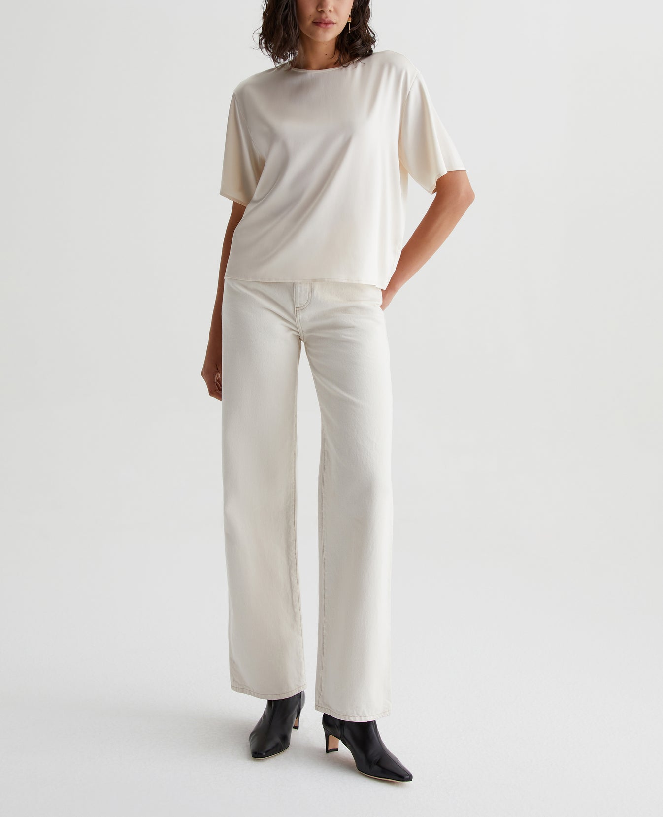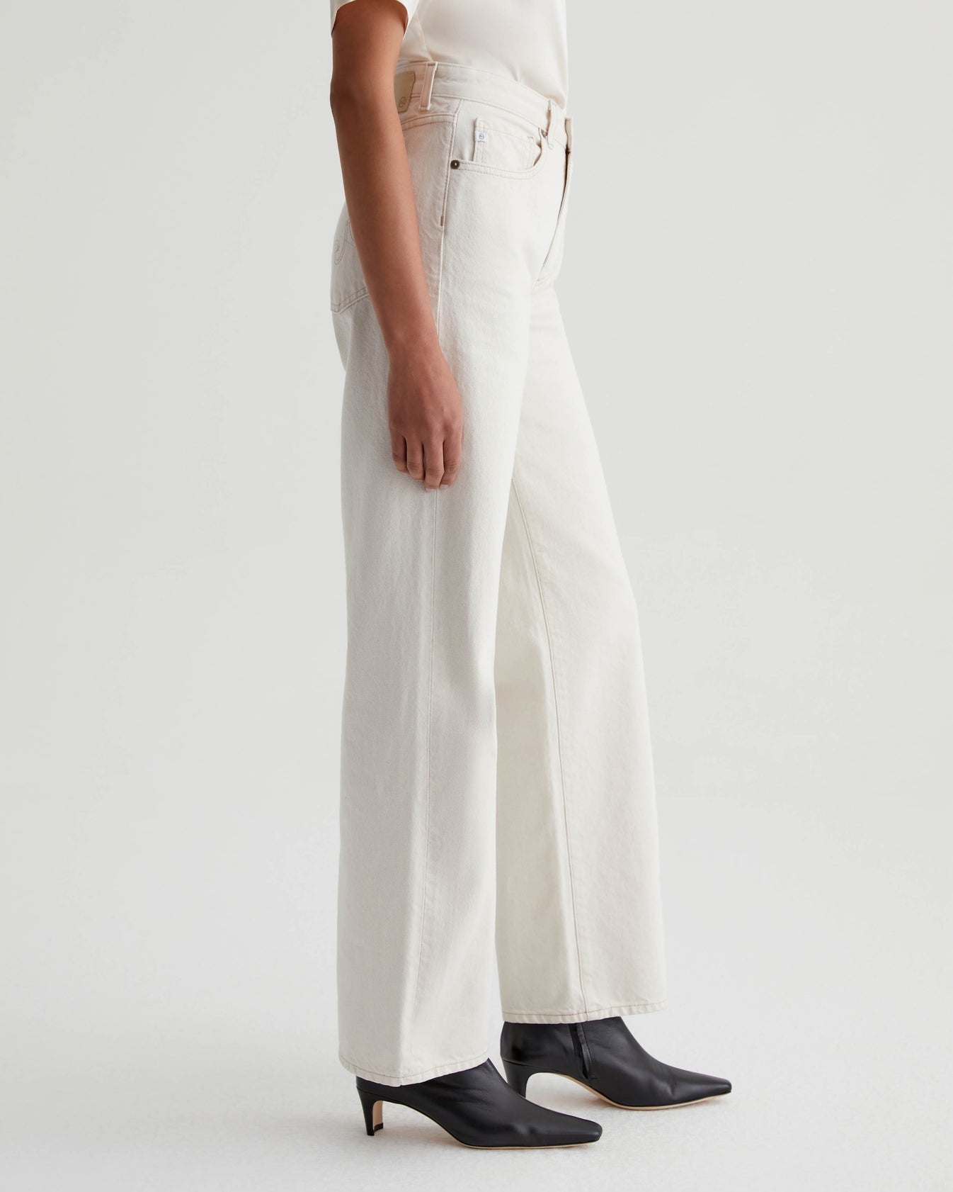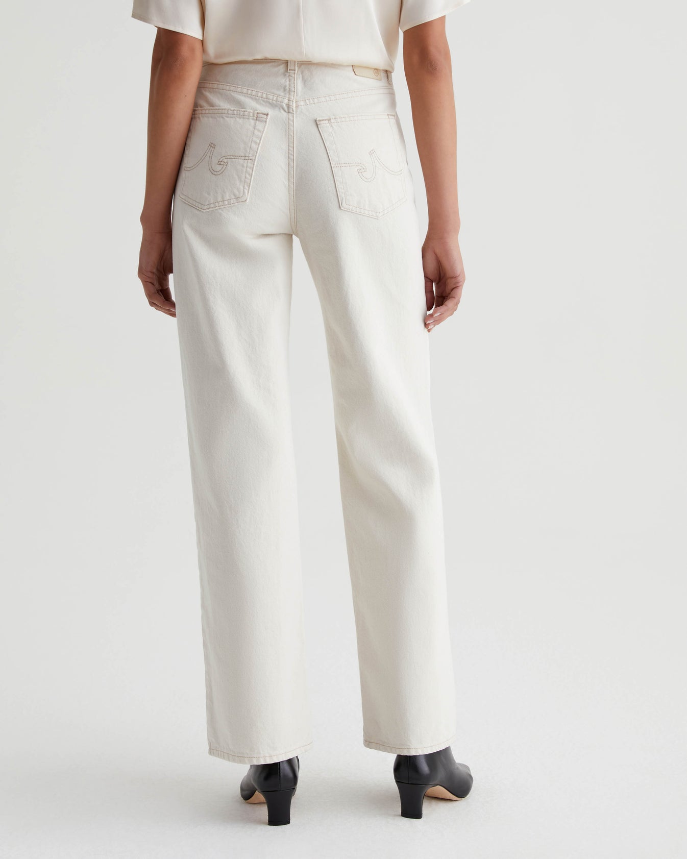 Our Kora jeans feature an ultra-high waist and a roomy wide-leg silhouette. This pair is cut from 100% cotton Natural Bull Denim in warm off-white. Tonal stitching adds subtle contrast, highlighting the classic five-pocket design.
