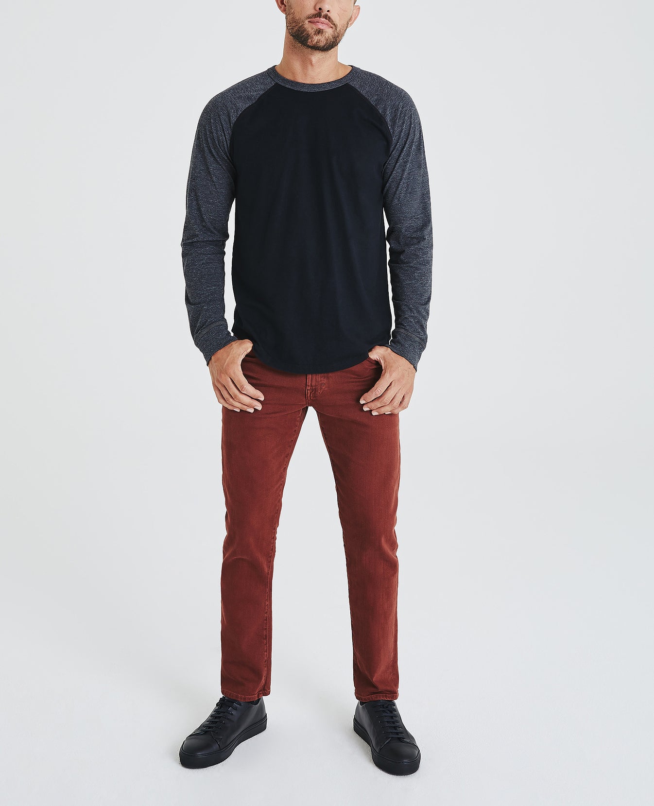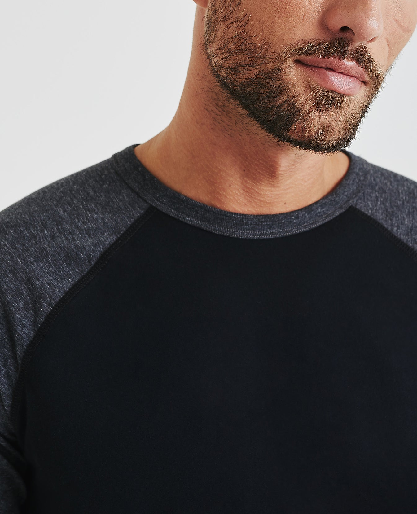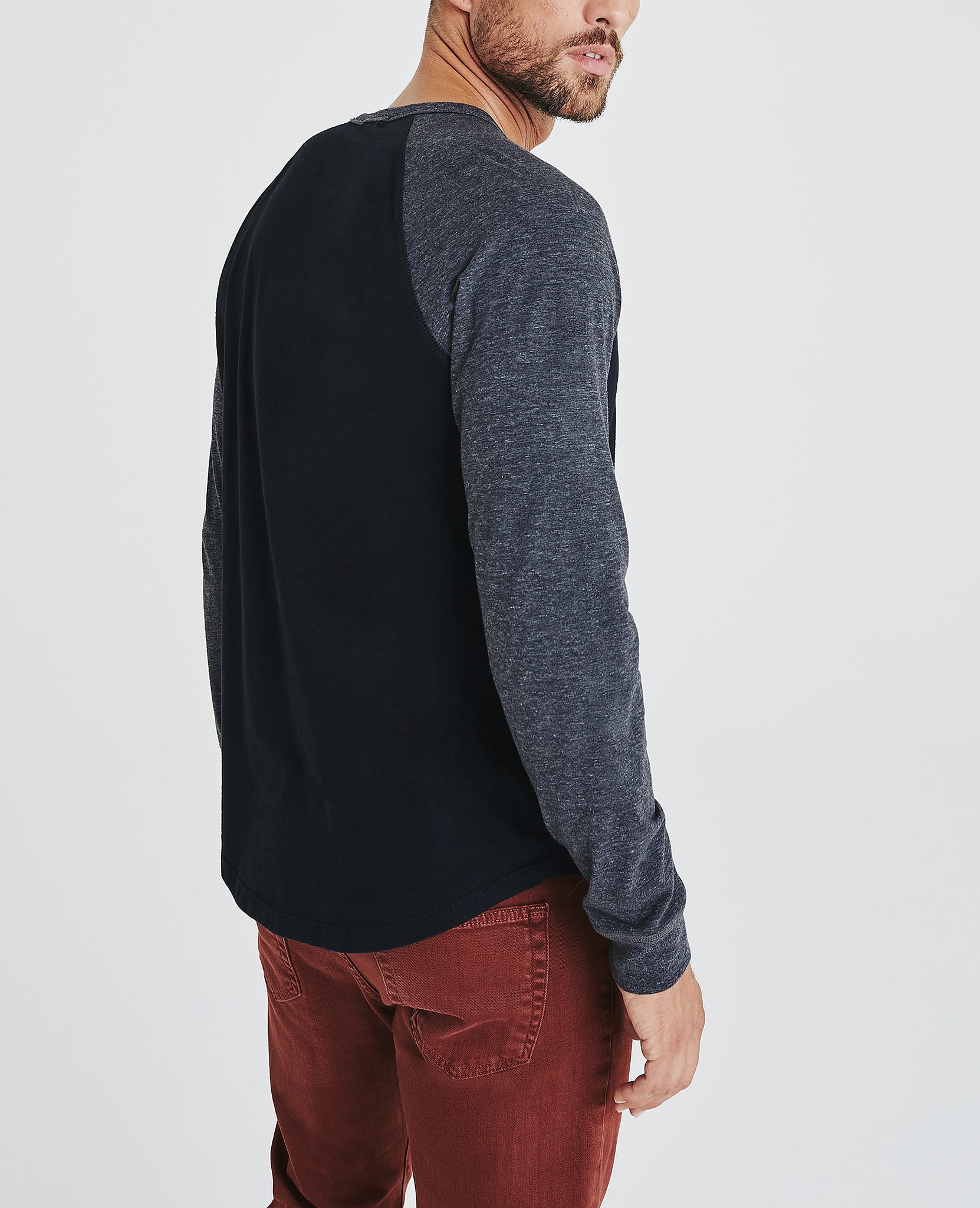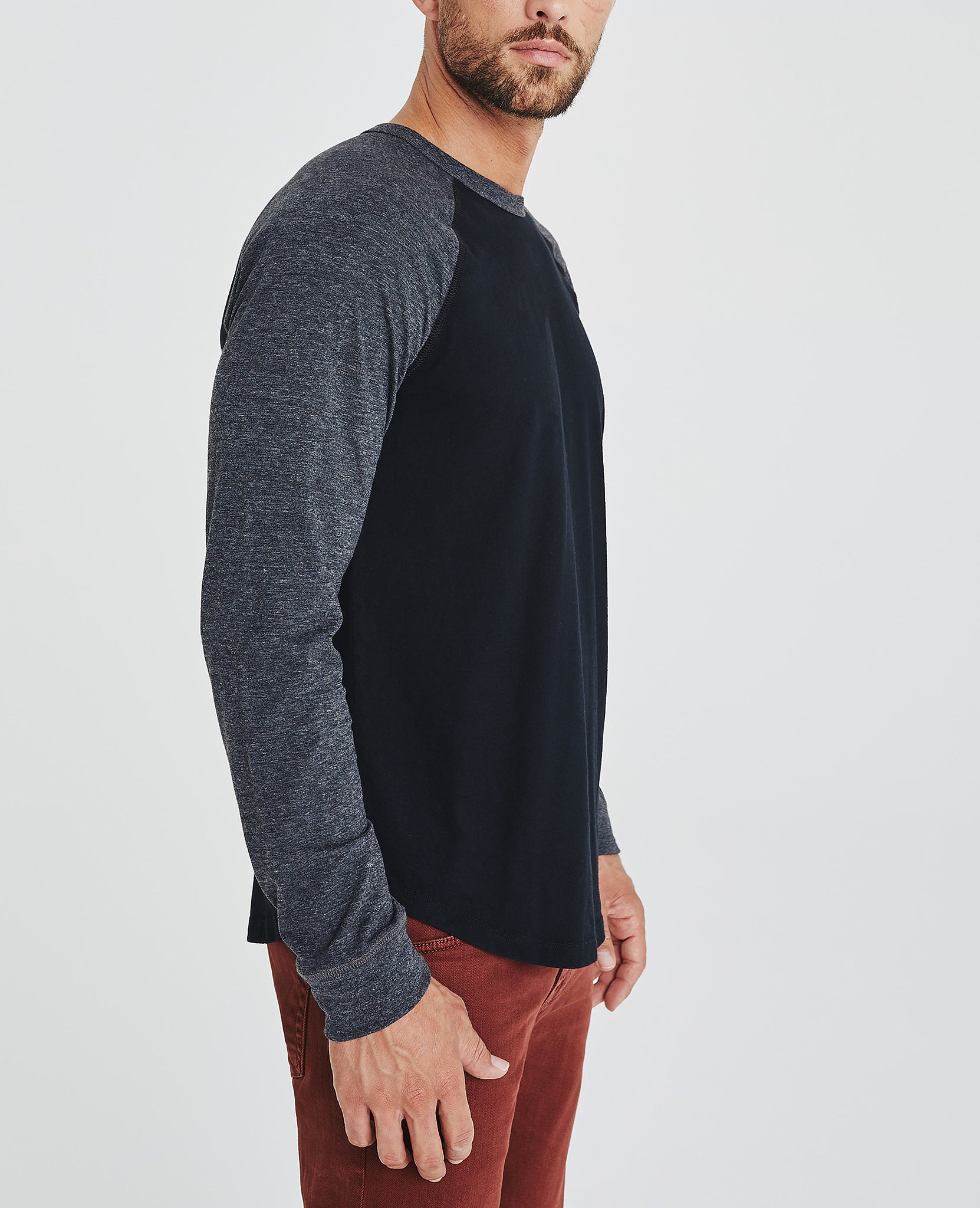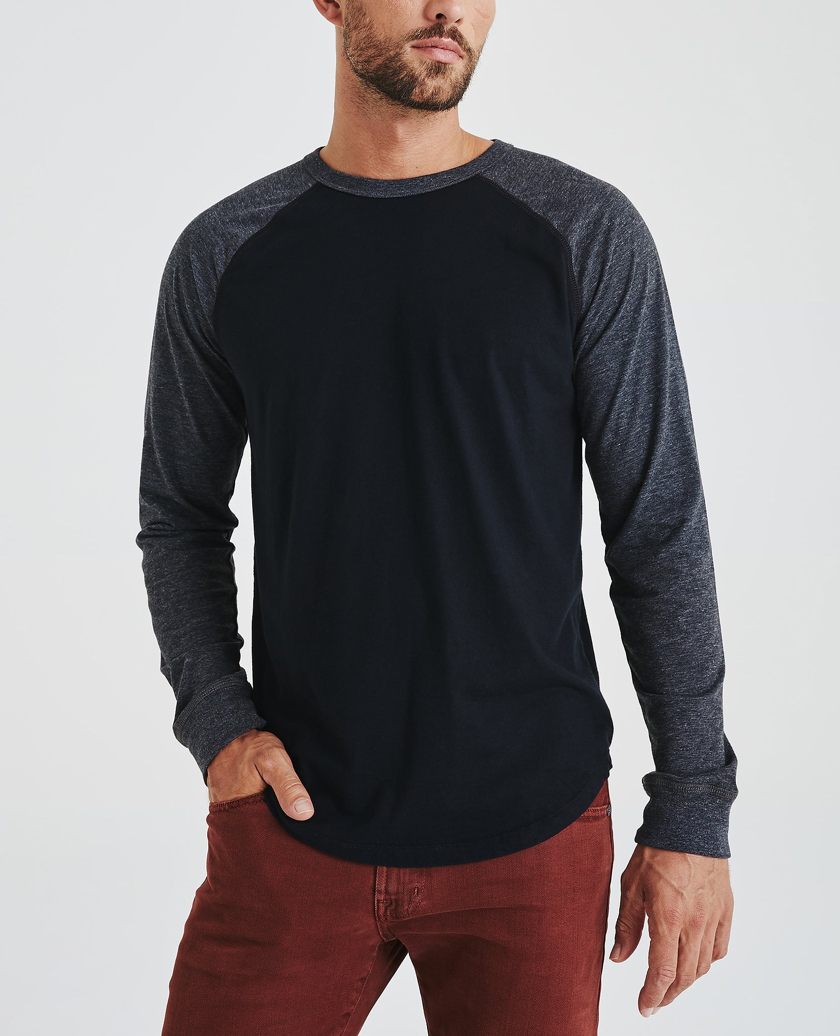 Liam Raglan Crew Neck Shirt for men features a versatile black and hear grey colorblocking cut in a classic, relaxed fit and curved hem. This men's long sleeve is designed in a lightweight, wrinkle-resistant jersey fabric made with pima cotton, a well-worn vintage feel, and an easy, relaxed fit.