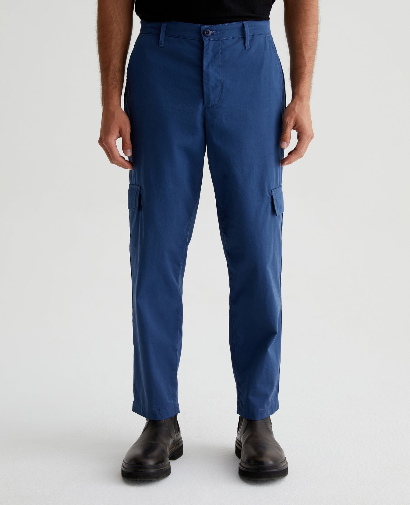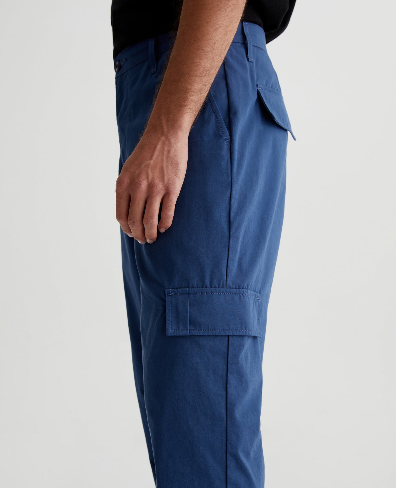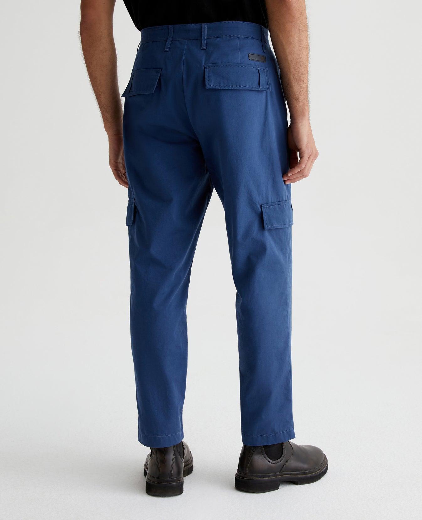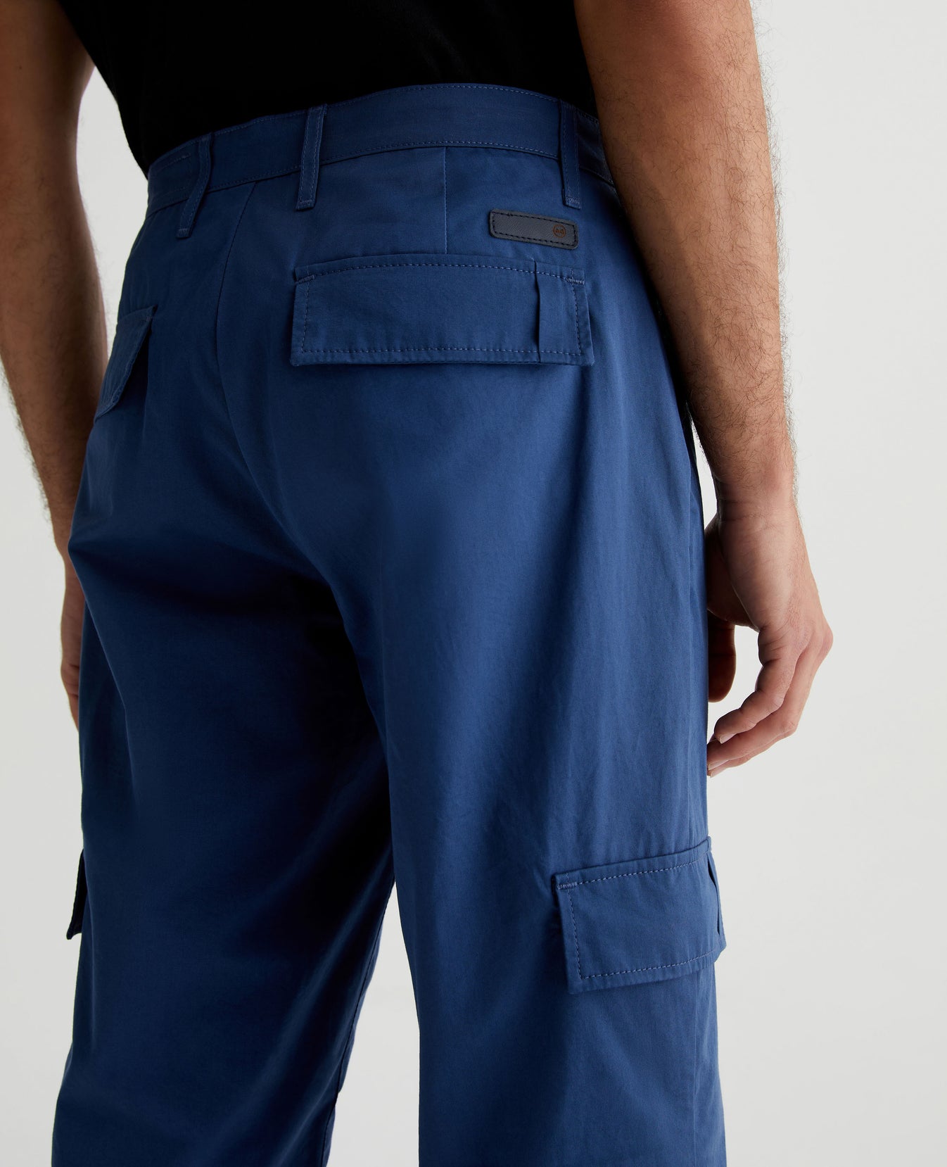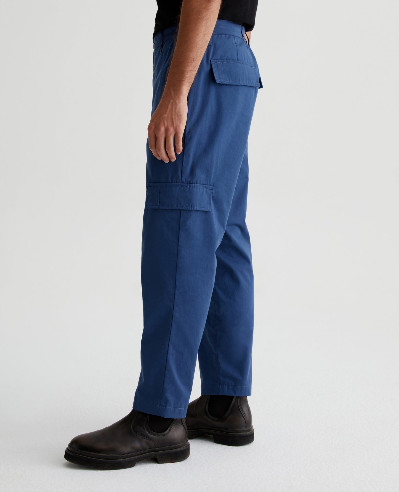 The Lochlan Cargo trouser offers a modern take on classic workwear style in deep-blue cotton poplin. It's got tailored elements and utility details, complete with flap pockets at the legs and seat. Perfect for athletic frames and guys who want some ease in the fit, this slightly cropped pair is cut for a relaxed straight silhouette with more room through the thigh, knee, and calf.