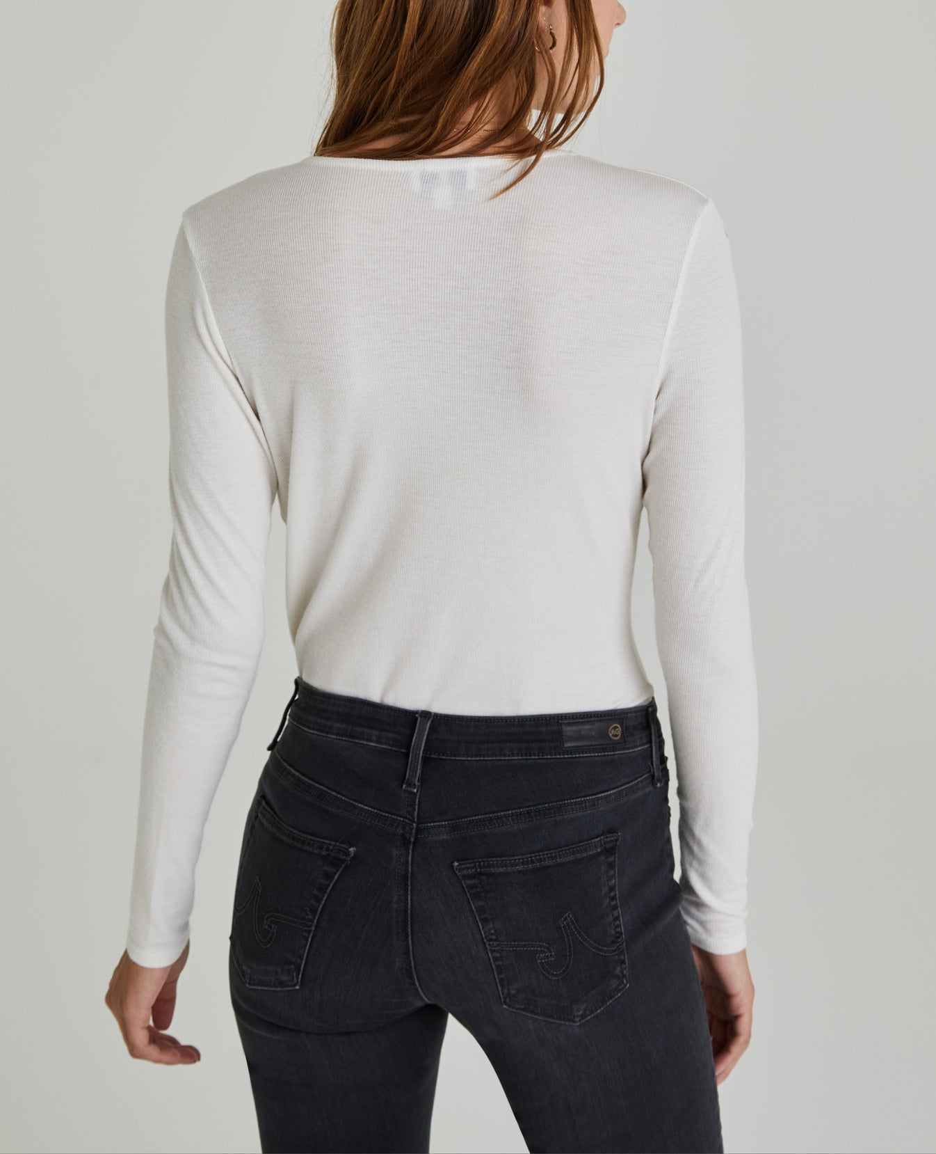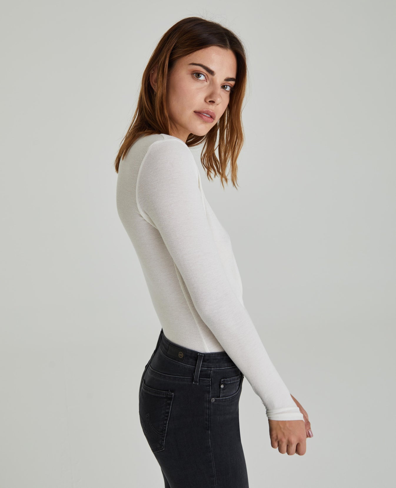 The Lola Bodysuit for women features a vintage off-white hue, wrap around silhouette, deep V-neck, long sleeves, and snap closure. The Lola is designed in a micro lyocell rib fabrication, offering comfort and luxury in a wider rib construction.