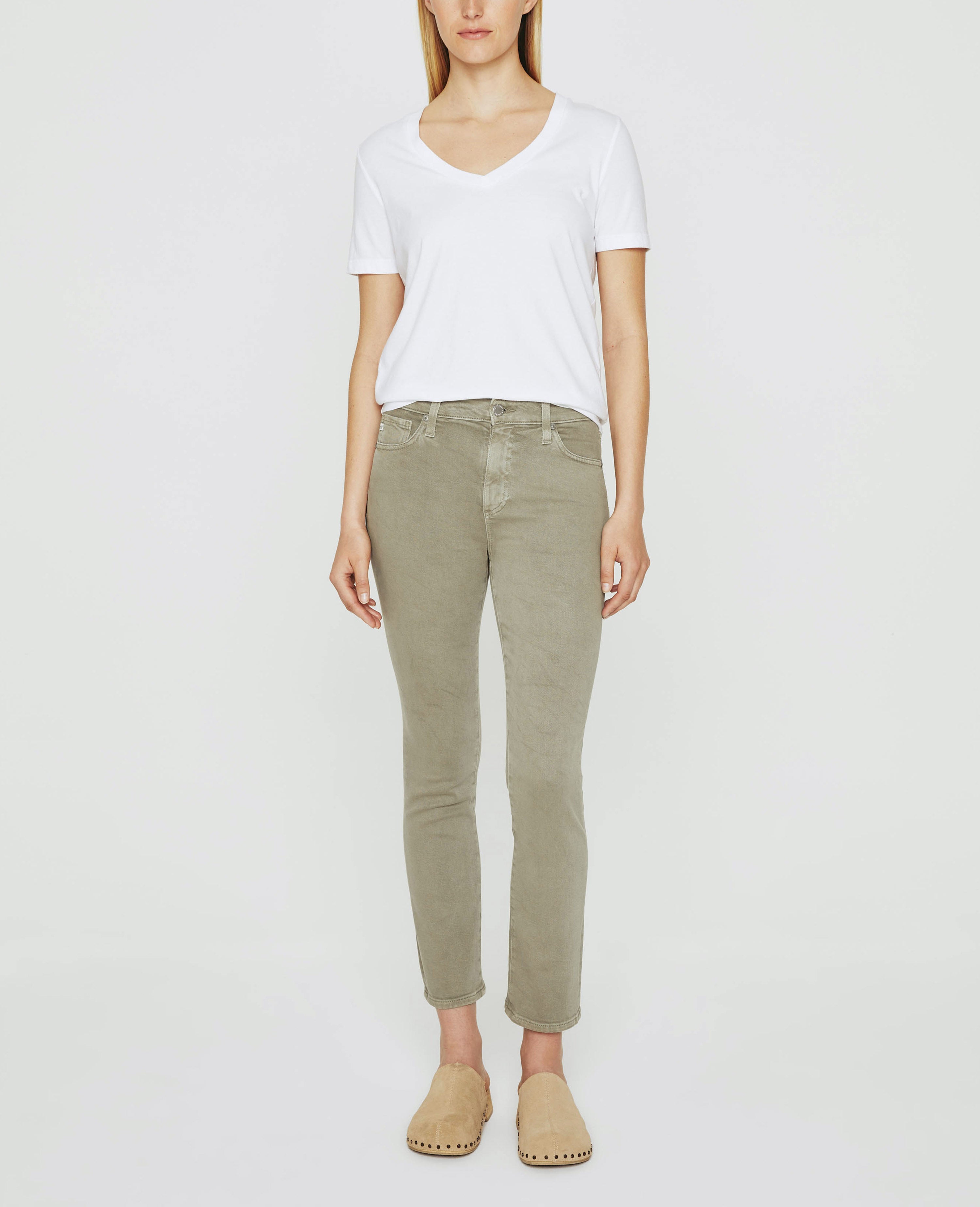The Mari Crop is a mid-rise straight leg jean for women, updated in a cropped length and a subdued green color. The style has a flattering mid-rise waist and fits easy around the hips with a straight leg and slim leg opening. Made from our exclusive AG Cloud Soft Denim™, this women’s mid-rise jean is designed in 8.7 oz. Hyper Soft Bull Denim, AG's special left-hand twill fabric that allows the yarns to gently relax and untwist for a luxe, supple feel. It's designed to get even softer the more you wear it. Dual-elastic stretch offers extra comfort and a resilient shape.