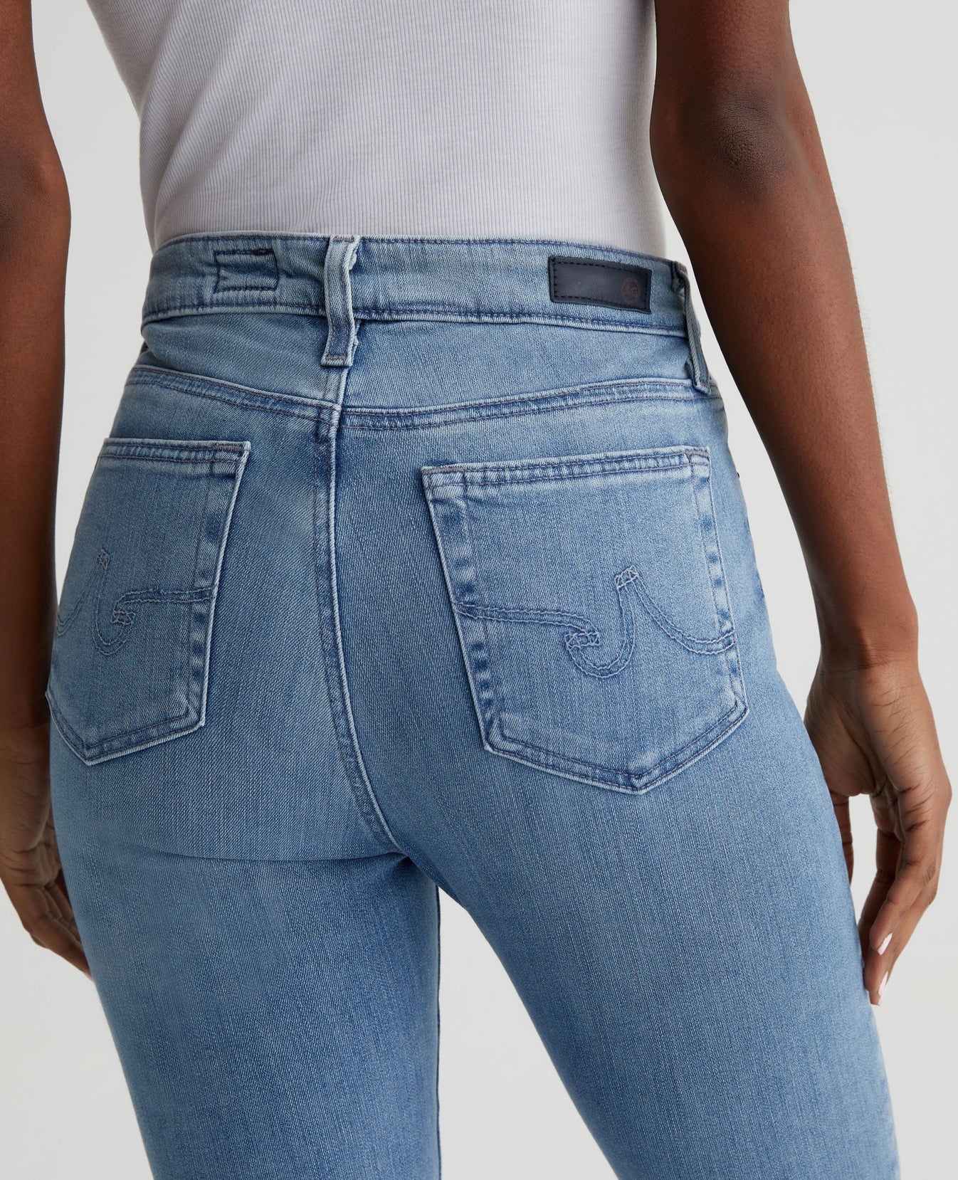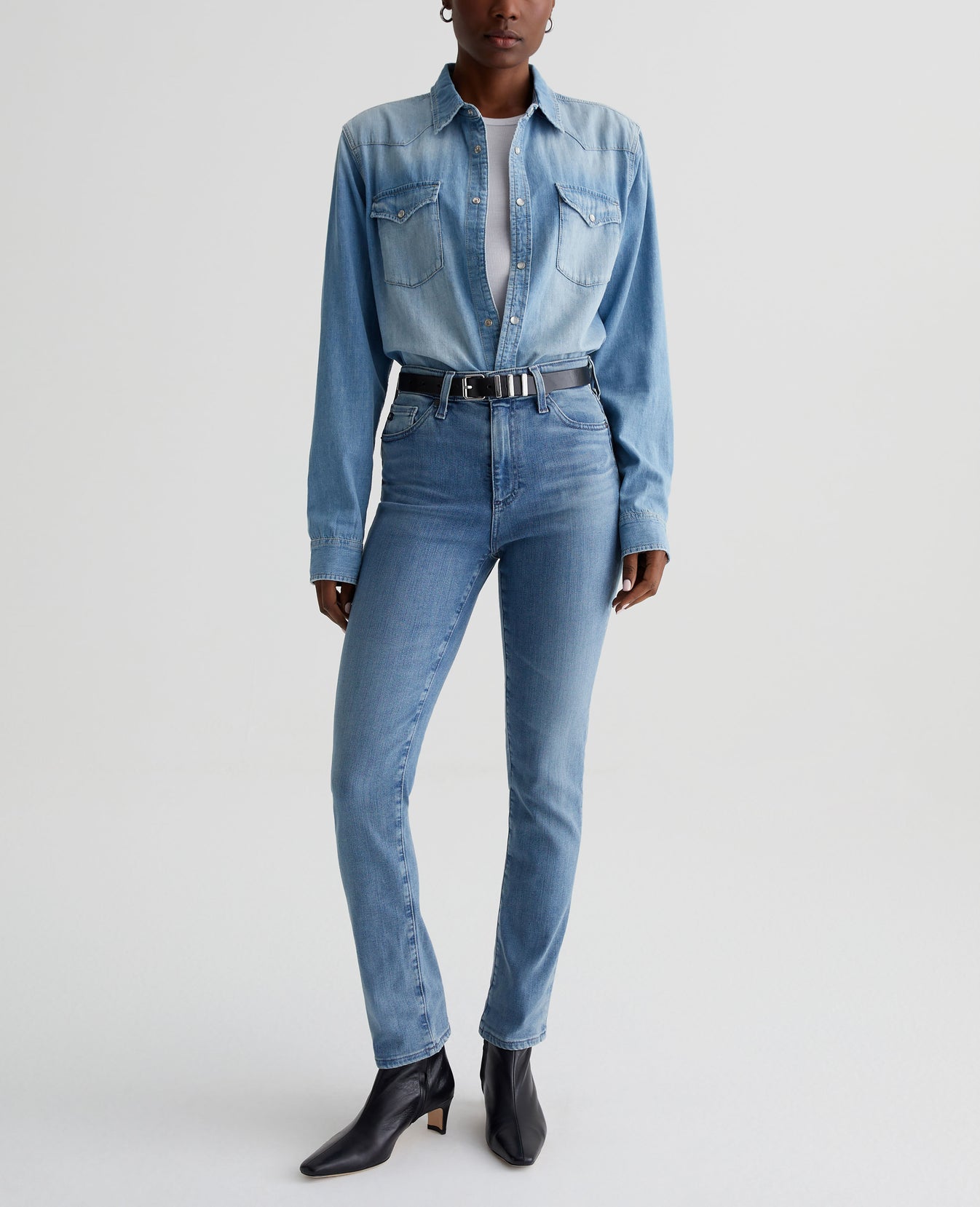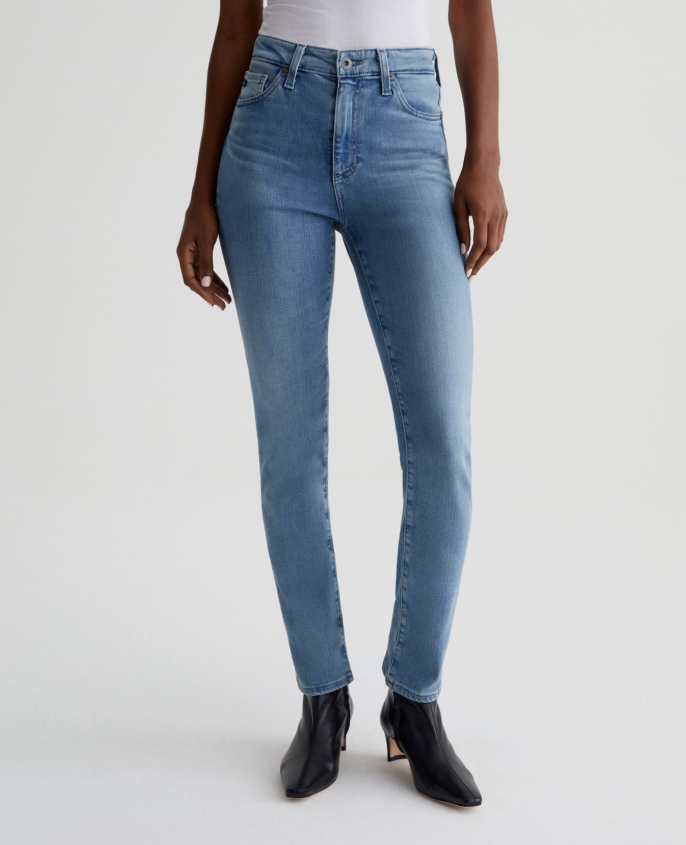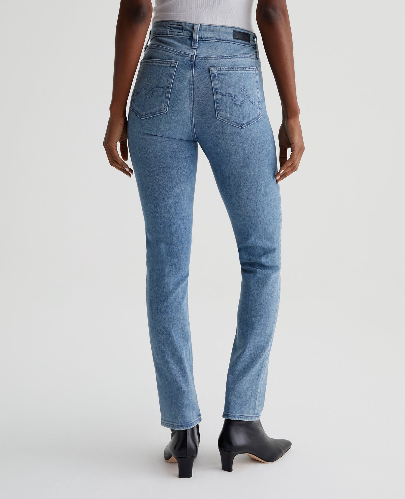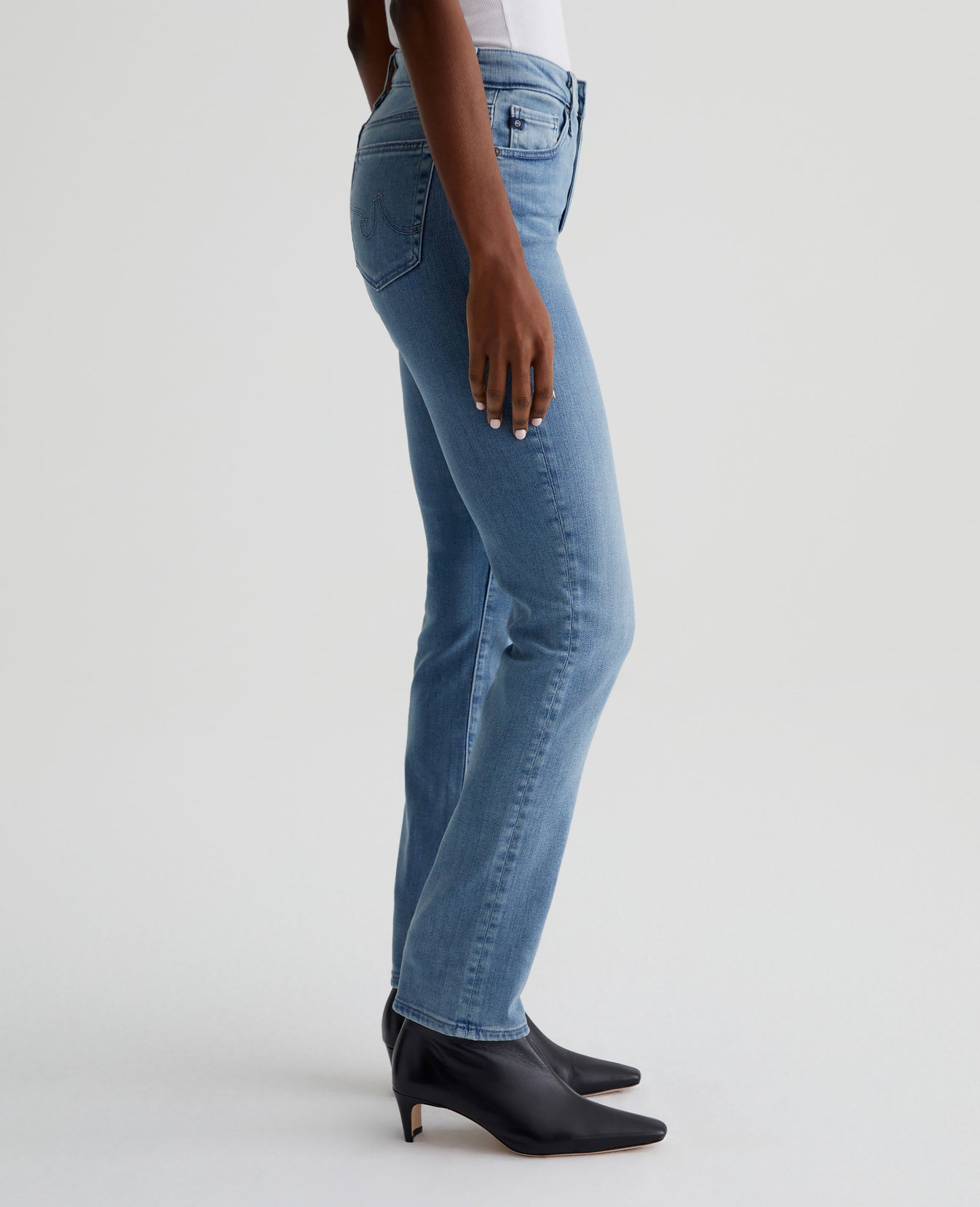 The Mari mid-rise straight leg jean for women features a light denim wash and is cut in a fitted silhouette around the hips with a straight leg and slim leg opening.