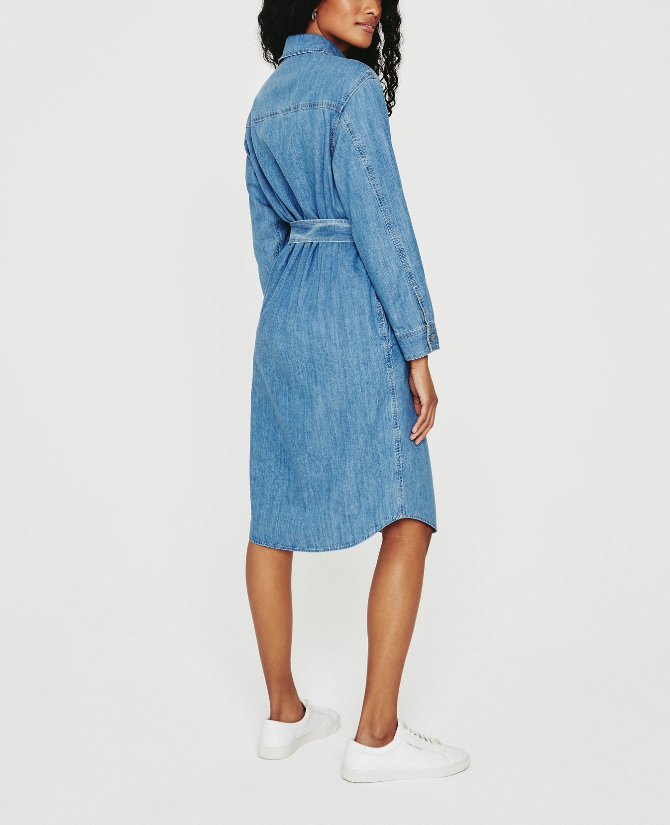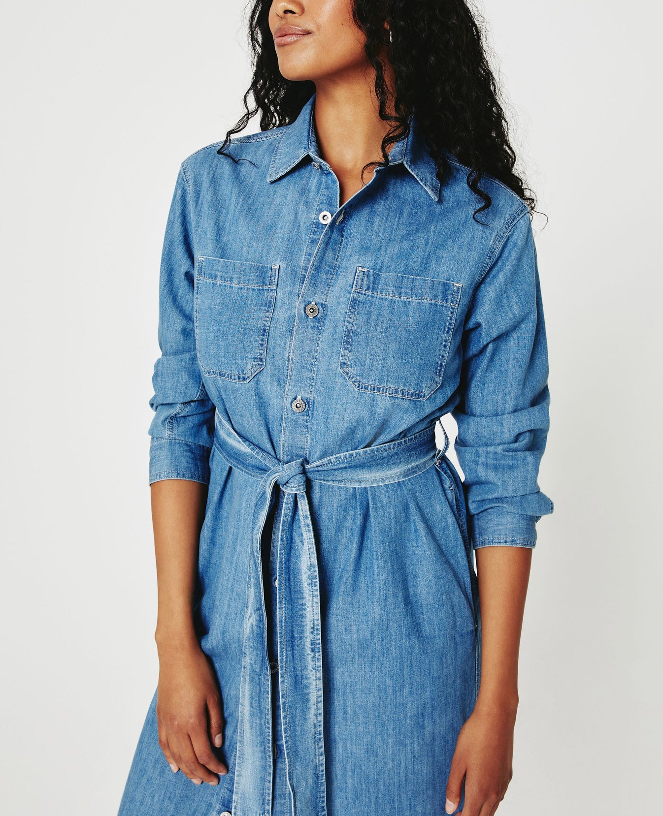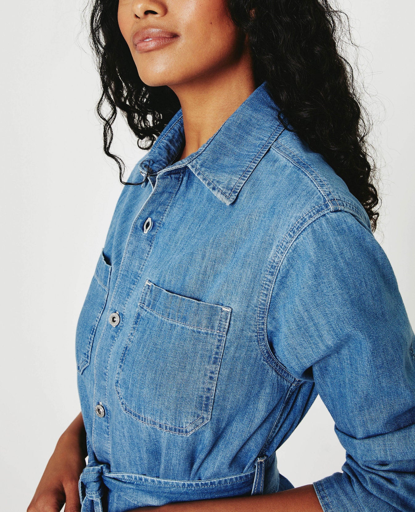 Millie is our new denim dress for women, featuring a light indigo wash designed in Teak Denim, a classic 2x1 Chambray fabrication. This versatile garment can be worn as a dress or left open, doubling as a denim trench. The midi knee-length offers a full button down construction, double-breasted pockets, and a belt for cinching.