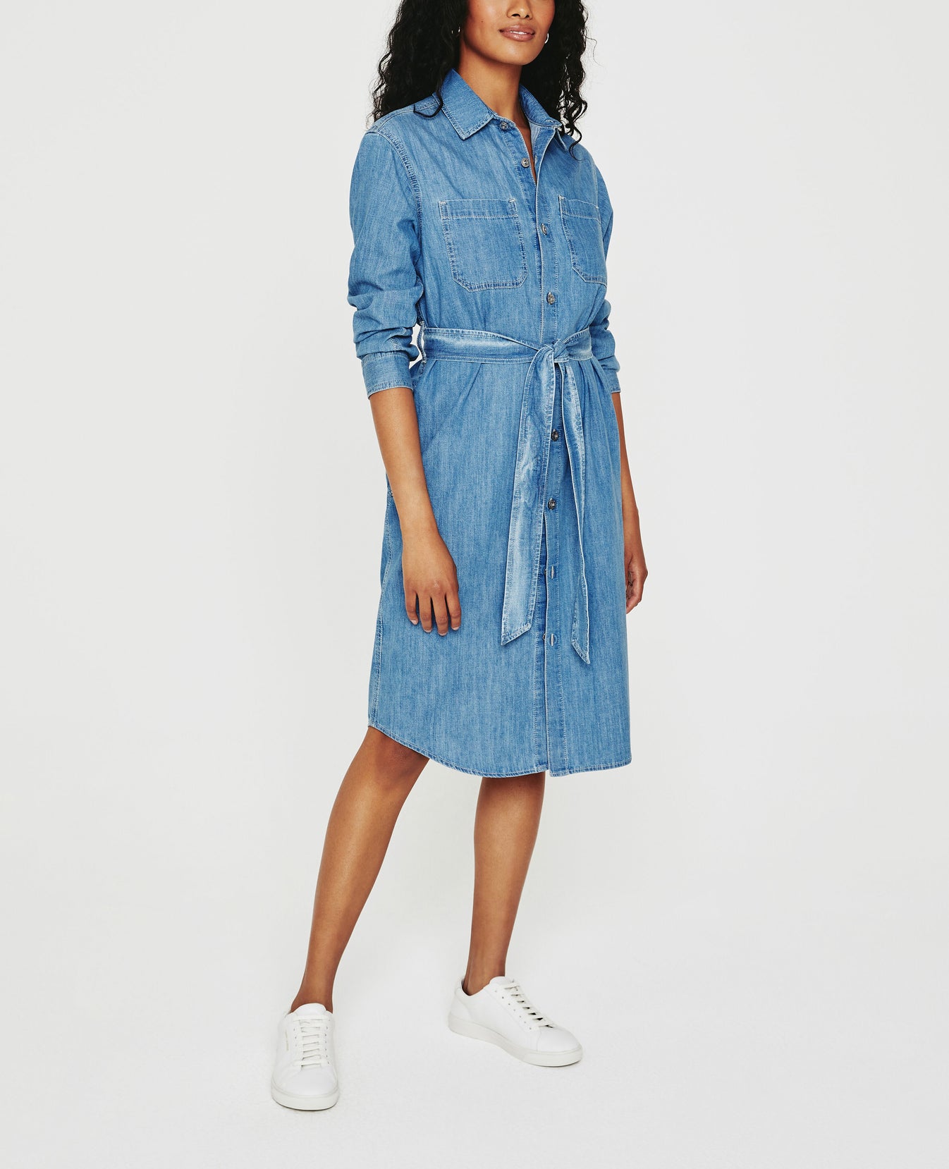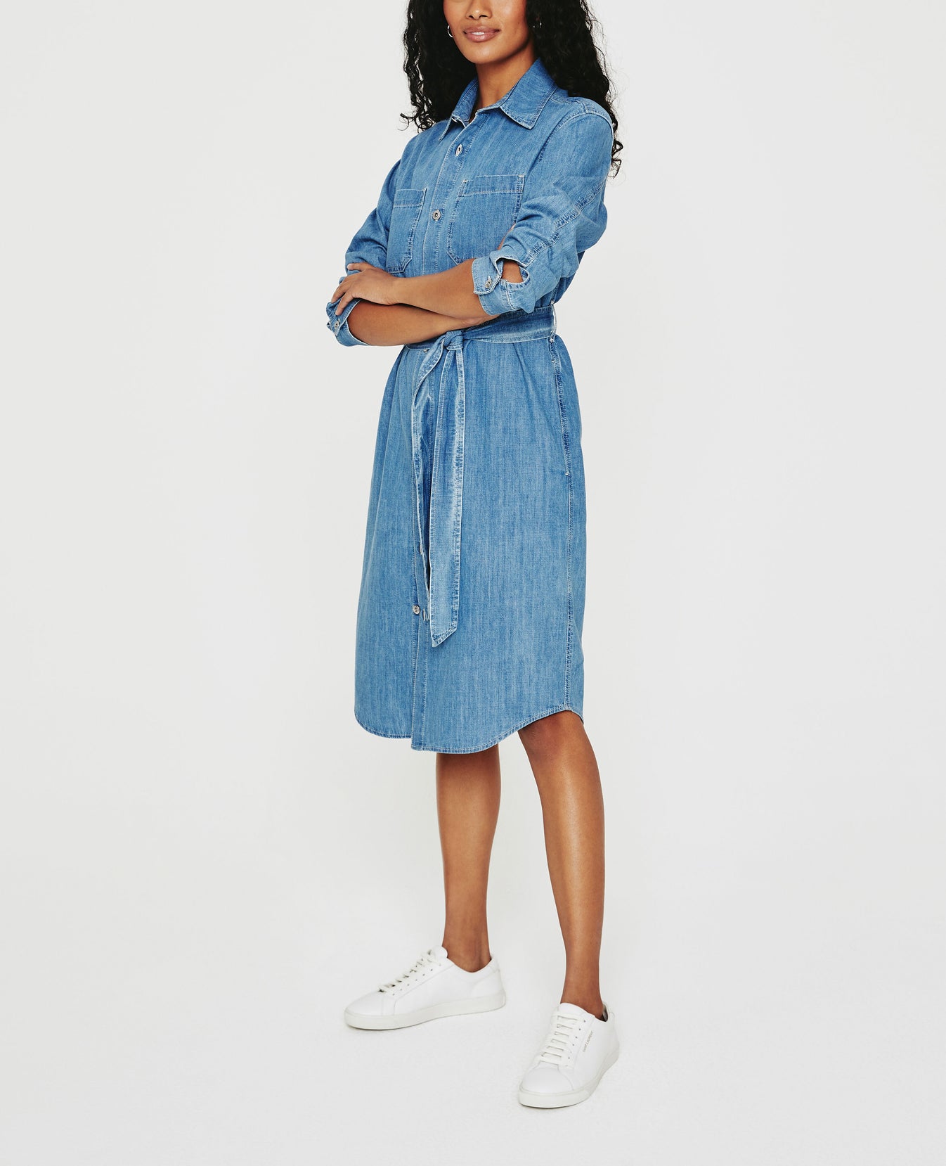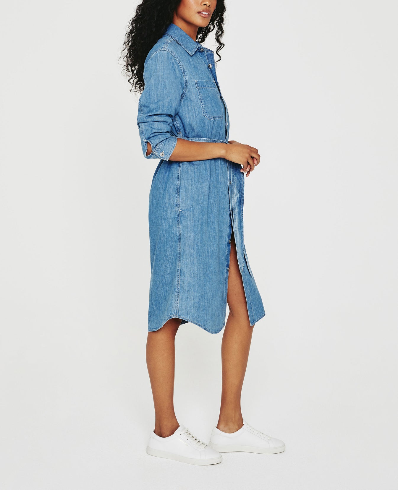 Millie is our new denim dress for women, featuring a light indigo wash designed in Teak Denim, a classic 2x1 Chambray fabrication. This versatile garment can be worn as a dress or left open, doubling as a denim trench. The midi knee-length offers a full button down construction, double-breasted pockets, and a belt for cinching.