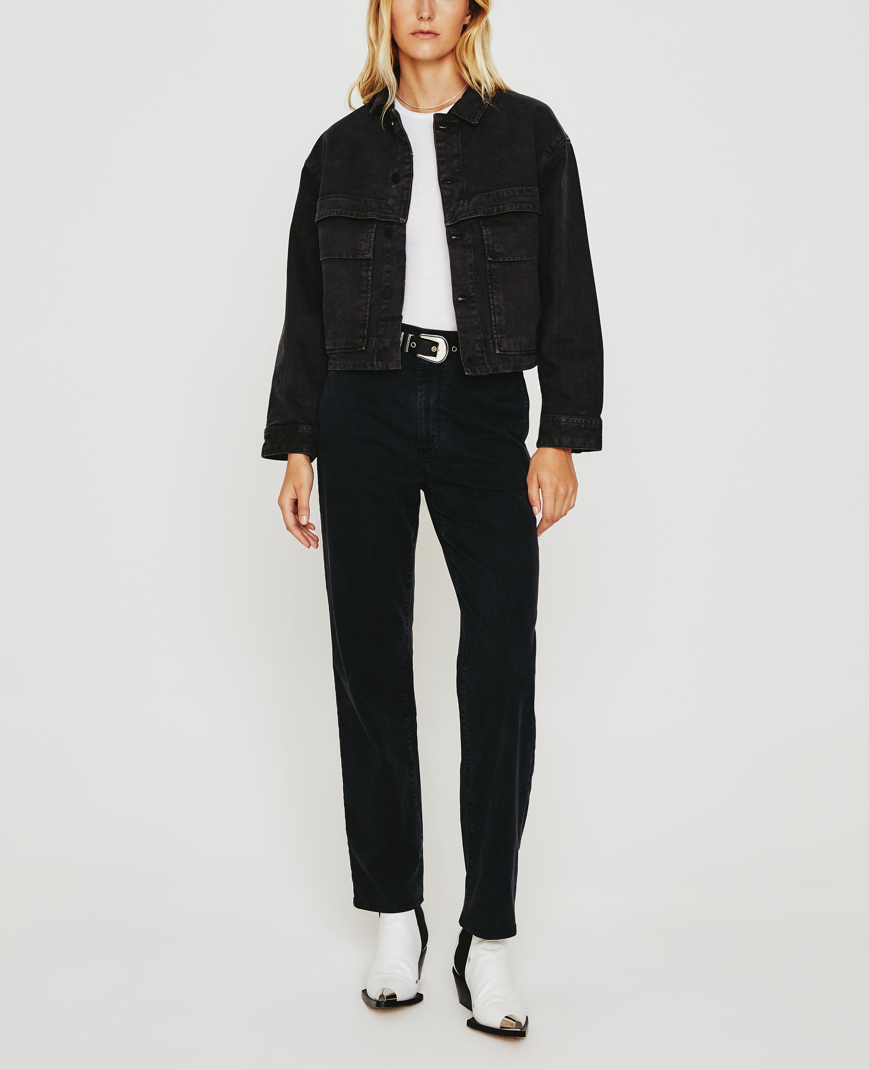 The Mirah Militant jacket is a cropped, boxy style cut from our Reserve Herringbone Twill in a sulfur-treated black shade. It's styled with oversized flap pockets at the front and features a pointed collar, dropped shoulders, and button closures at the front.