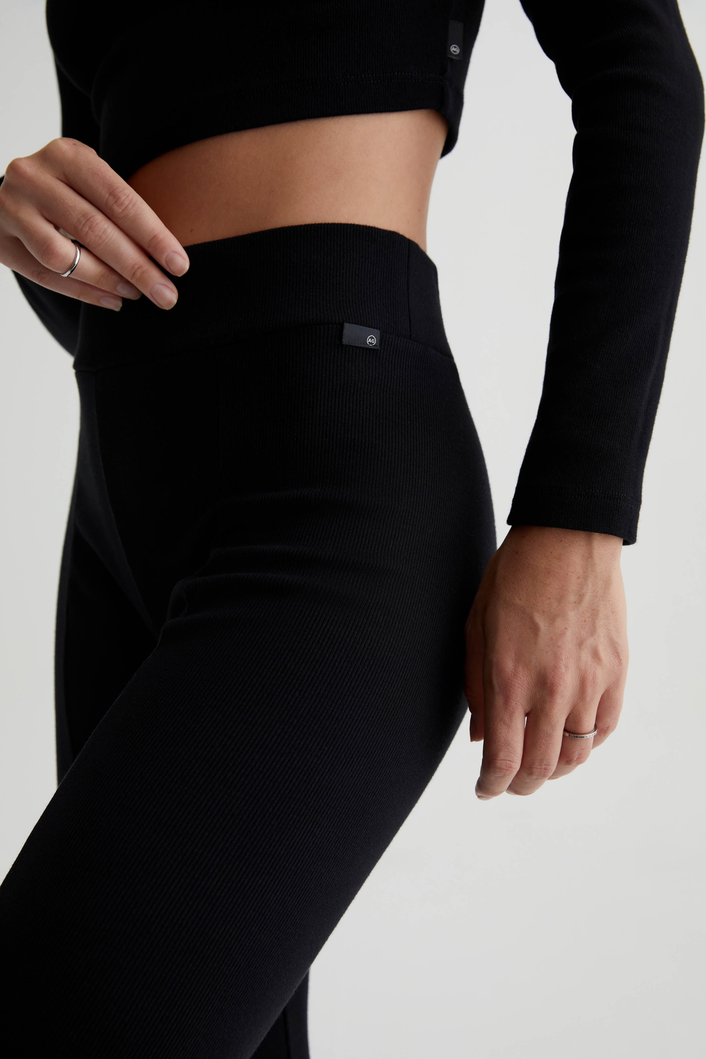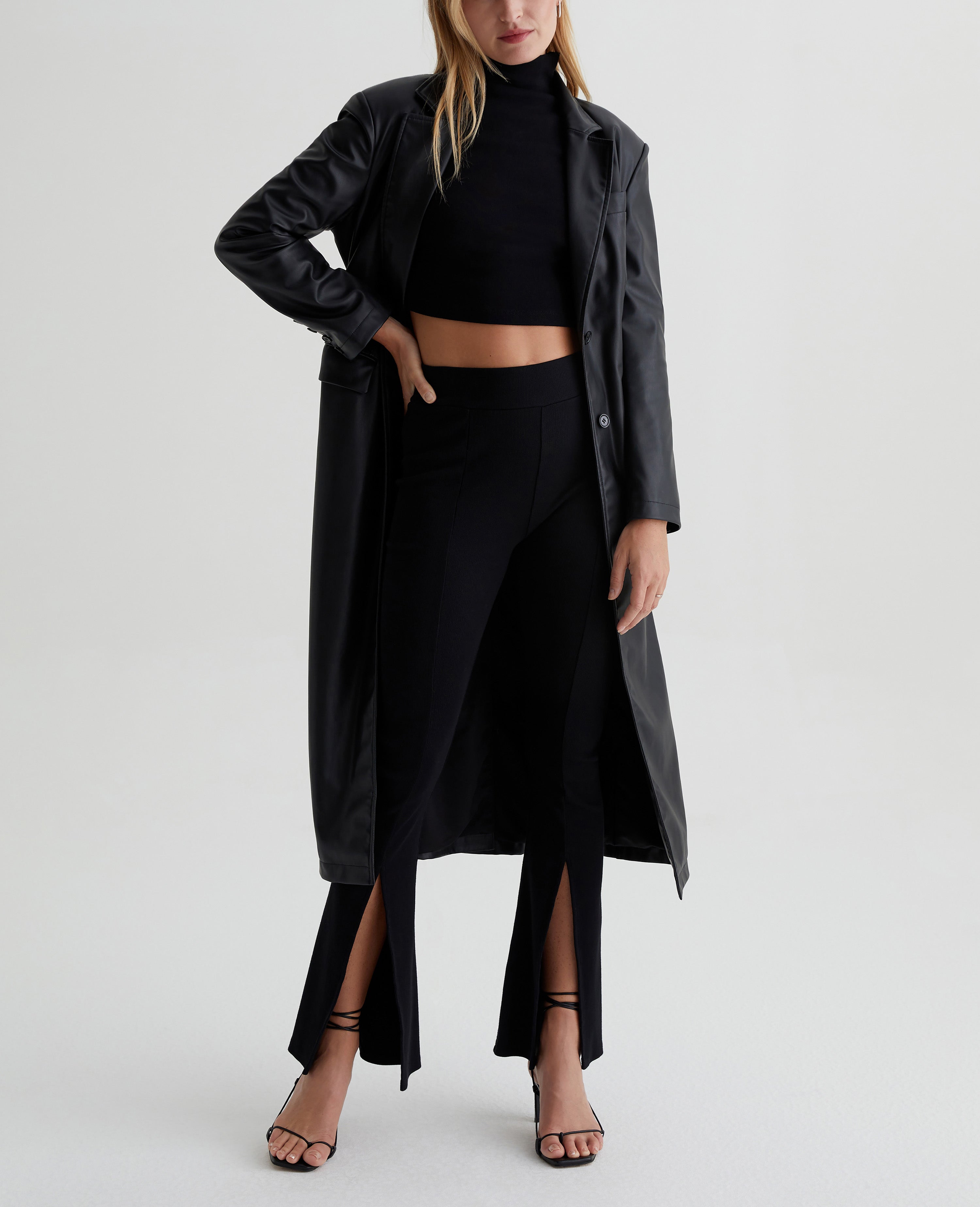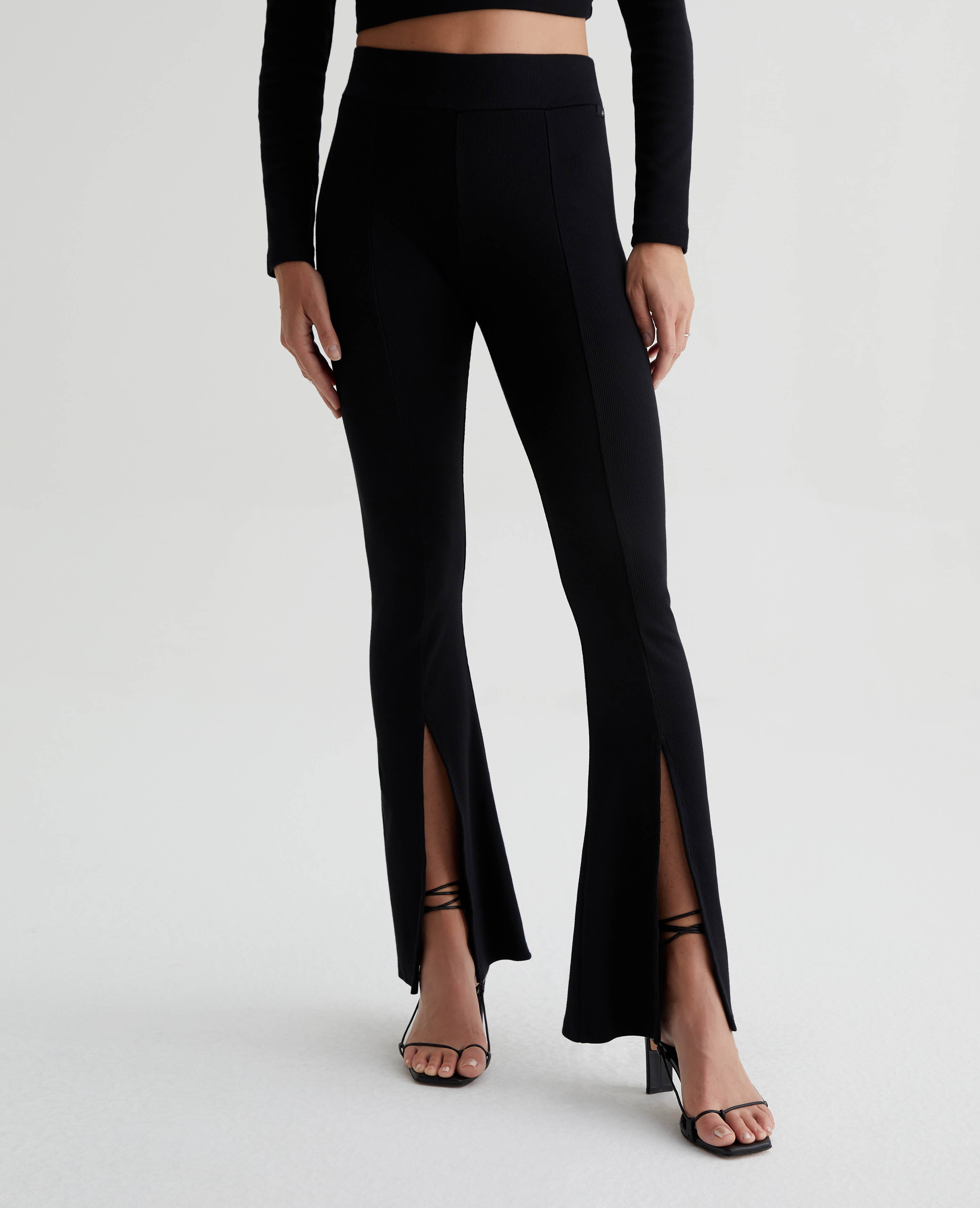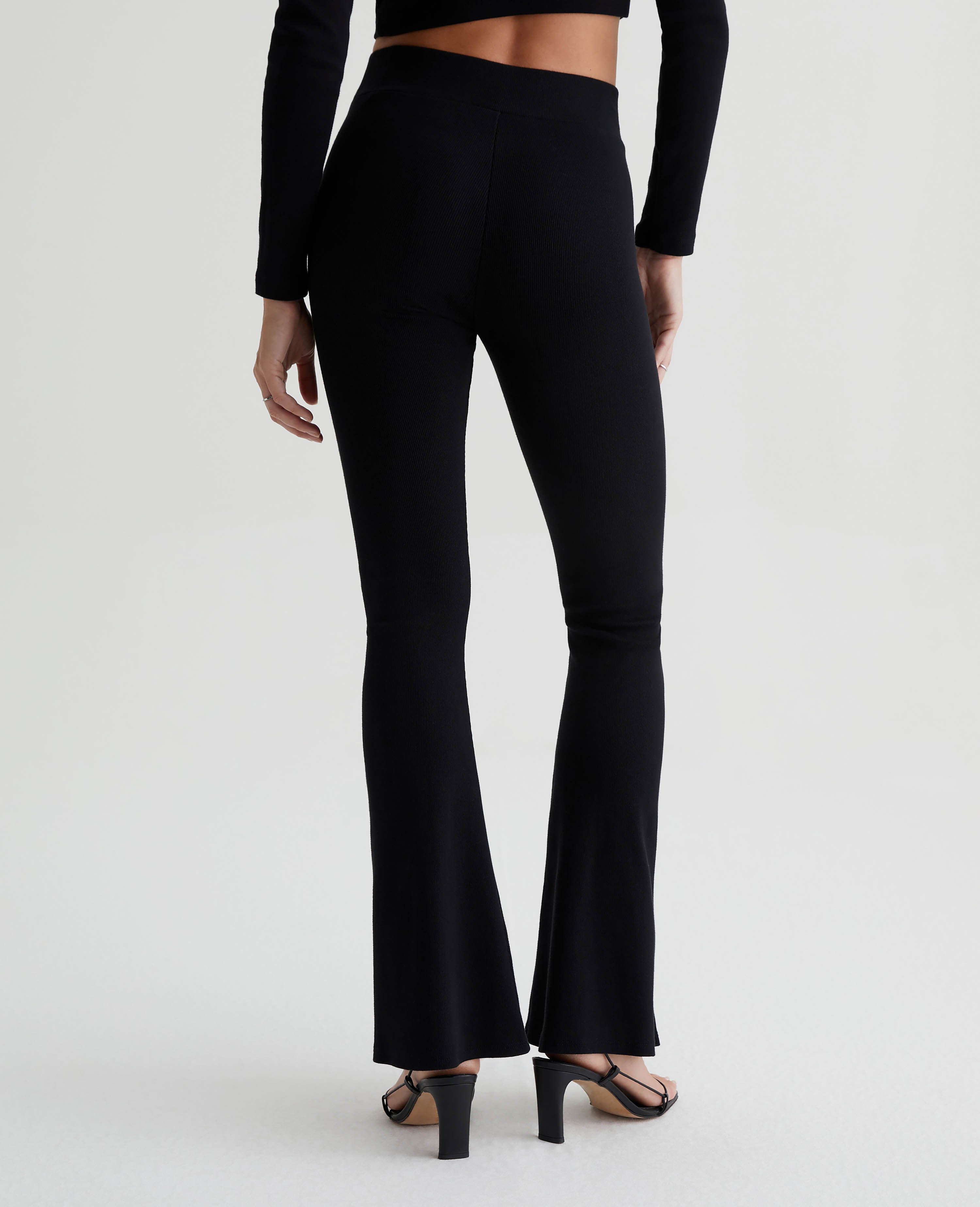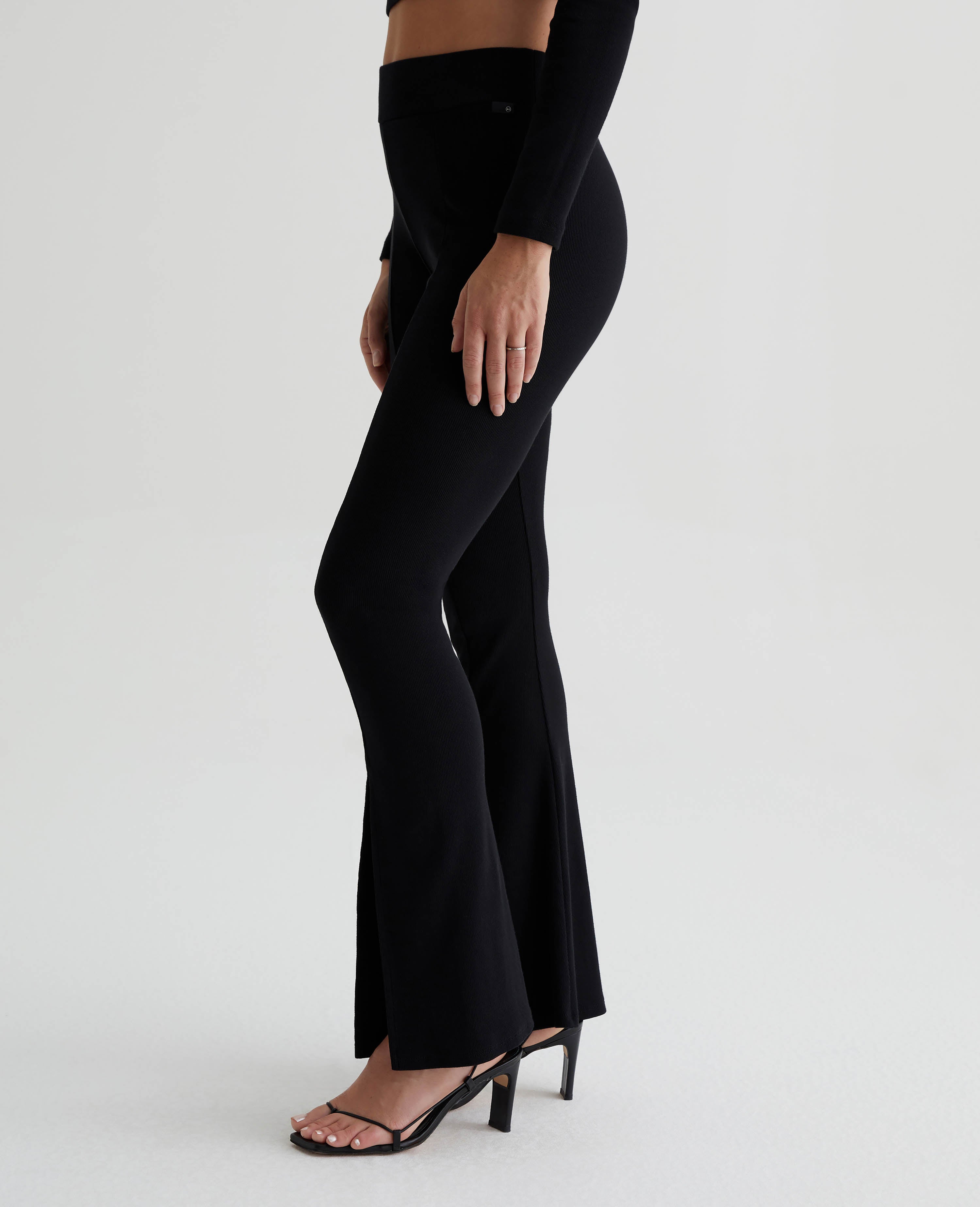 The EmRata x AG Morrison is a high-waisted flare pant that pulls on and adds a cool languid ease to any look. Crafted in a heavy rib black knit with a slim fit that lends a level of sophistication. This pant is high drama and asks to be center stage. A vertical seam down the front splits for a high-ankle slit, which perfectly reveals an elegant shoe moment. Designed in partnership with Emily Ratajkowski, the EmRata x AG capsule is a style story that features pieces that exude the model’s confident ease and dynamic fashion.