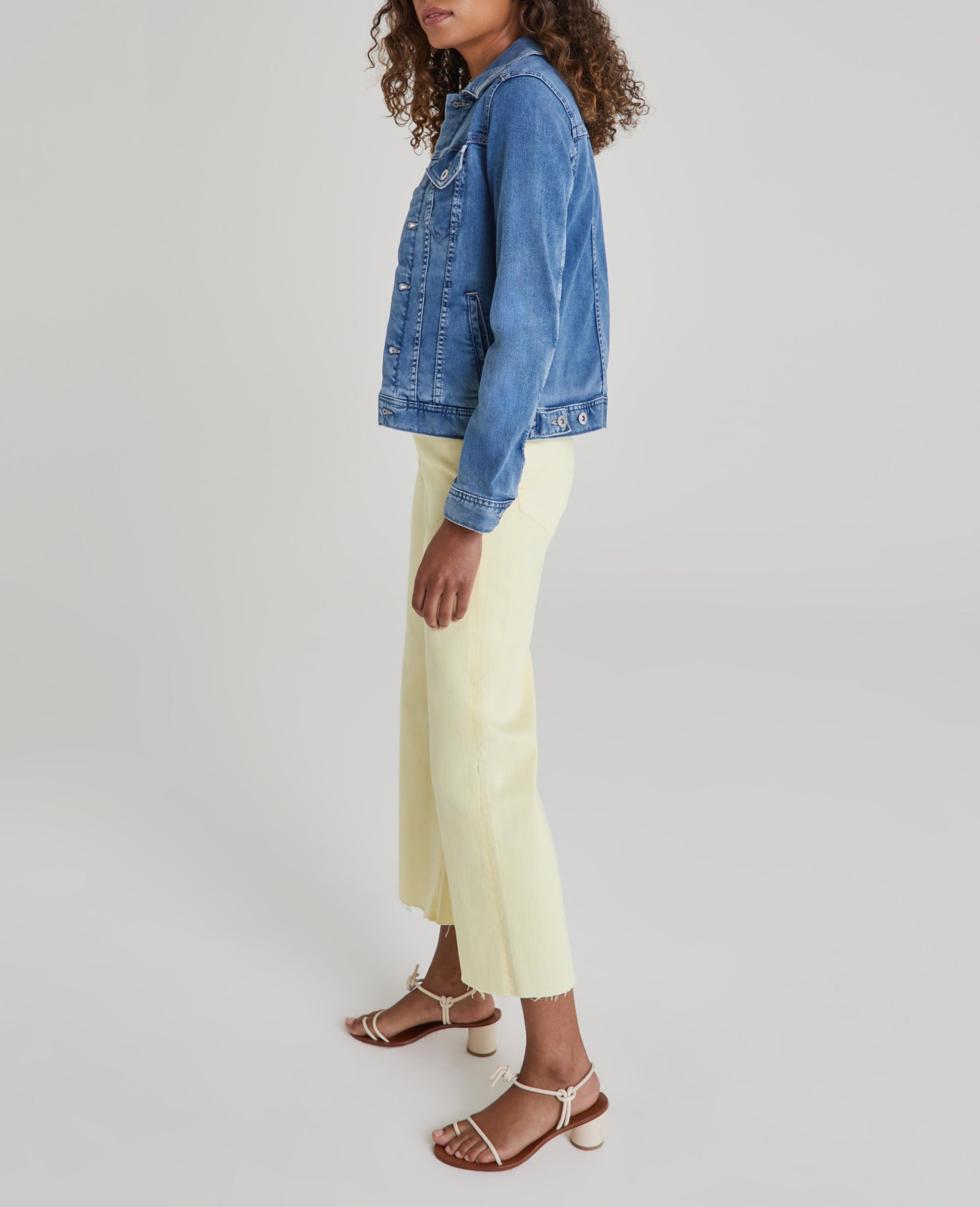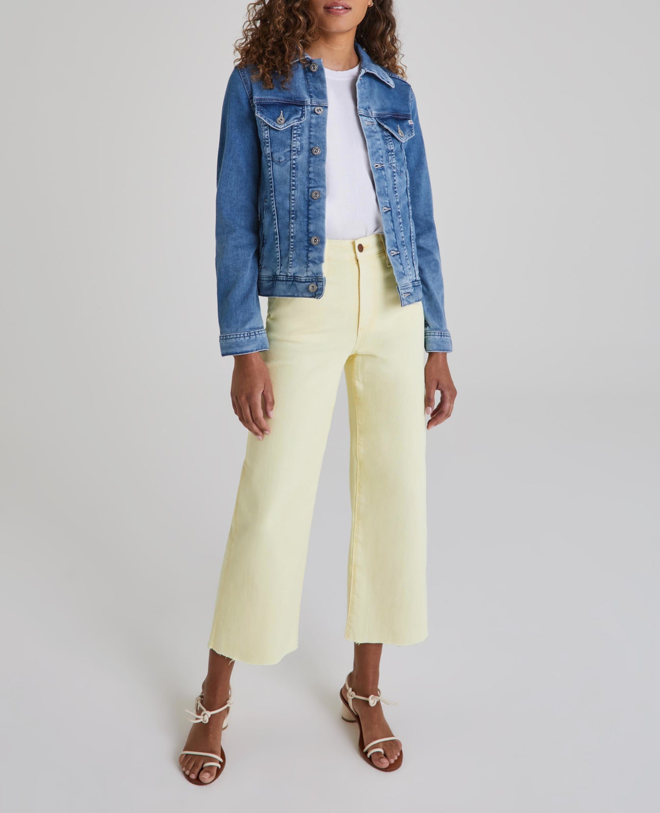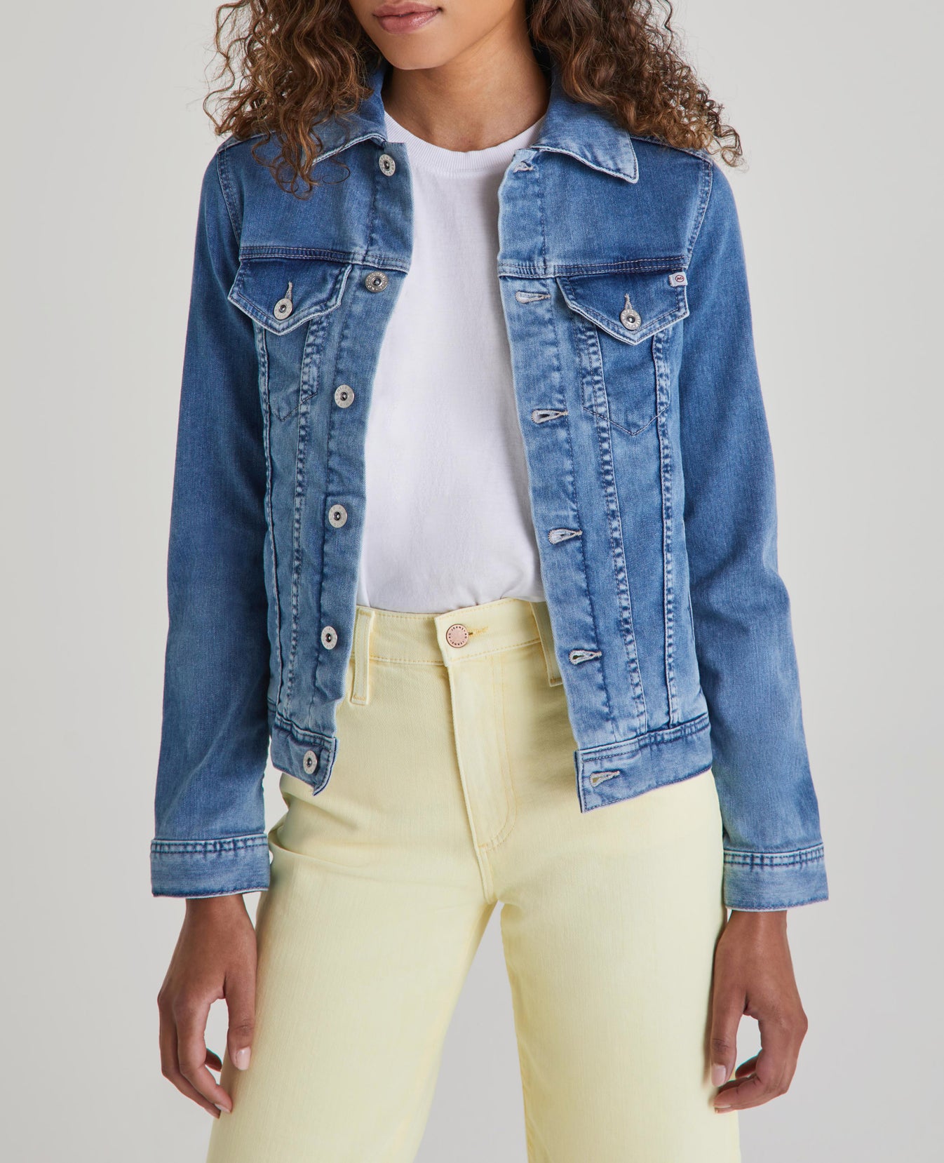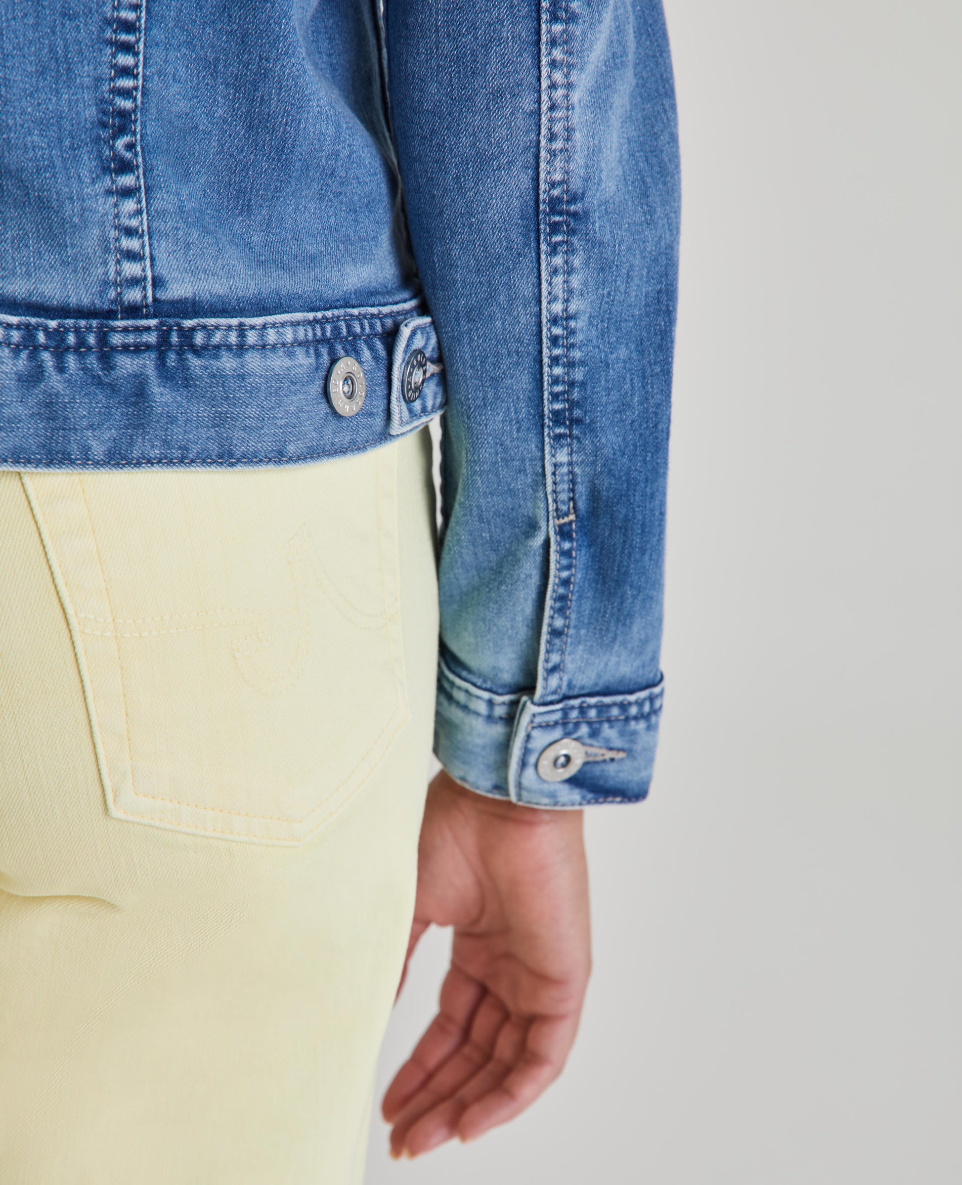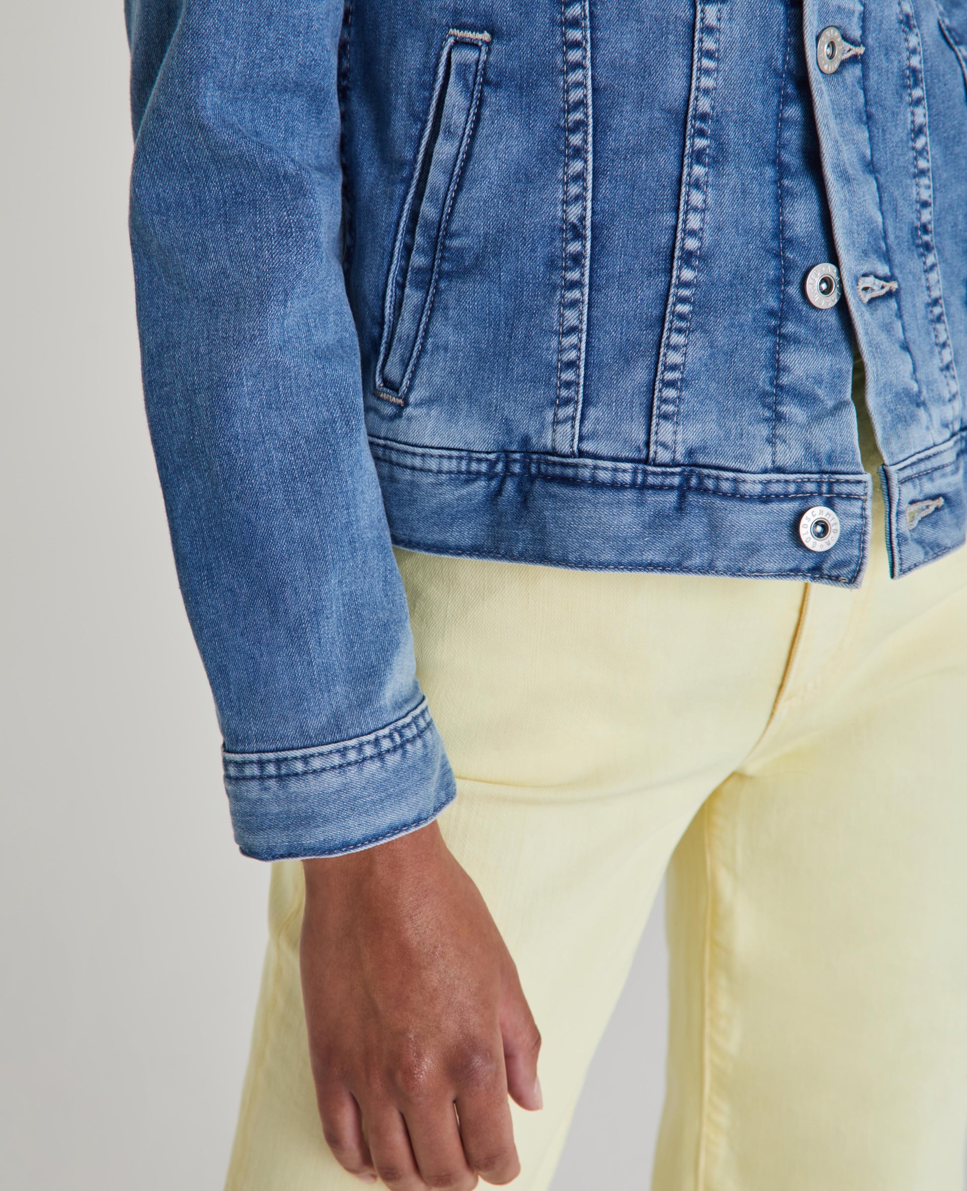 The Mya Jacket is a classic jean jacket for women featuring an authentic, 22-year light wash that’s been uniquely faded and whiskered to mimic a pair of genuine vintage jeans. The Mya offers an easy silhouette for seasonal layering and essential side slit pockets. This women’s denim jacket is designed in an ultra-lightweight denim with added super stretch for the softest wear and genuine denim appeal.