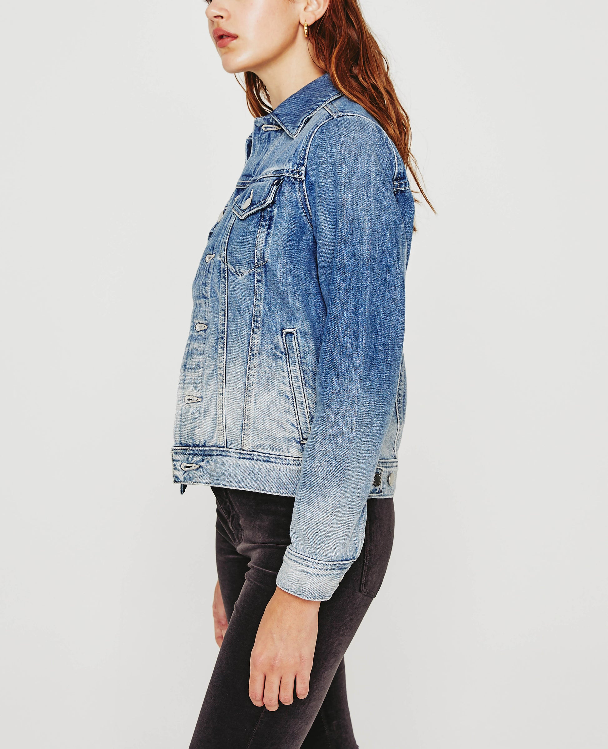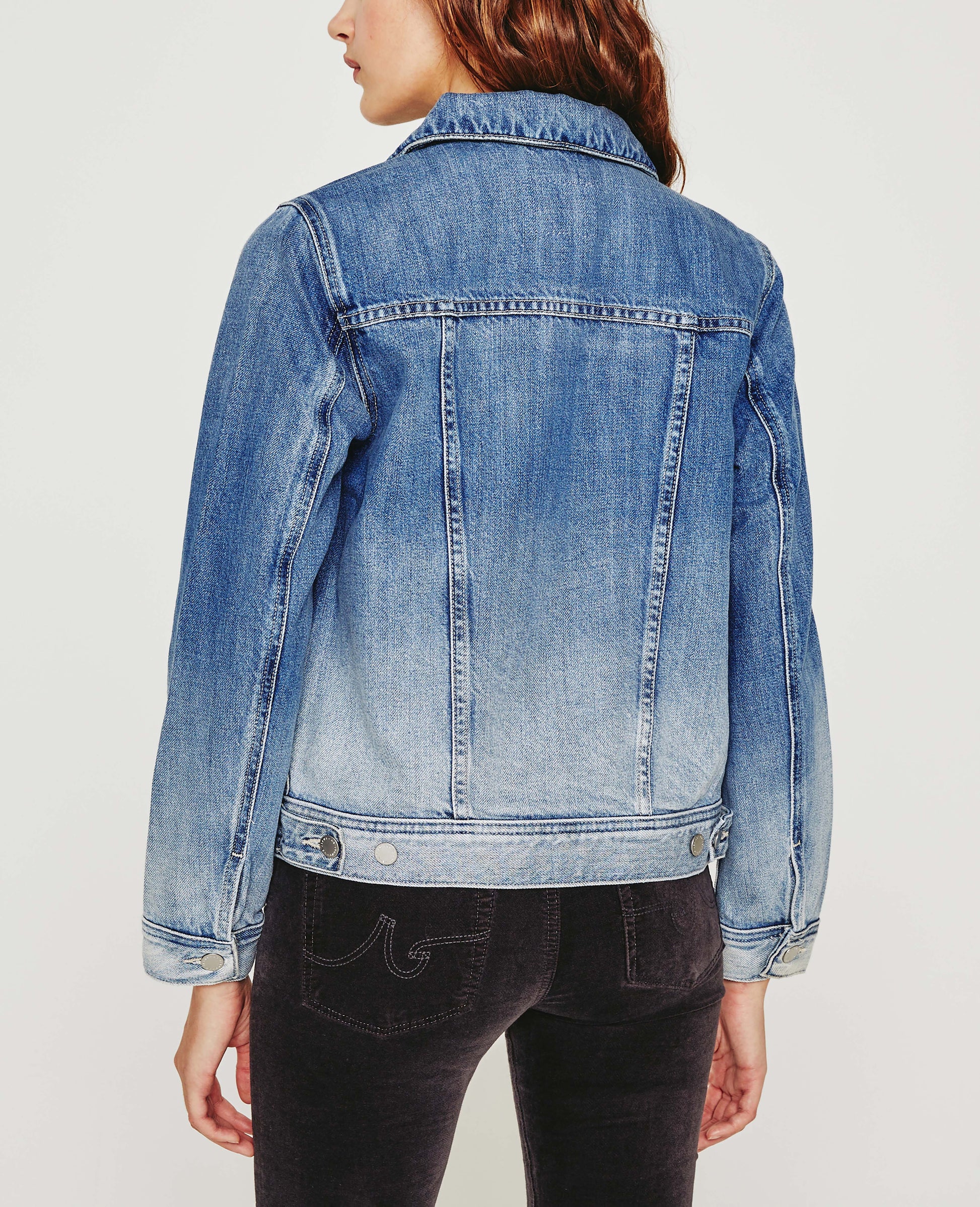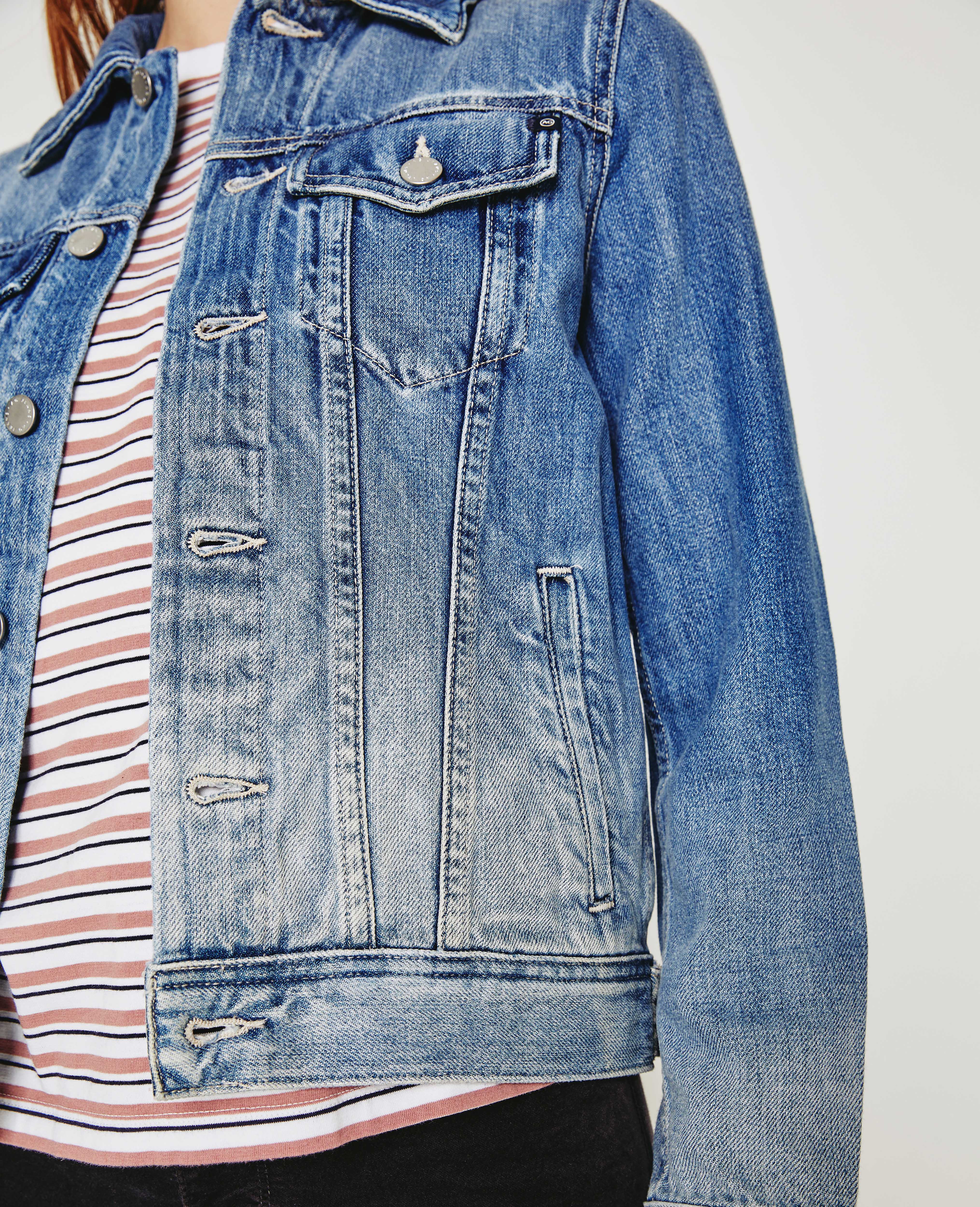 Mya Jacket is a classic jean jacket for women featuring an authentic, medium denim wash that’s been uniquely worn-in to mimic a pair of genuine vintage jeans. The Mya offers an easy silhouette for seasonal layering and essential side slit pockets. This women’s denim jacket is designed in an exclusive, AG non-stretch denim fabricated from 50% pima cotton for an ultra-soft touch and authentic slub character that only ages better with wear.