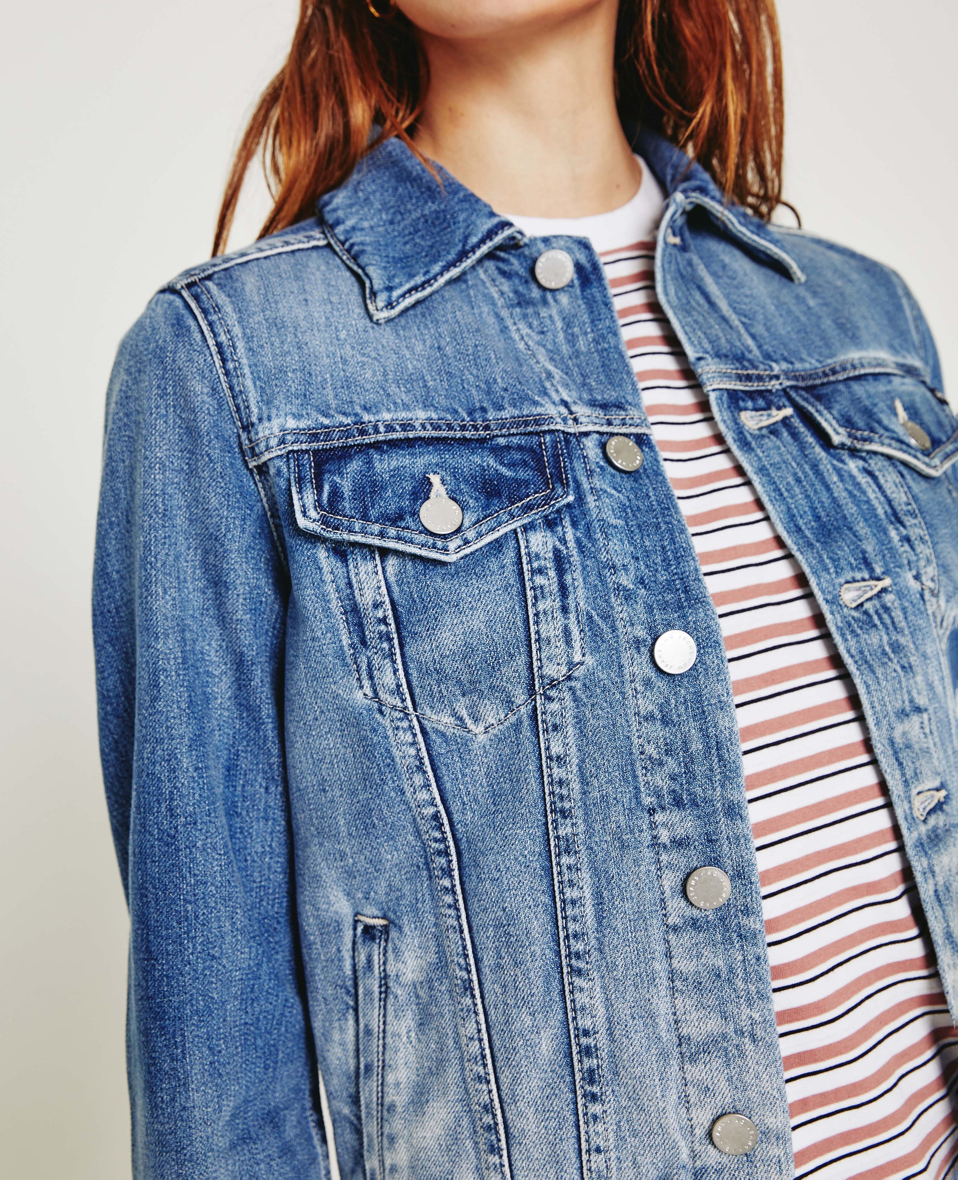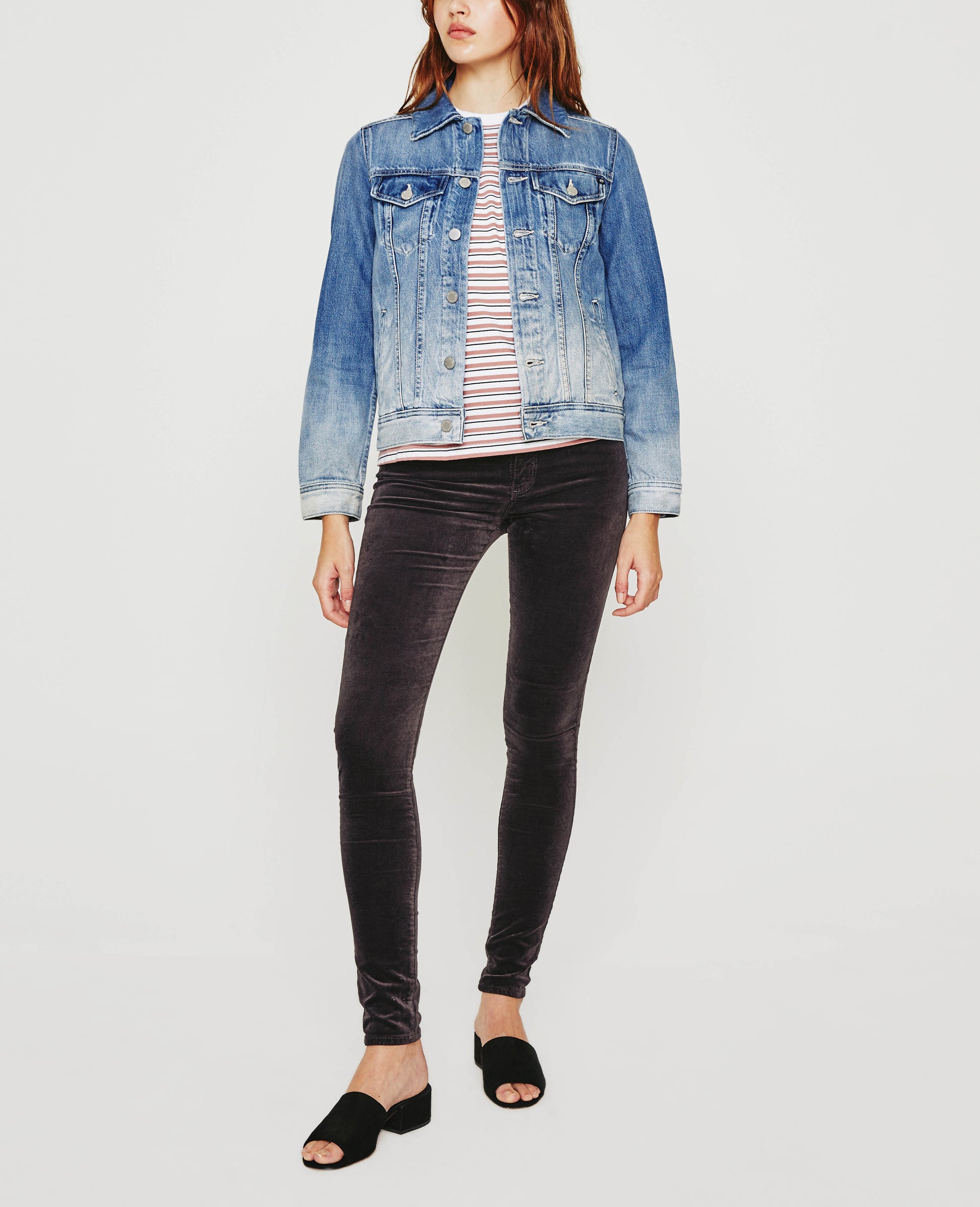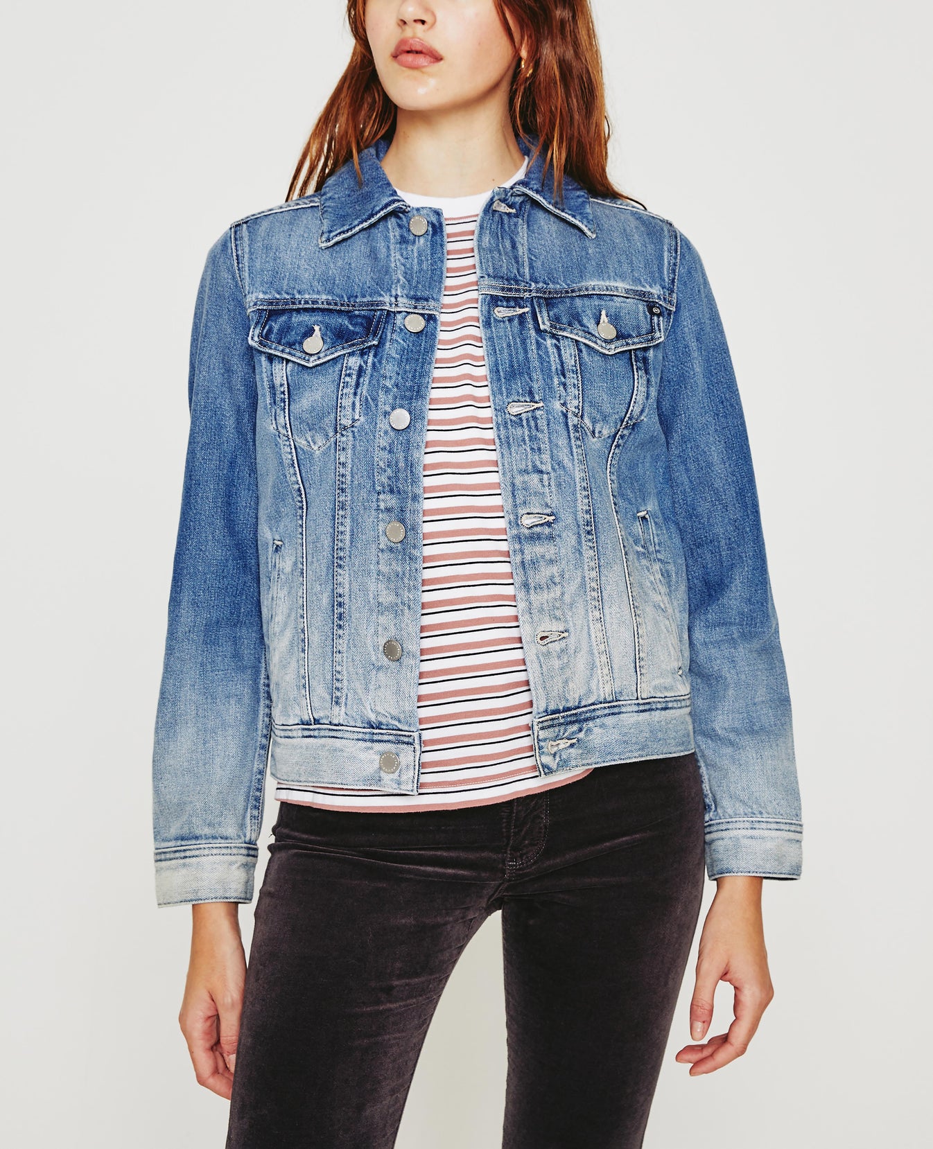 Mya Jacket is a classic jean jacket for women featuring an authentic, medium denim wash that’s been uniquely worn-in to mimic a pair of genuine vintage jeans. The Mya offers an easy silhouette for seasonal layering and essential side slit pockets. This women’s denim jacket is designed in an exclusive, AG non-stretch denim fabricated from 50% pima cotton for an ultra-soft touch and authentic slub character that only ages better with wear.