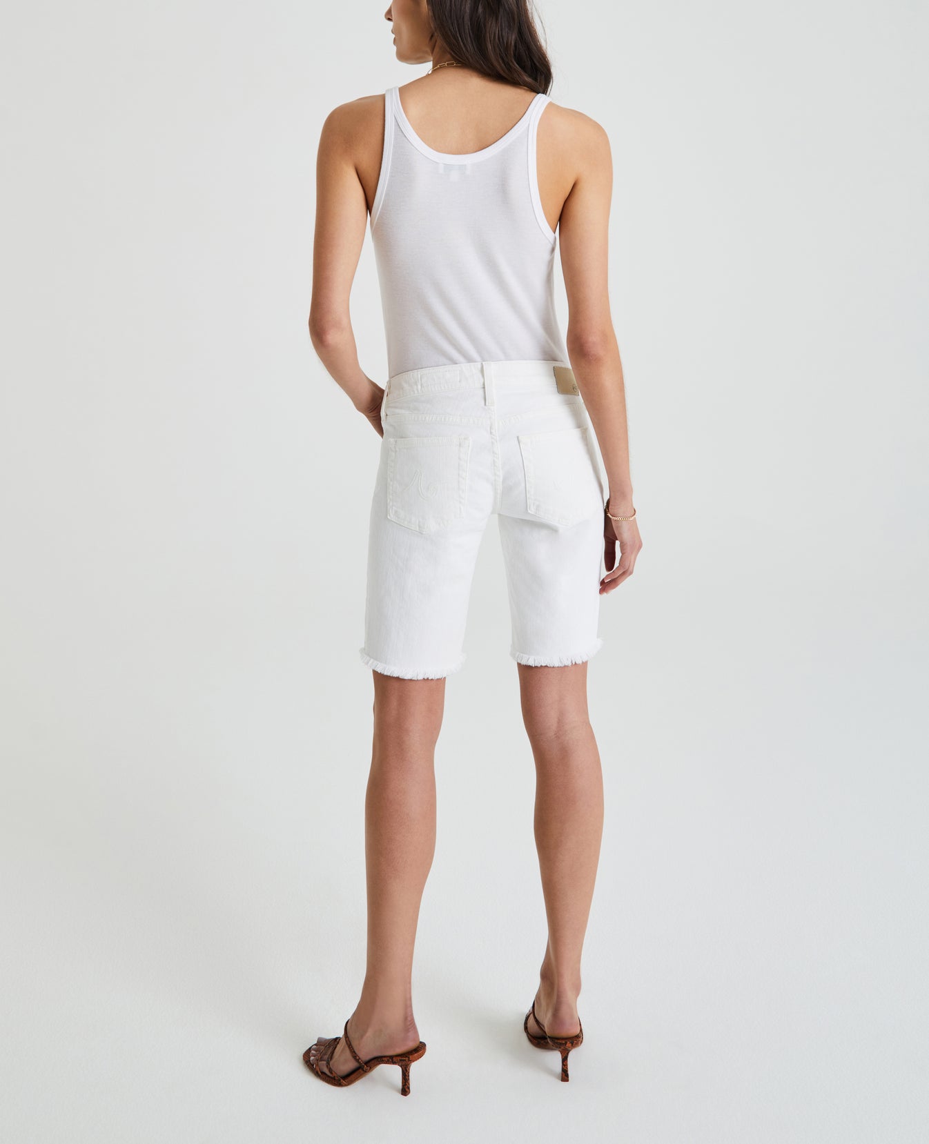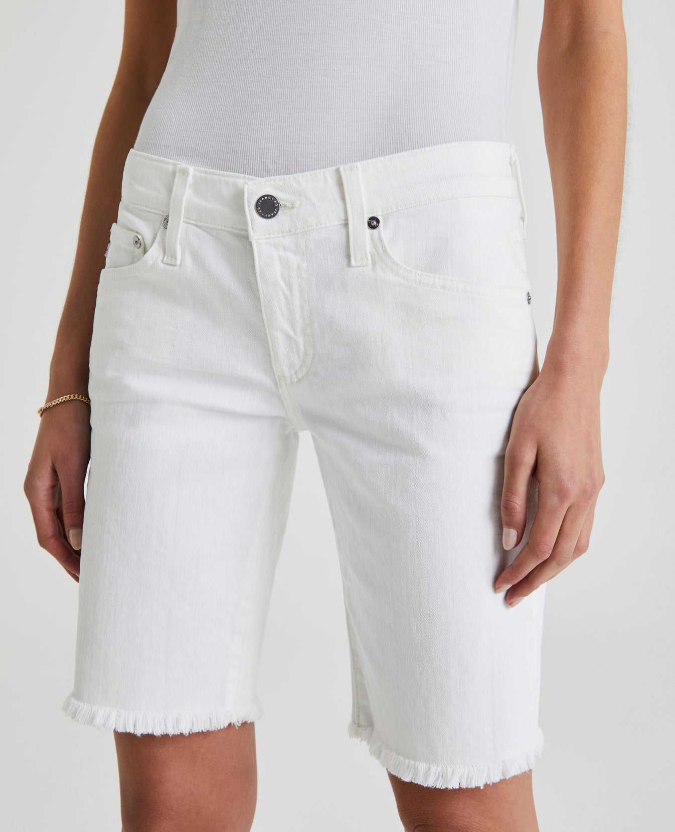 The Nikki Short bermuda cut off for women features an authentic, 1 year AG-ed™ white denim wash that’s been uniquely distressed to mimic a pair of genuine vintage jeans. This jean short offers a comfortable mid rise waist, relaxed silhouette, and raw edge cuffed hem that sits at thigh length. This women’s jean short is designed in a 10 oz. Japanese comfort stretch denim, offering a classic and structured feel with comfortable wear.