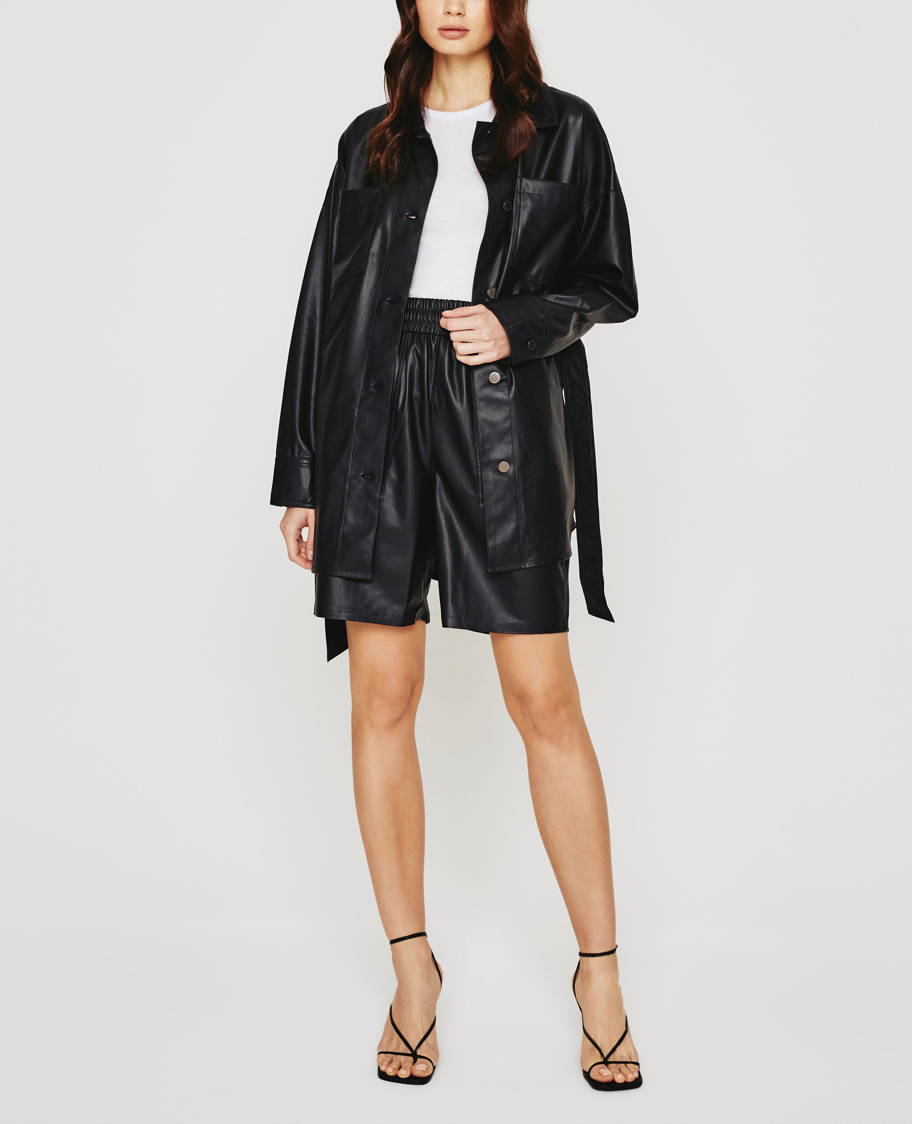 The Nova Jogger Short for women features a slouchy, sporty silhouette in black vegan leather. The pair is soft, supple, and easy to wear, designed with a ruched elastic waistband and deep pork chop pockets at the front.