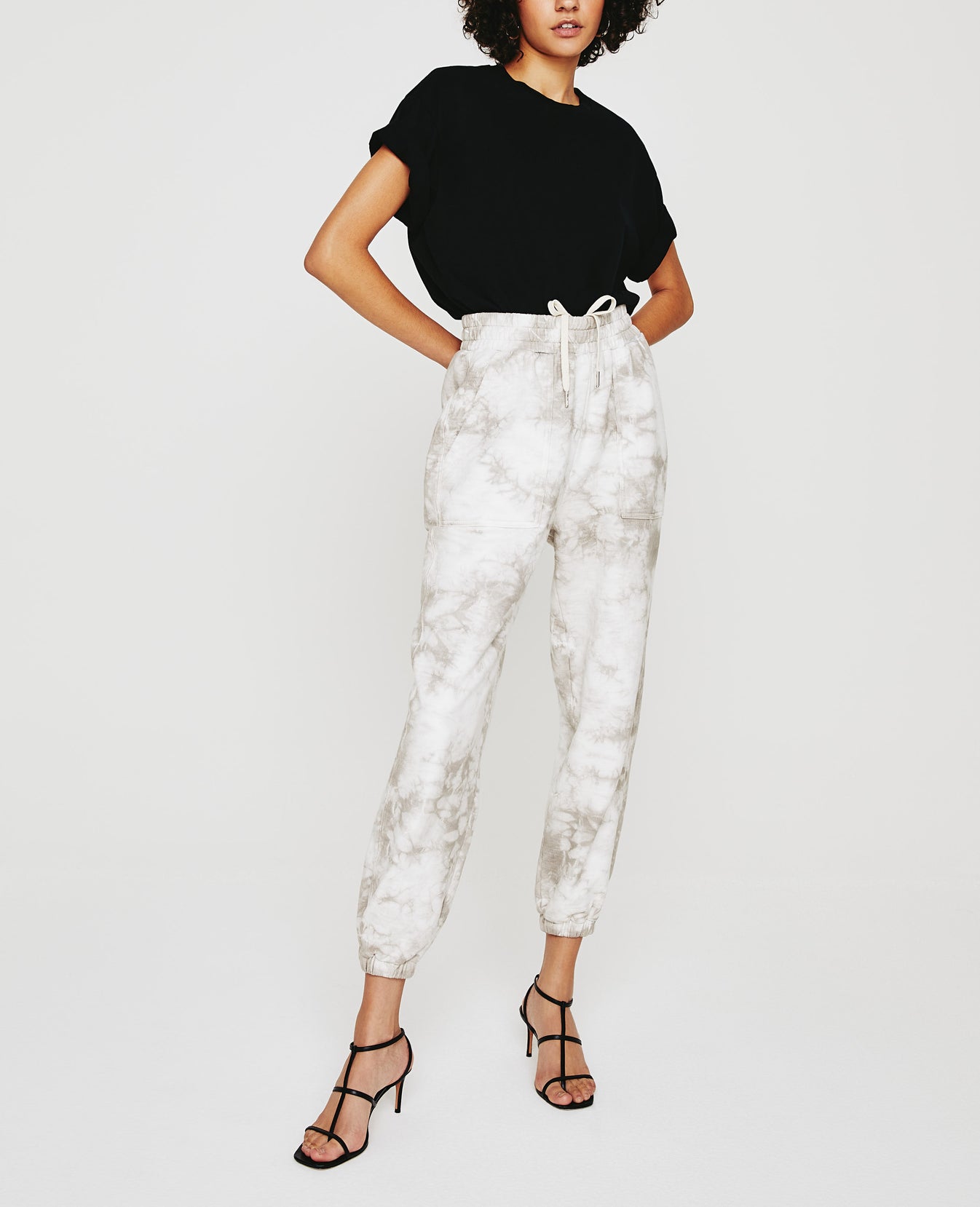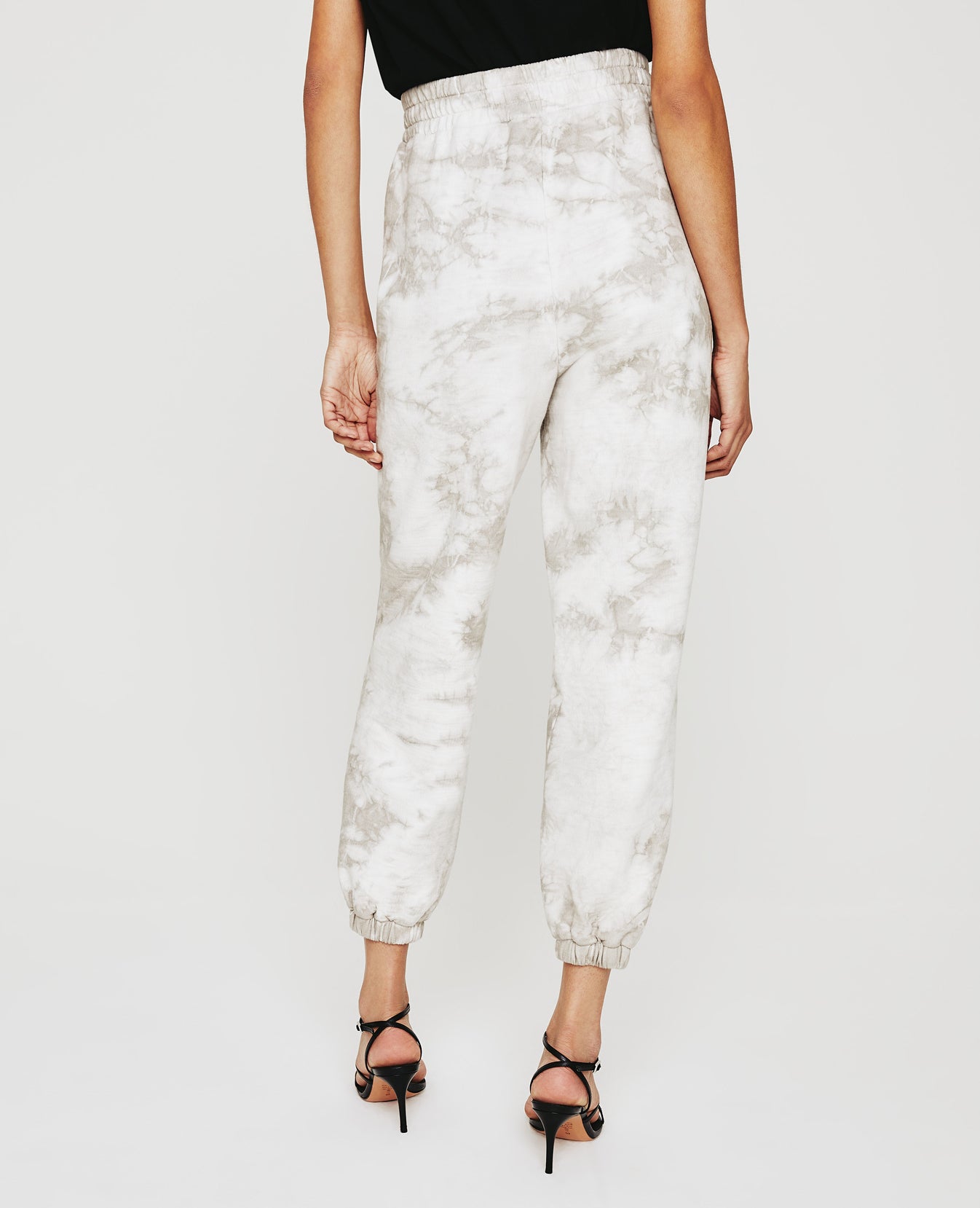 The Nova Sweatpant for women has a slouchy silhouette in a grey and white tie-dye pattern. The style features a ruched elastic waistband, deep pork chop pockets, and tapered legs with elastic hems. This women's sweatpant is designed in AG's exclusive Cotton Slub Loopback Terry, a 100% cotton fabric that's lightweight and soft to the touch. An interior drawstring lets you adjust the fit.