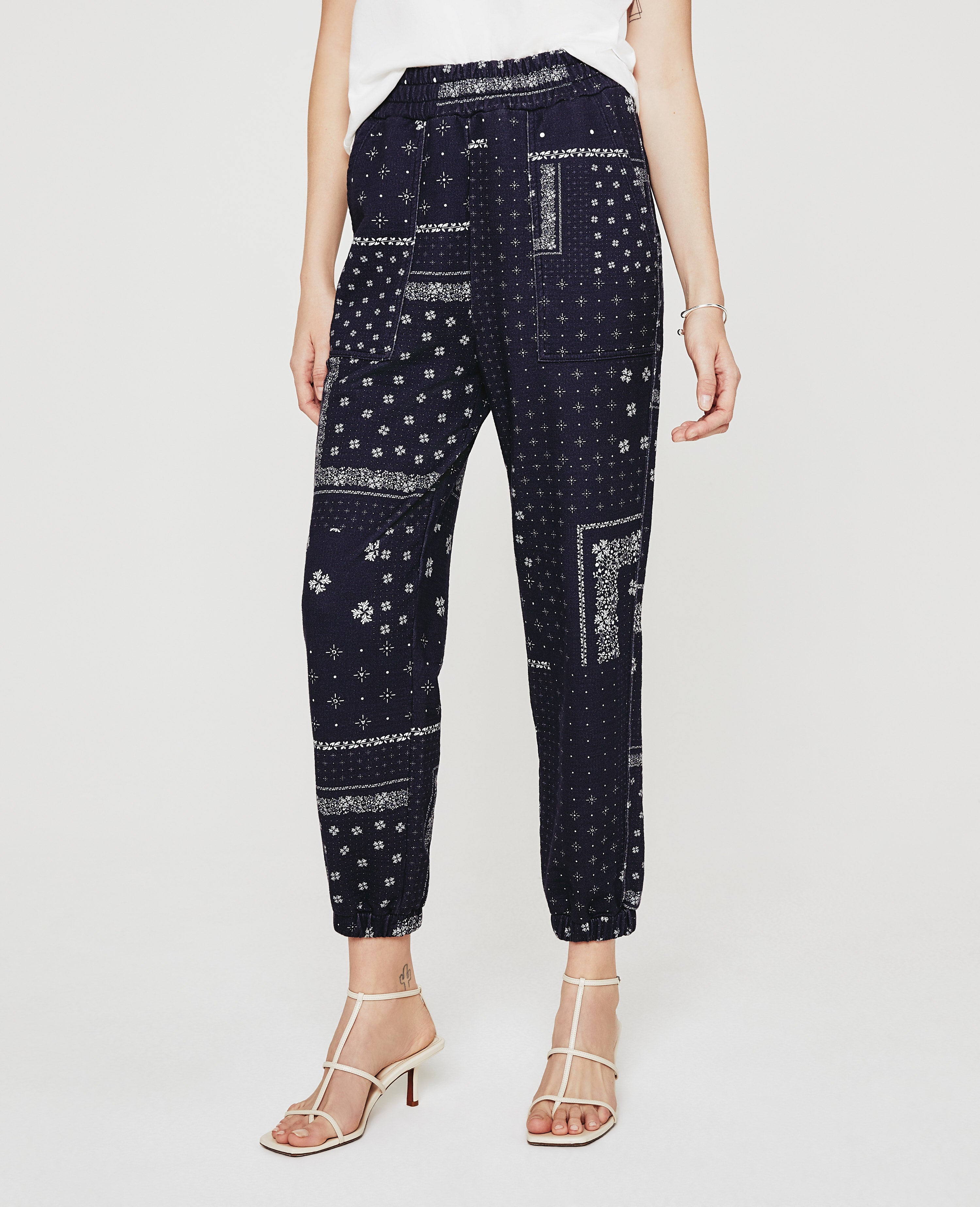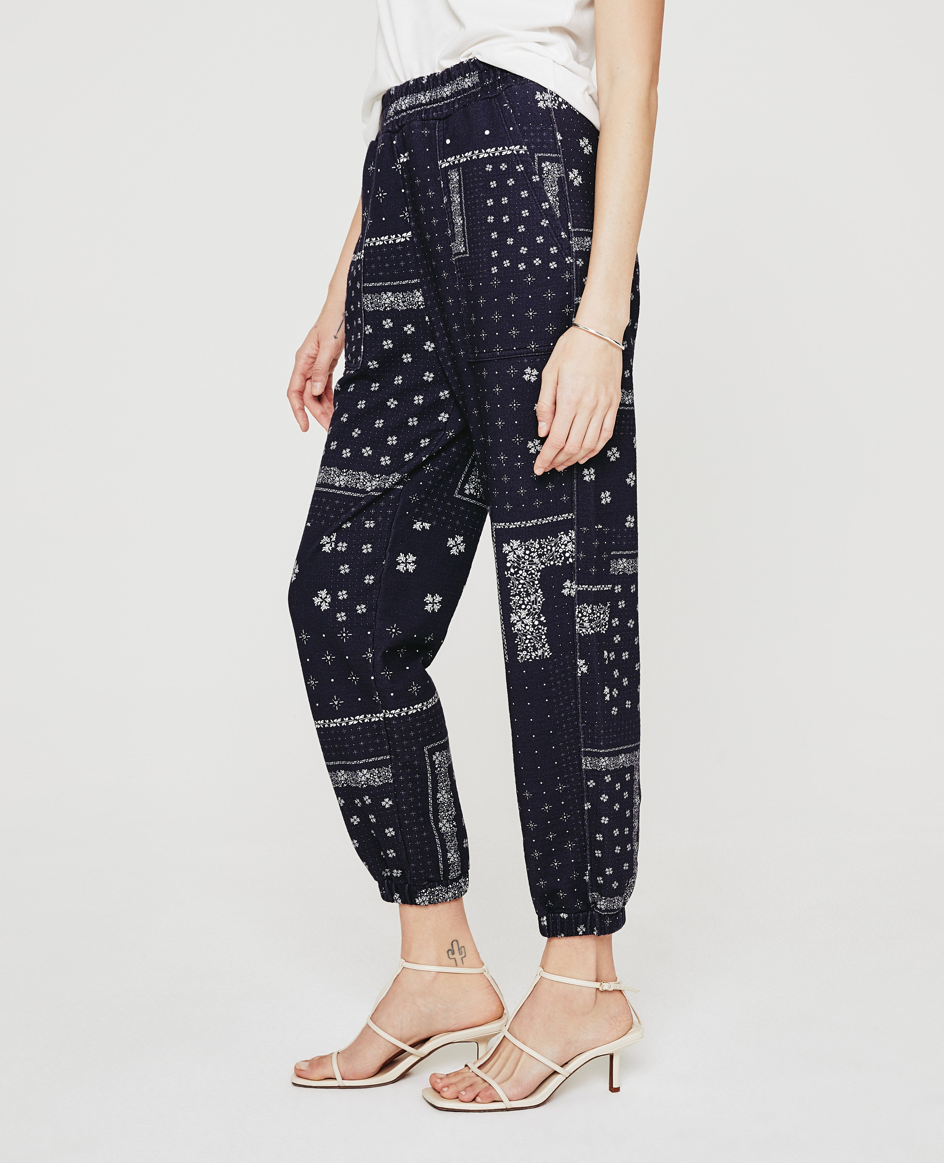 The Nova Sweatpant for women features a slouchy silhouette in a navy bandana print. The Nova offers a ruched elastic waist, deep pork chop pockets, and a tapered leg with elastic hems. This sweatpant for women is designed in Cotton Slub Loopback Terry featuring a lightweight feel, ultra-soft touch, and a color-rich finish.