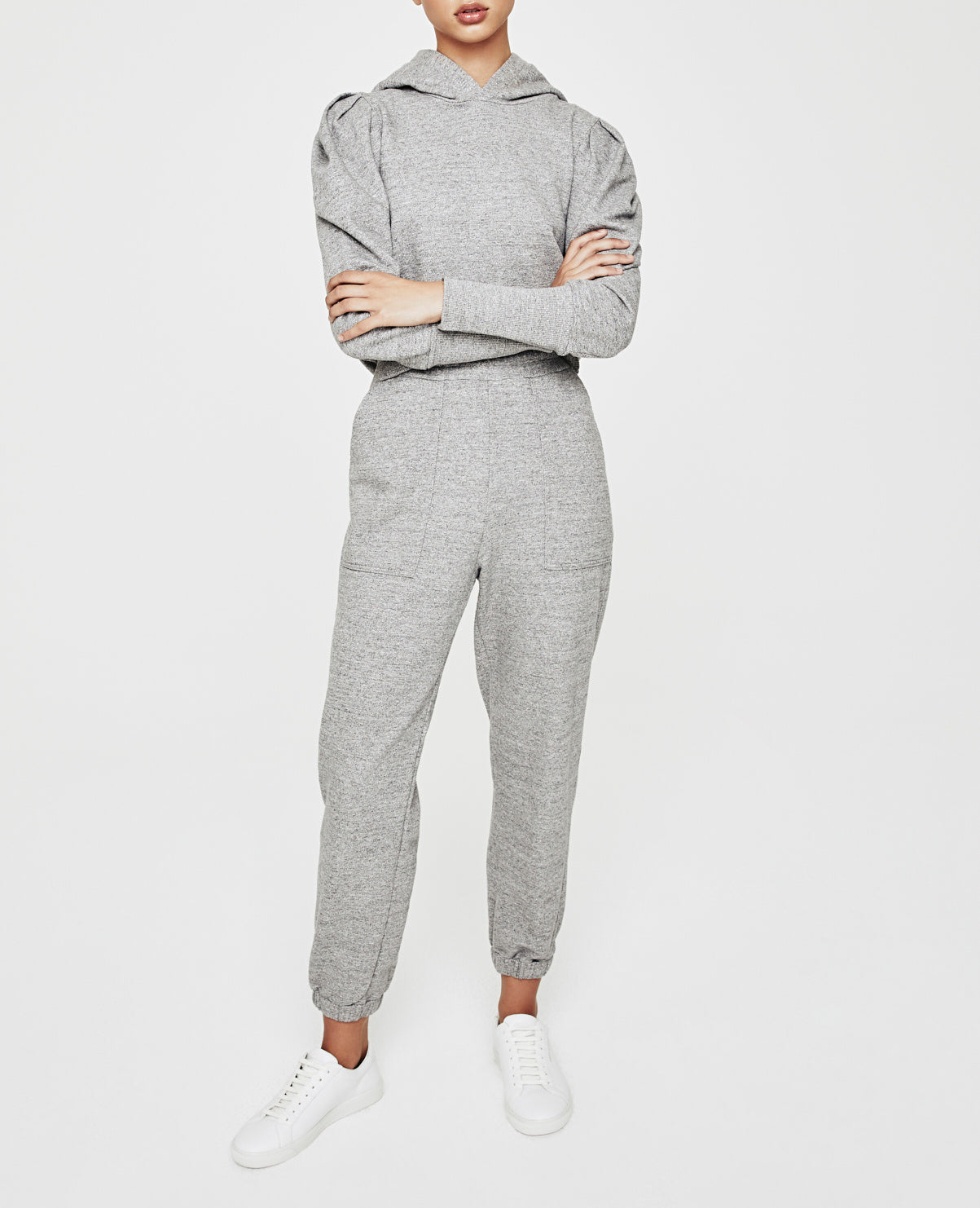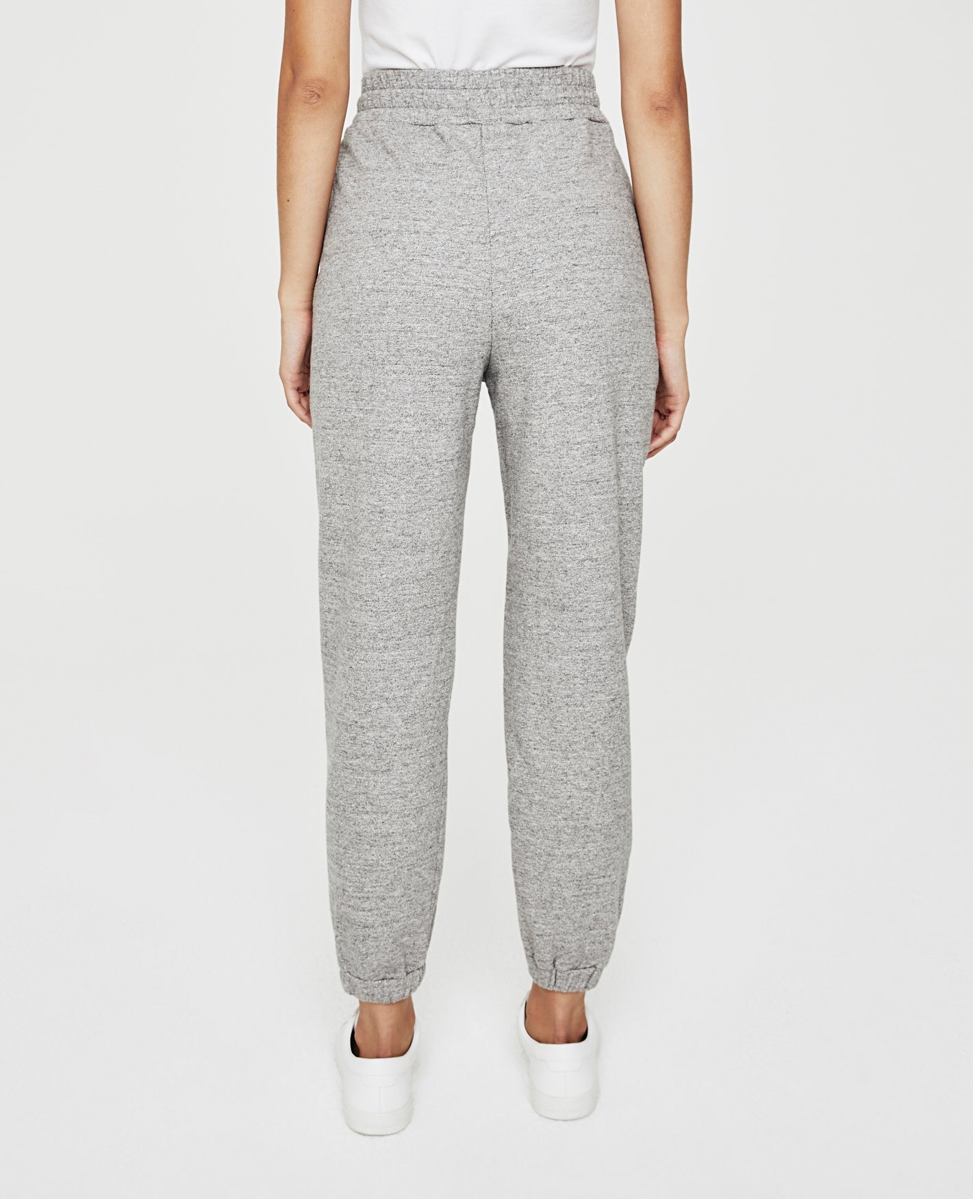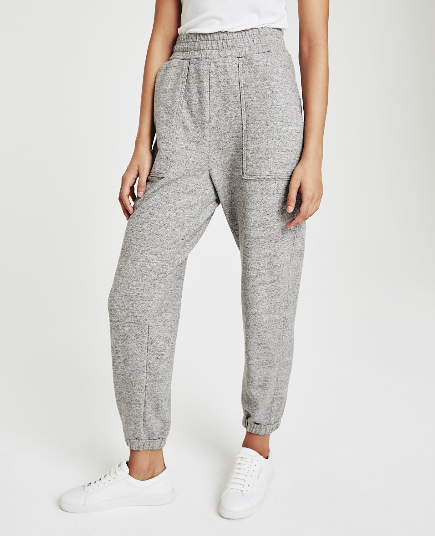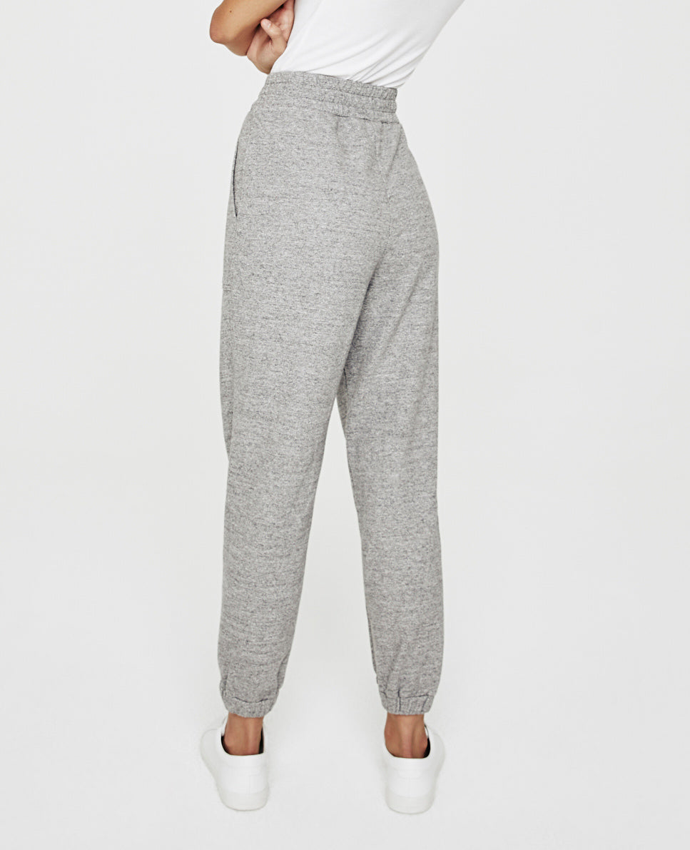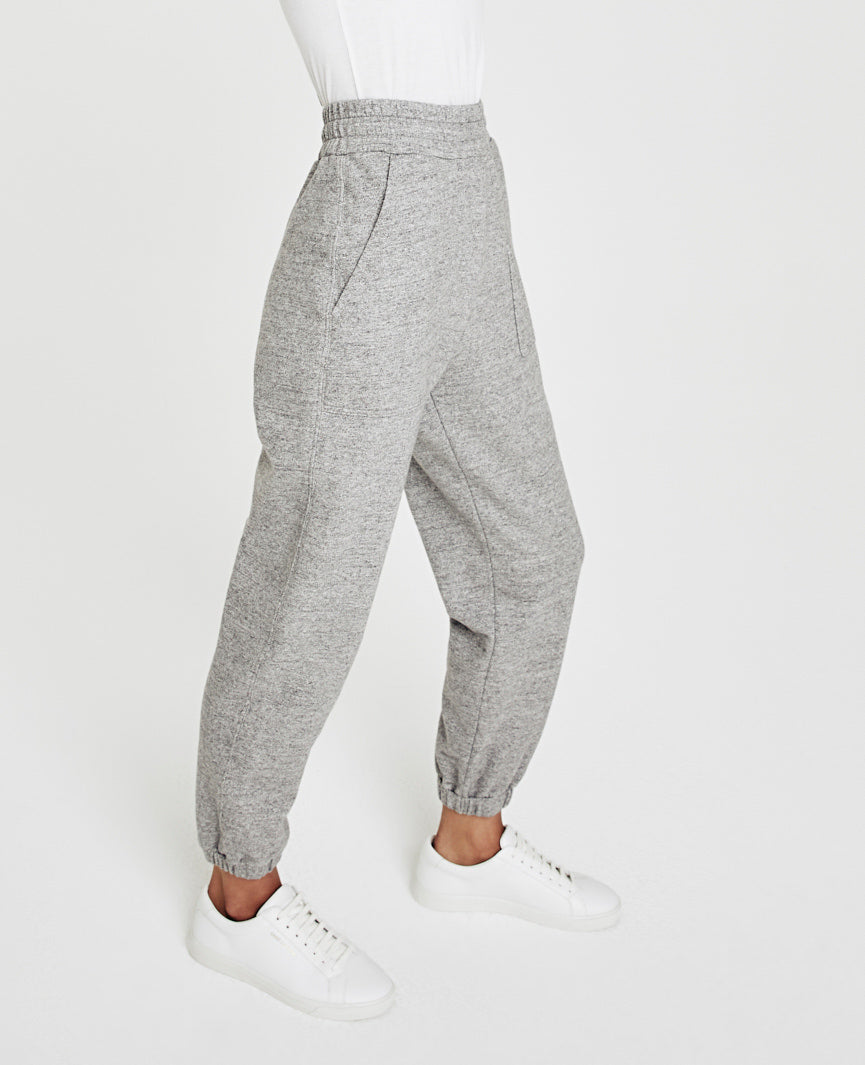 The Nova Sweatpant for women features a heather grey hue and is cut in a slouchy silhouette for ultimate comfort. The Nova offers a ruched elastic waist, deep pork chop pockets, and a tapered leg with elastic hems. This sweatpant for women is designed in 9 oz. Soft Heather Terry for a lightweight feel and ultra soft touch.