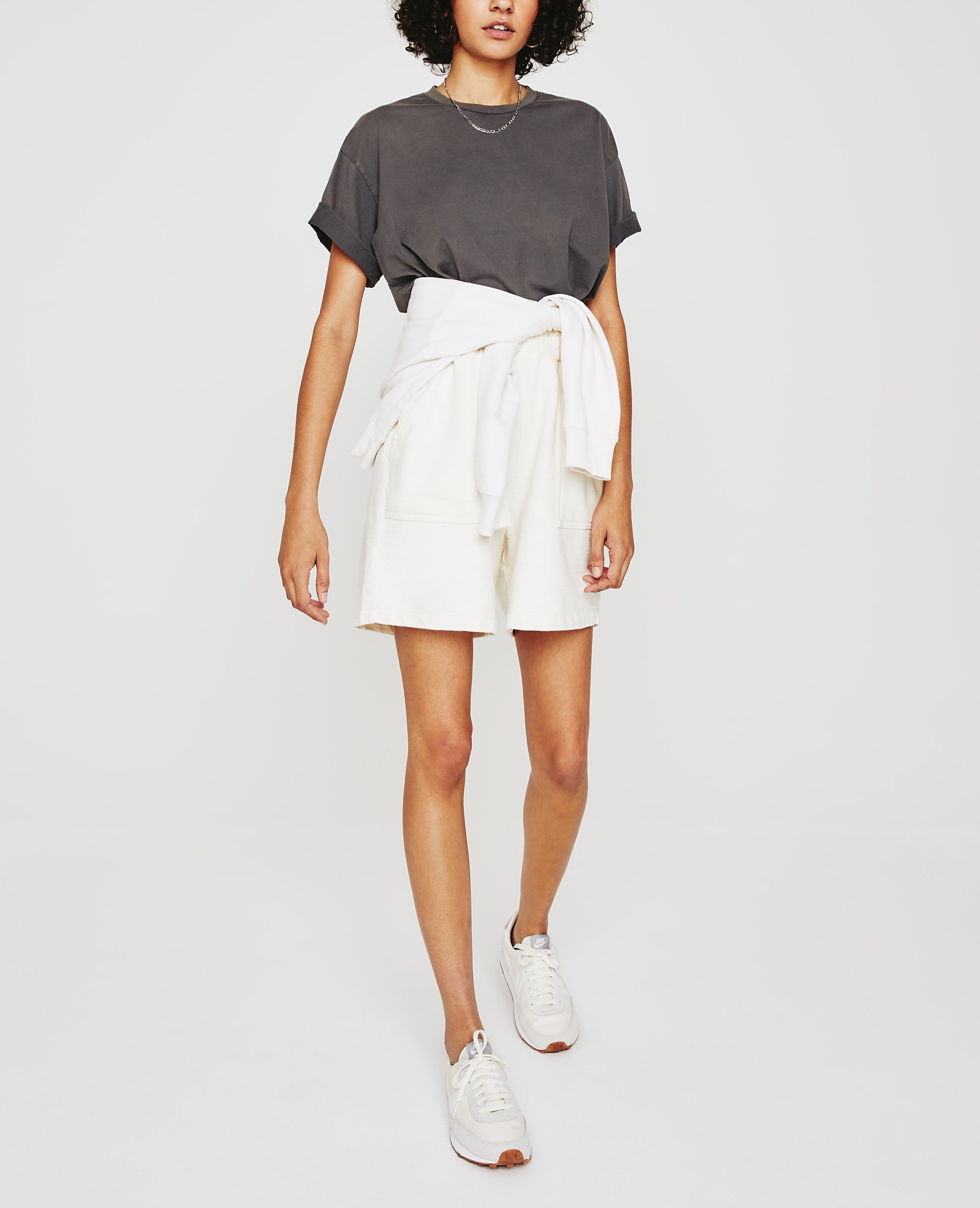 The Nova Sweatshort for women has a ruched elastic waistband and a loose, relaxed shape through the legs. Deep pork chop pockets adorn the front. Offered here in an ivory shade, this women's short is designed in AG's exclusive Cotton Slub Loopback Terry, a 100% cotton fabric that's soft and lightweight.