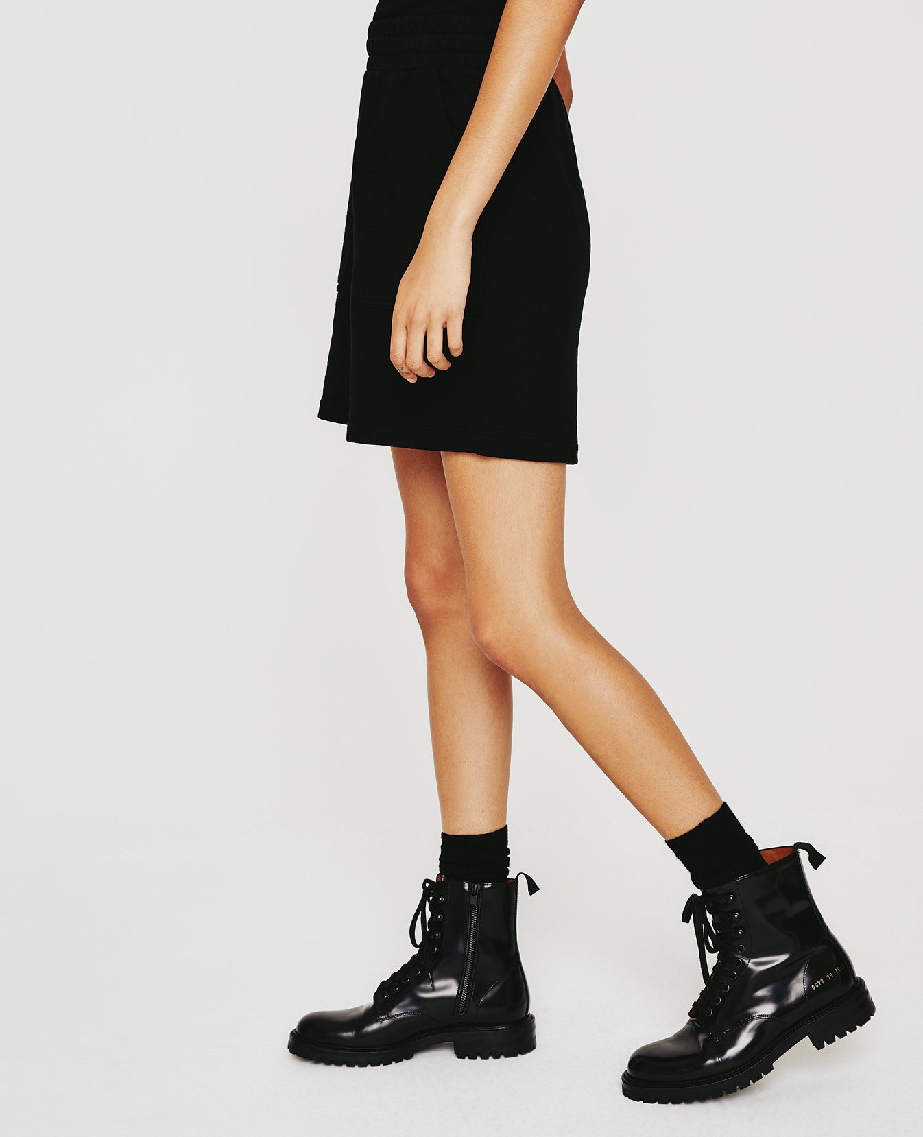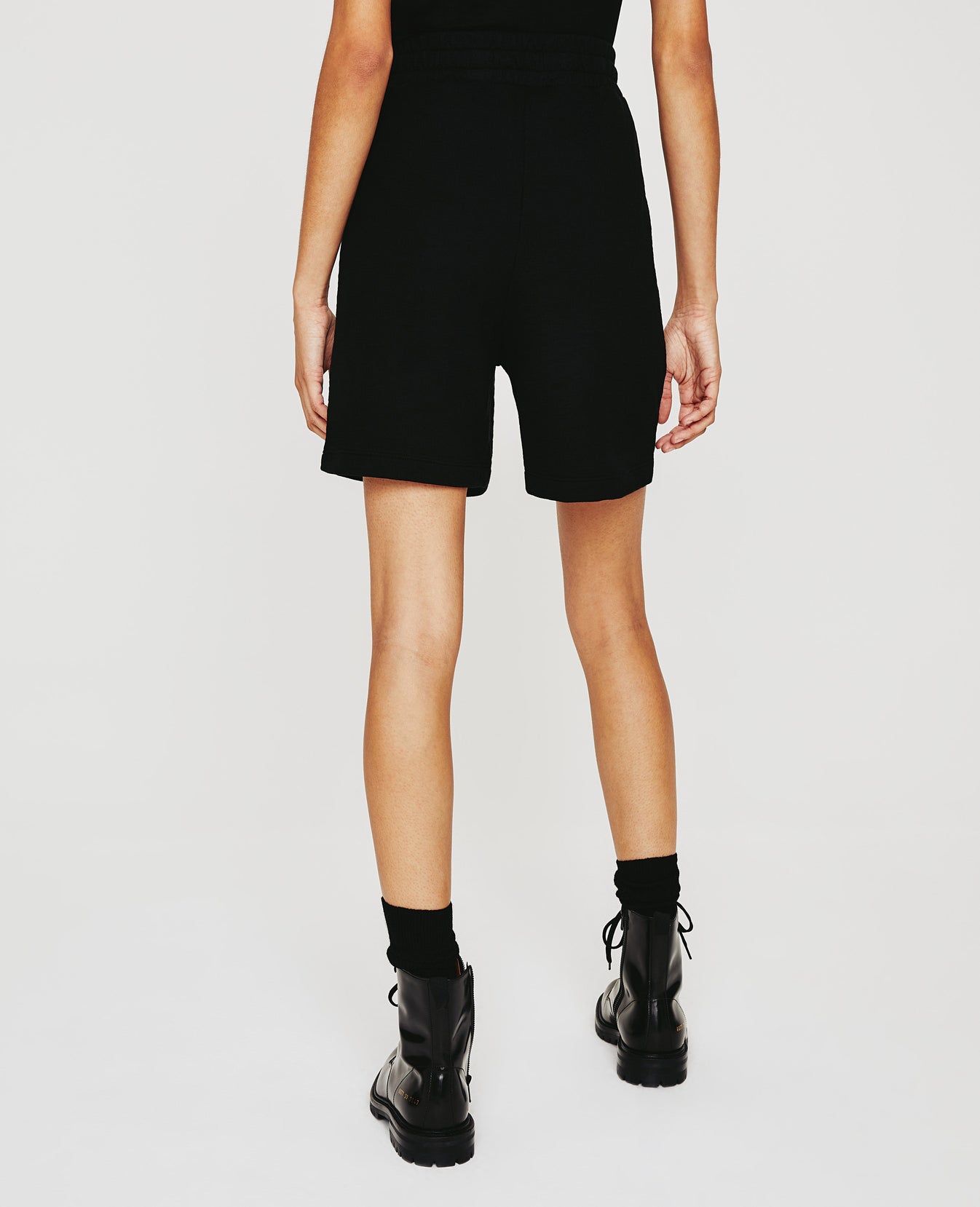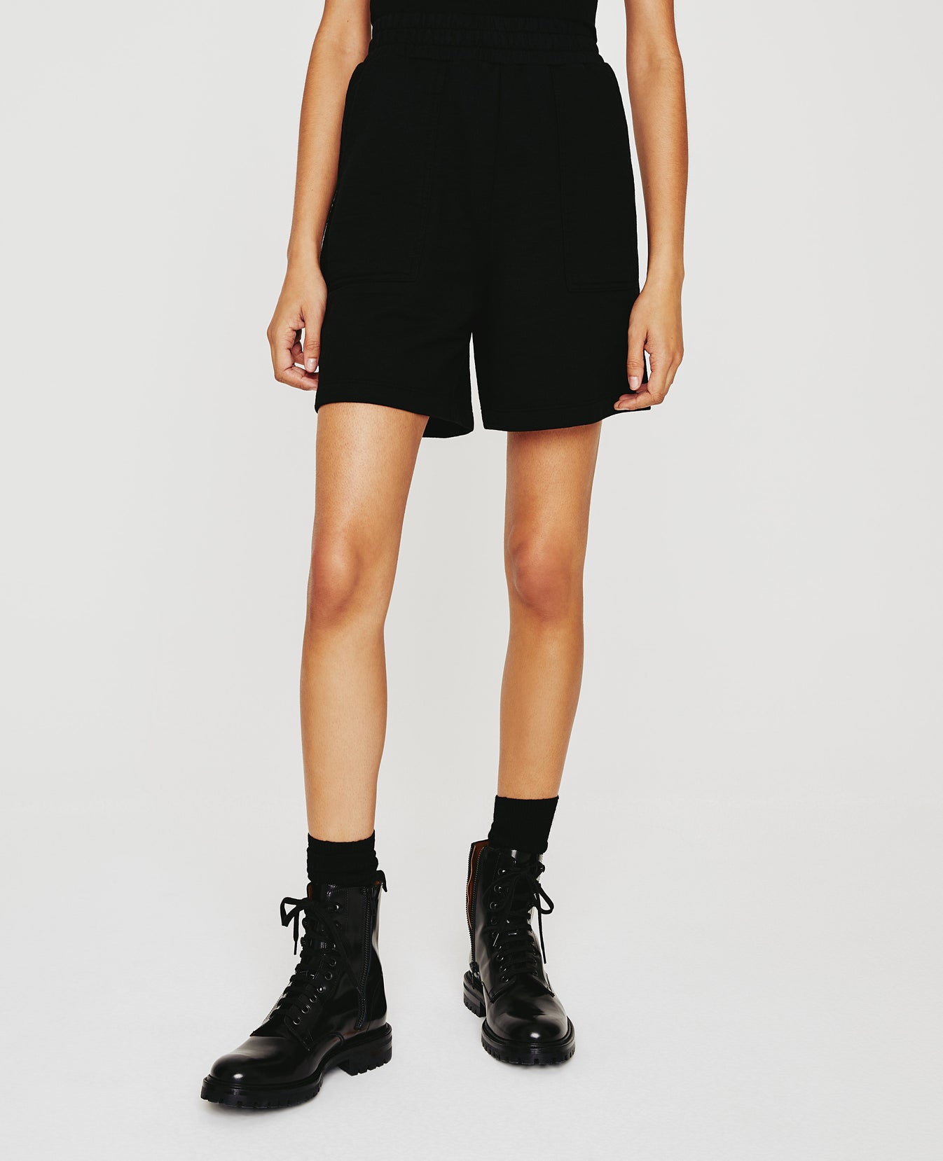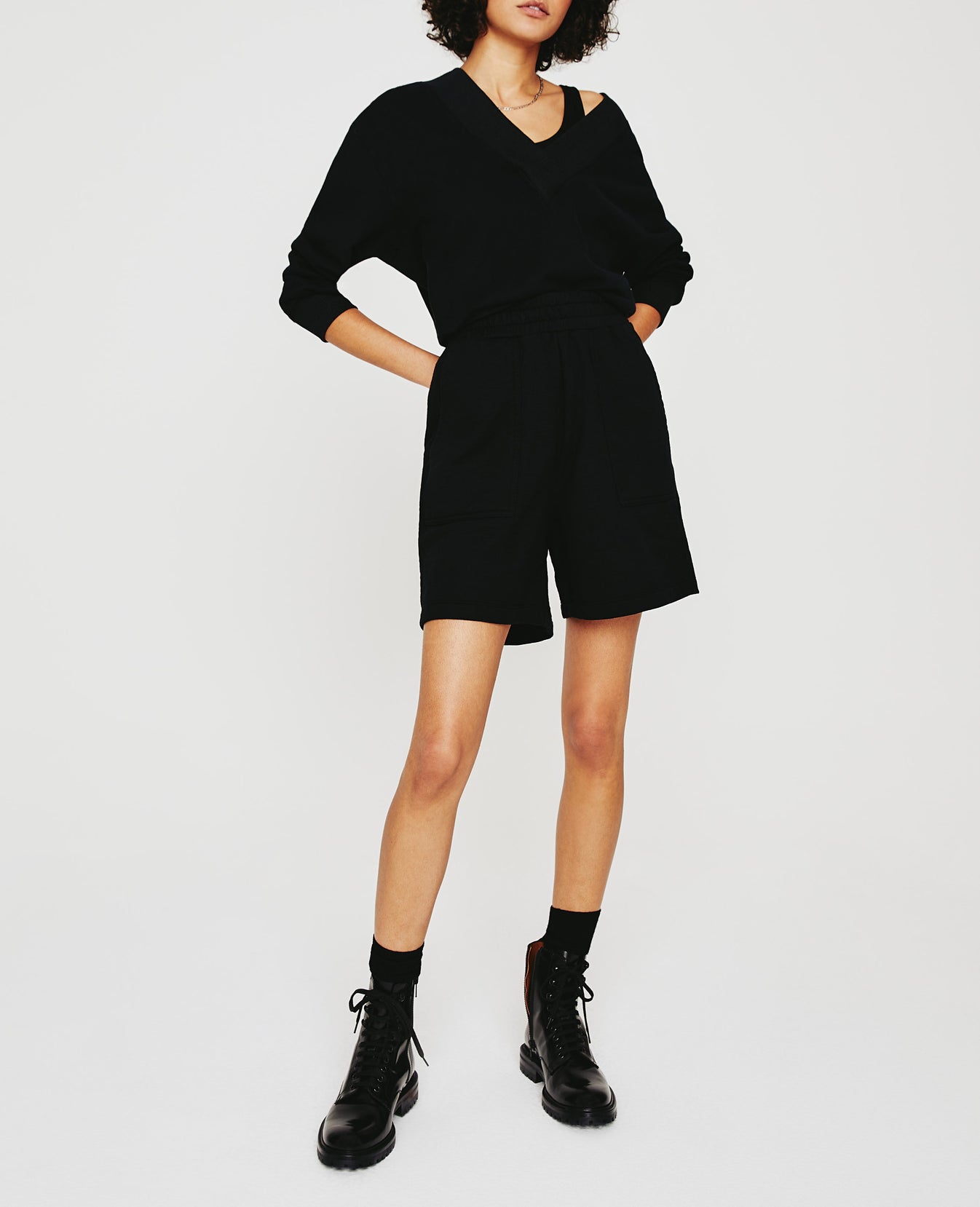 The Nova Sweatshort for women has a ruched elastic waistband and a loose, relaxed shape through the legs. Deep pork chop pockets adorn the front. Offered here in a classic black shade, this women's short is designed in AG's exclusive Cotton Slub Loopback Terry, a 100% cotton fabric that's soft and lightweight.