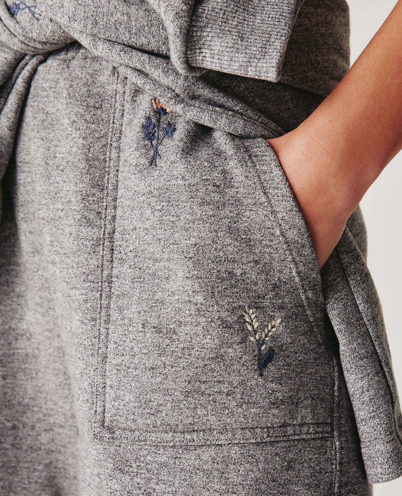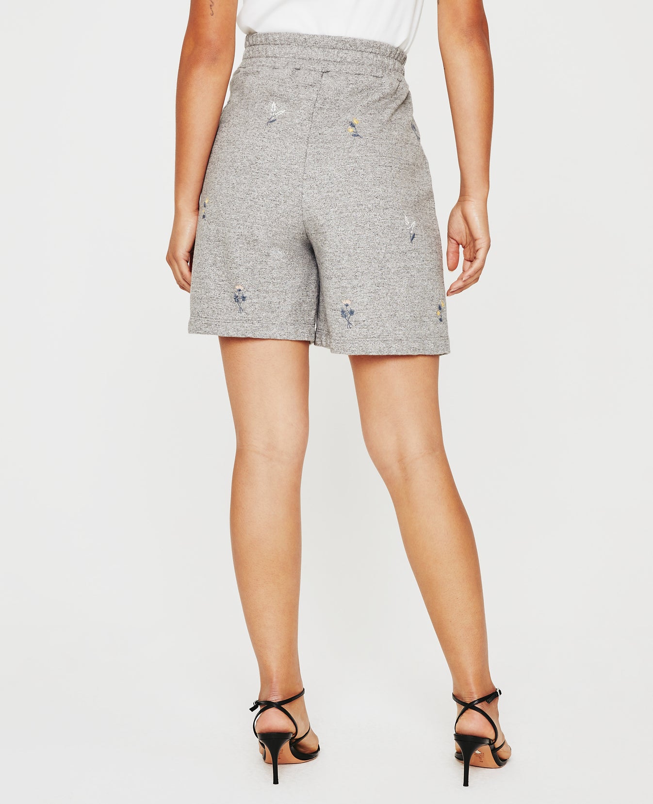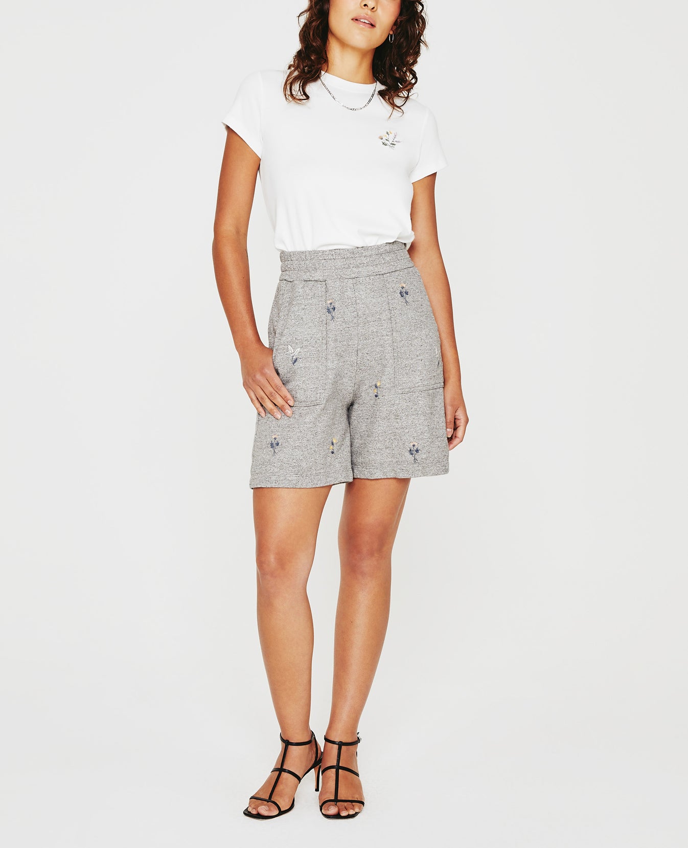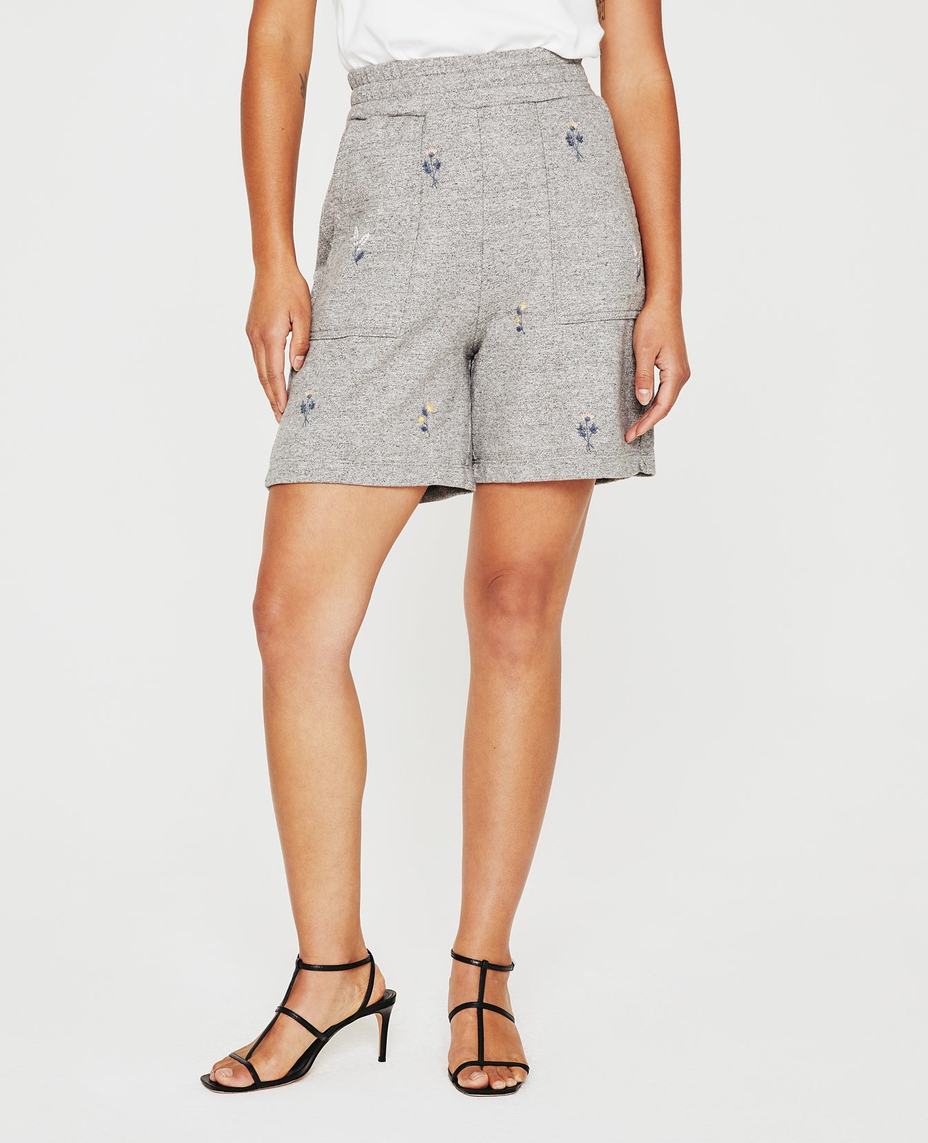 The Nova Sweatshort is back, updated in heather grey cotton terry with little embroidered flowers. This women's pull-on short has a ruched elastic waistband and a relaxed shape through the legs. Deep pork chop pockets detail the front. It's a soft, comfortable style that's perfect for casual days, especially when paired with our matching Orsen Sweatshirt.