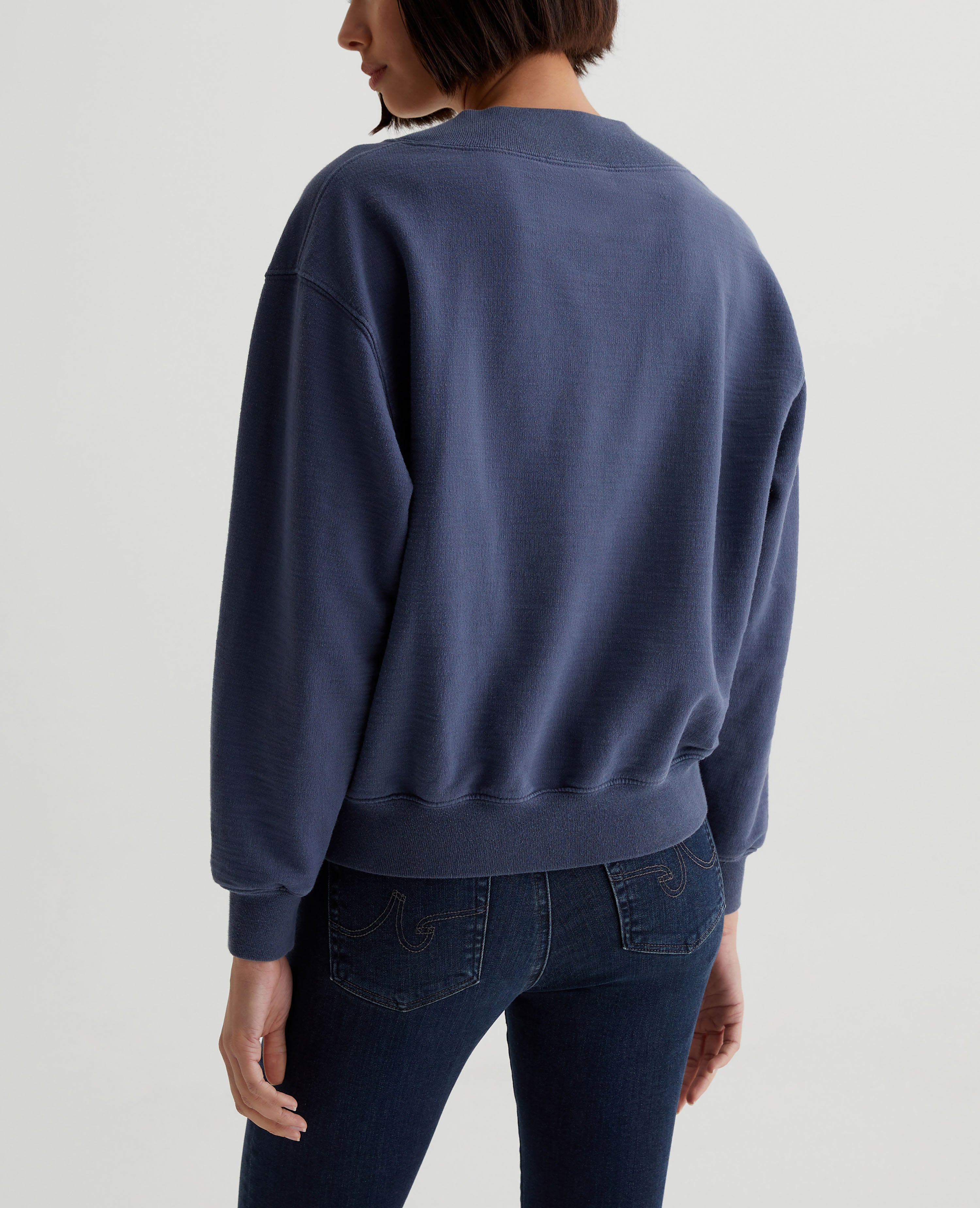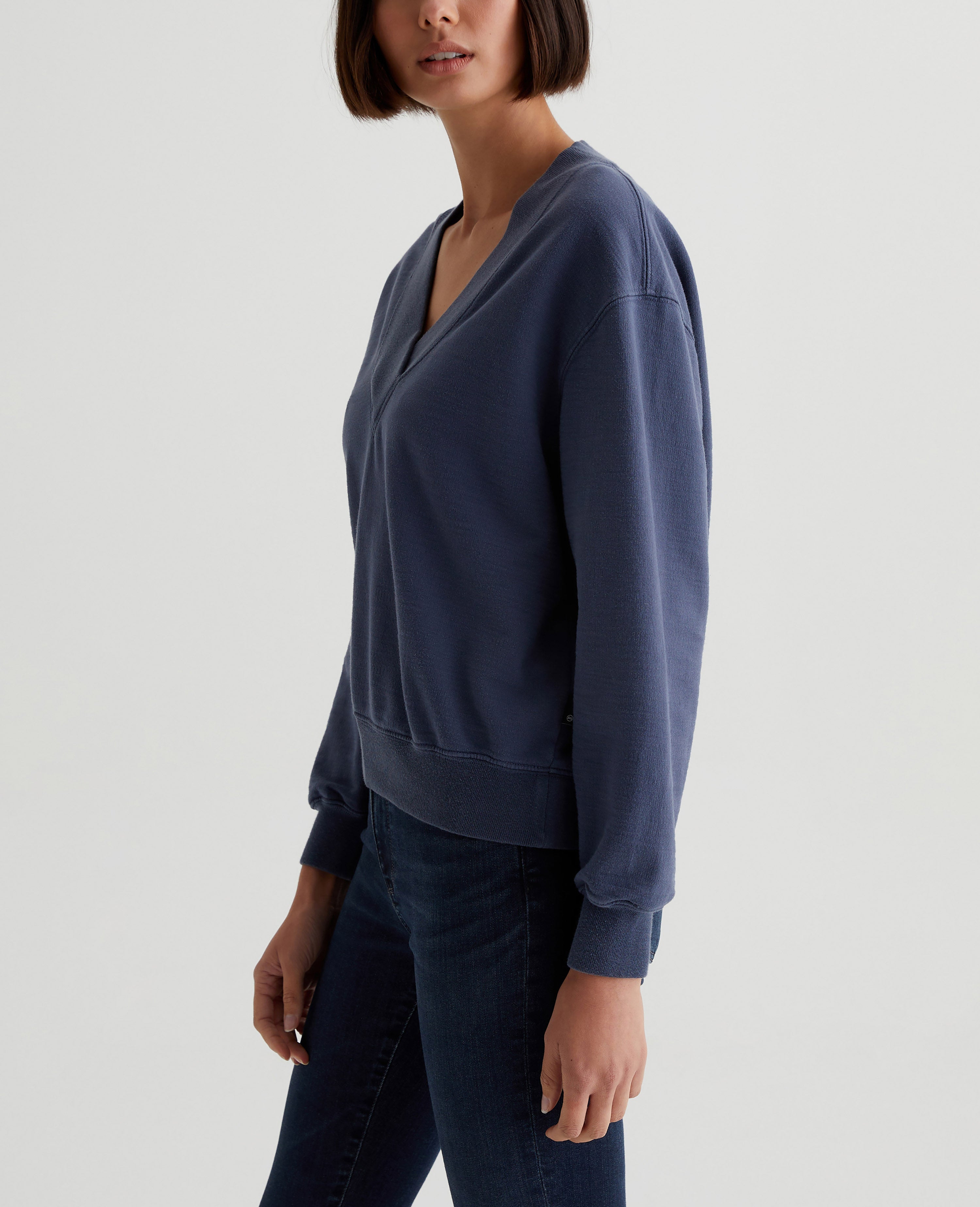 Our Nova Vee is a relaxed, slightly boxy sweatshirt defined by an overlapped V-neckline and wide rib trim. This women's long-sleeve pullover comes in a classic dark blue shade and features AG's exclusive Cotton Slub Loopback Terry, a lightweight slub fabric with an ultra-soft feel. It's knitted with our special S&Z twist technique that prevents torquing and keeps the shape on point.