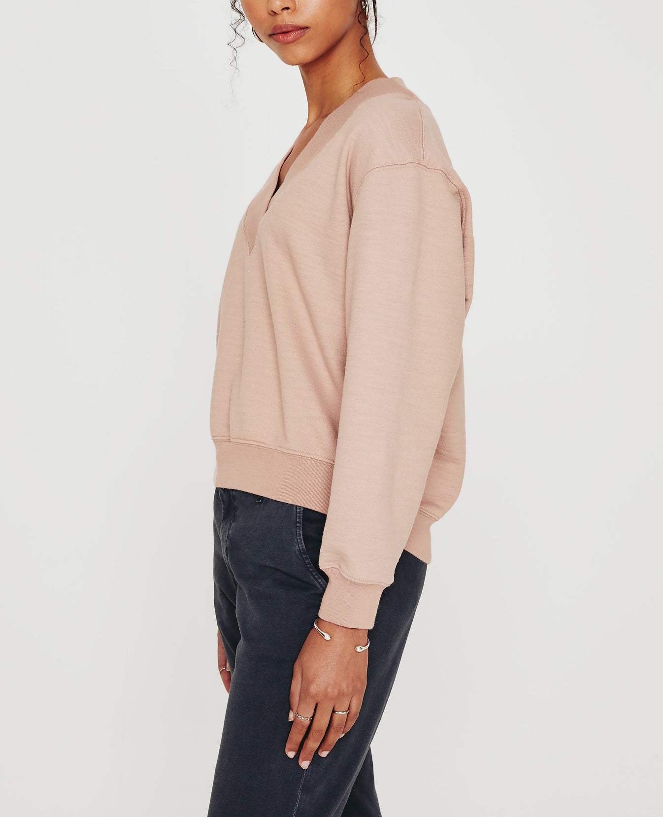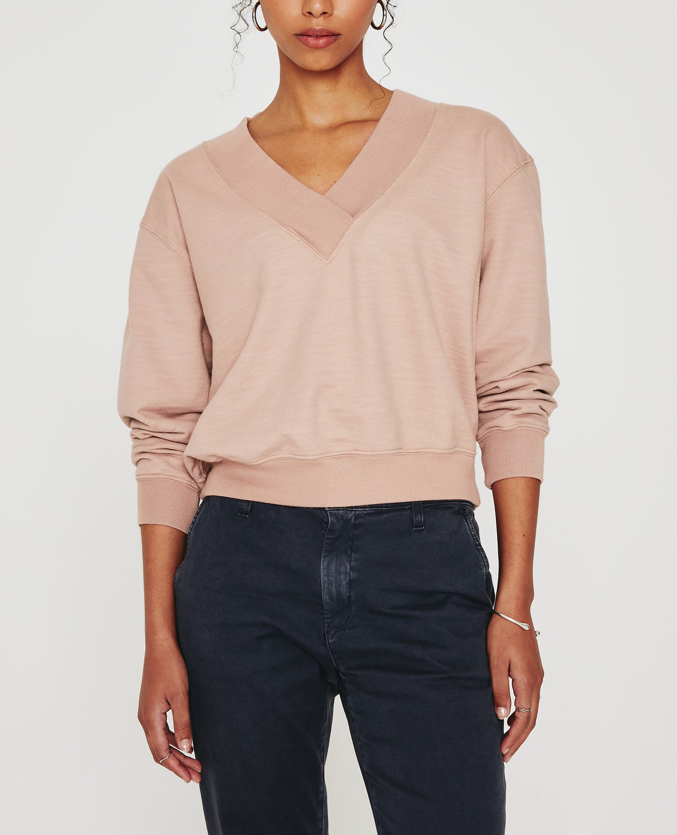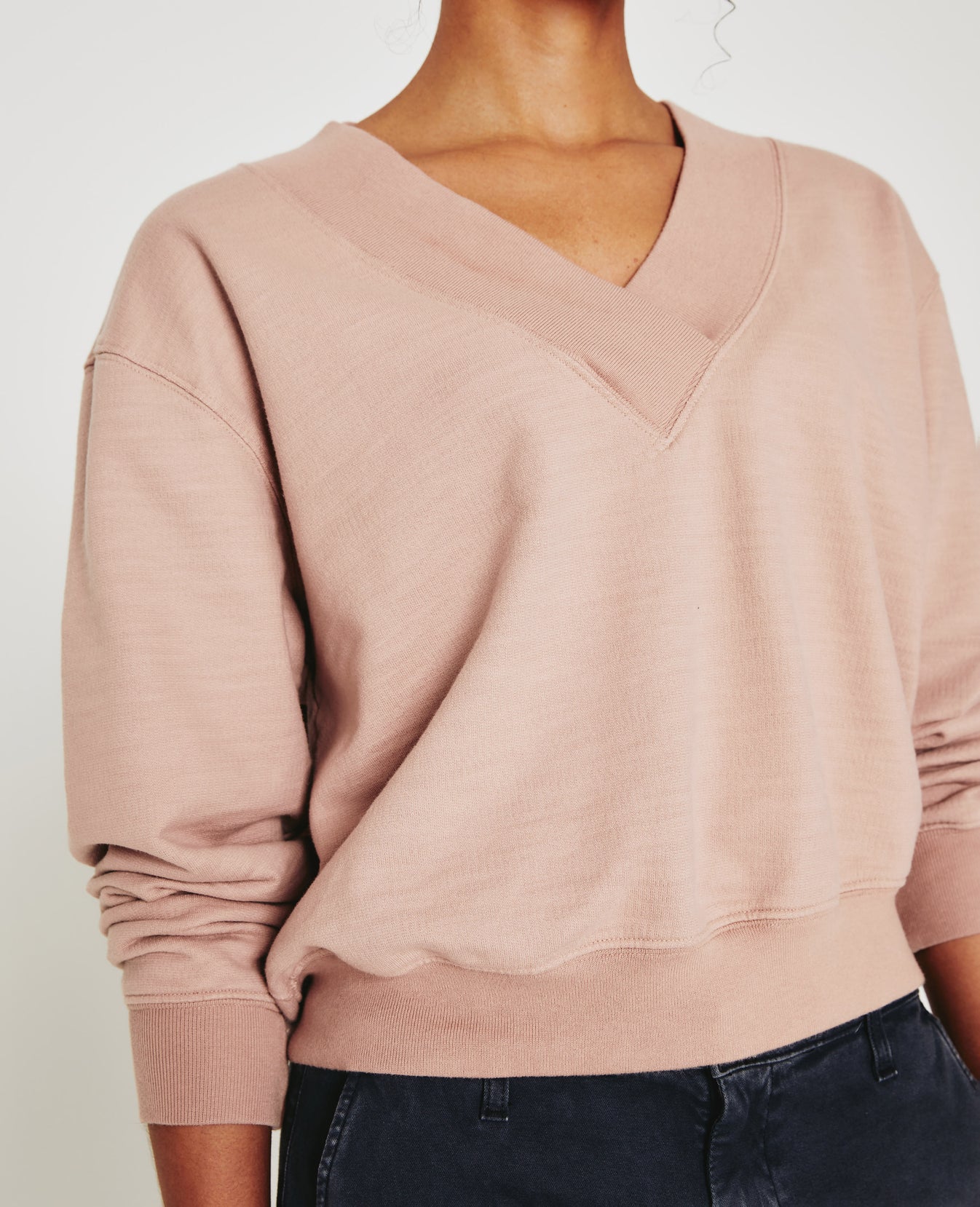 The Nova Vee is a relaxed, slightly boxy sweatshirt defined by an overlapped V-neckline and wide rib trim. This casual staple comes in a muted pink shade and features AG's exclusive Cotton Slub Loopback Terry, a lightweight slub fabric with an ultra-soft feel. It's knitted with our special S&Z twist technique that prevents torquing and keeps the shape on point.