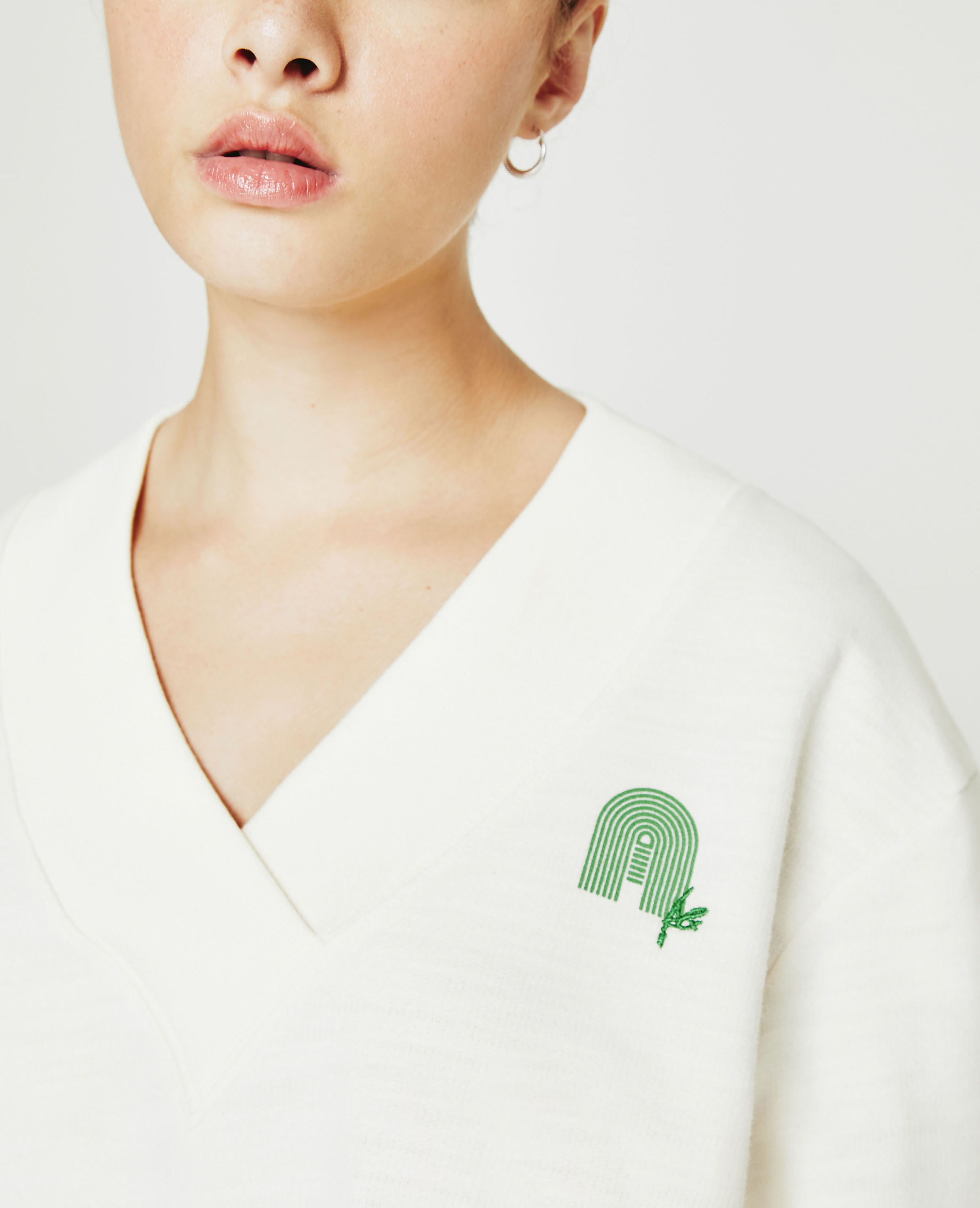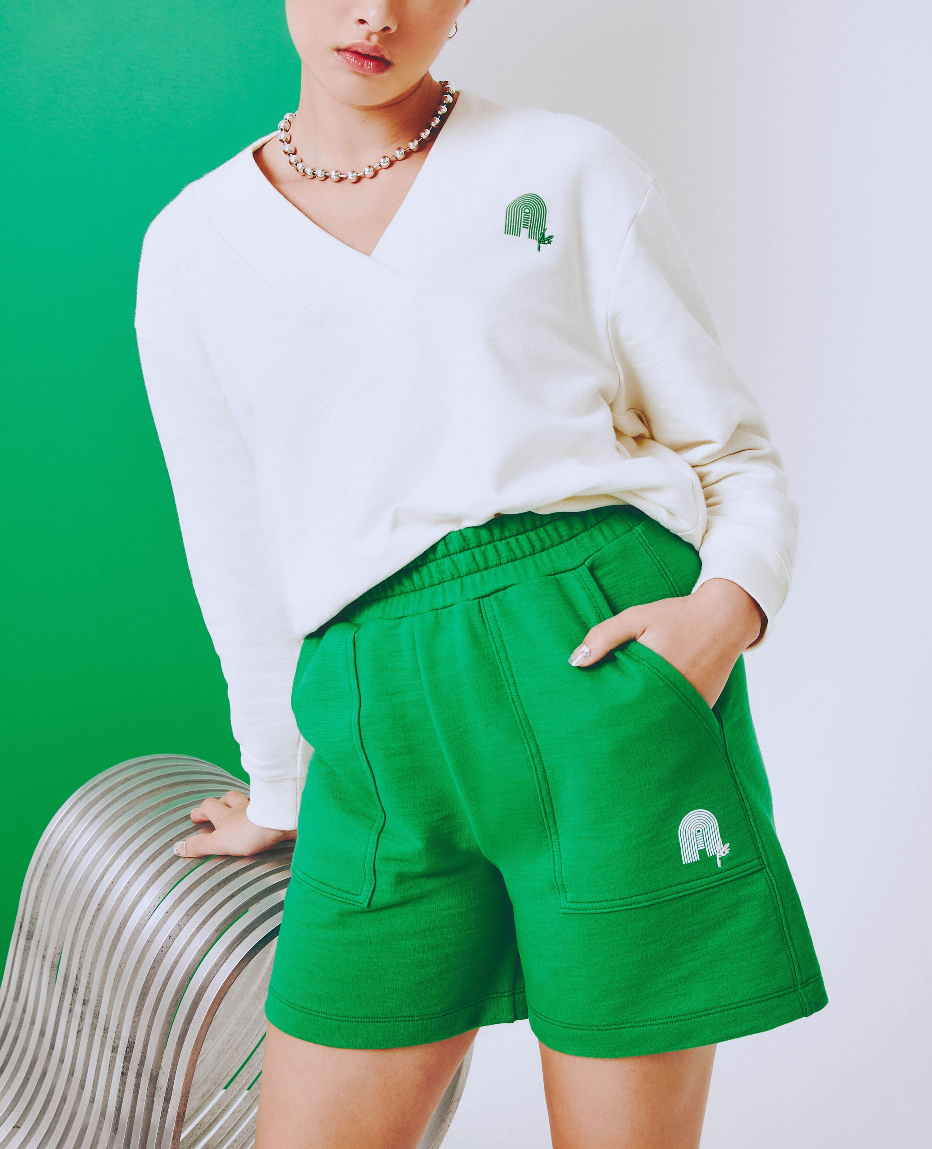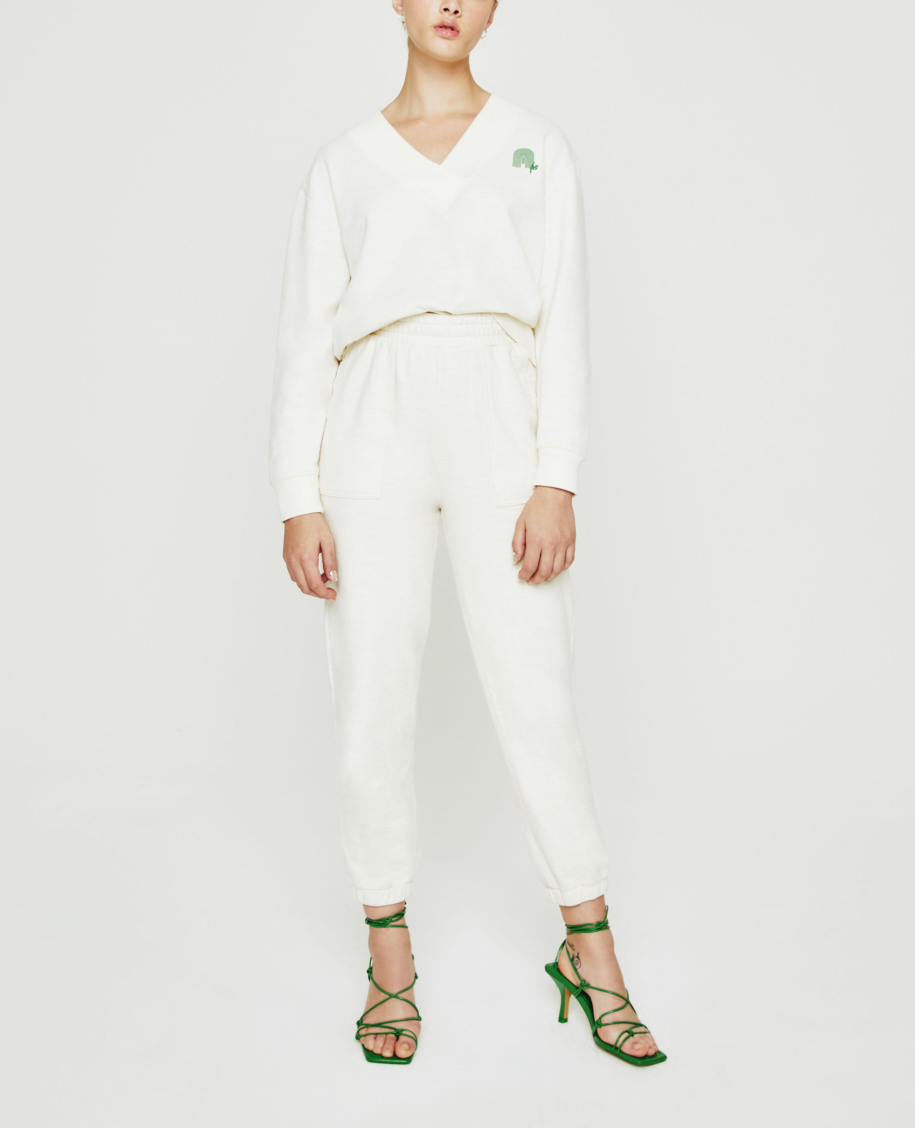 The Nova Vee from our AGreen Assortment is updated for the season in an ivory shade and printed with a green "A" graphic at the chest. A relaxed sweatshirt with a V neck and long sleeves, the style comes in AG's exclusive Cotton Slub Loop Back Terry, a lightweight slub fabric with an ultra-soft feel. It's knitted with our special S&Z twist technique to prevent torquing and keep the shape on point.