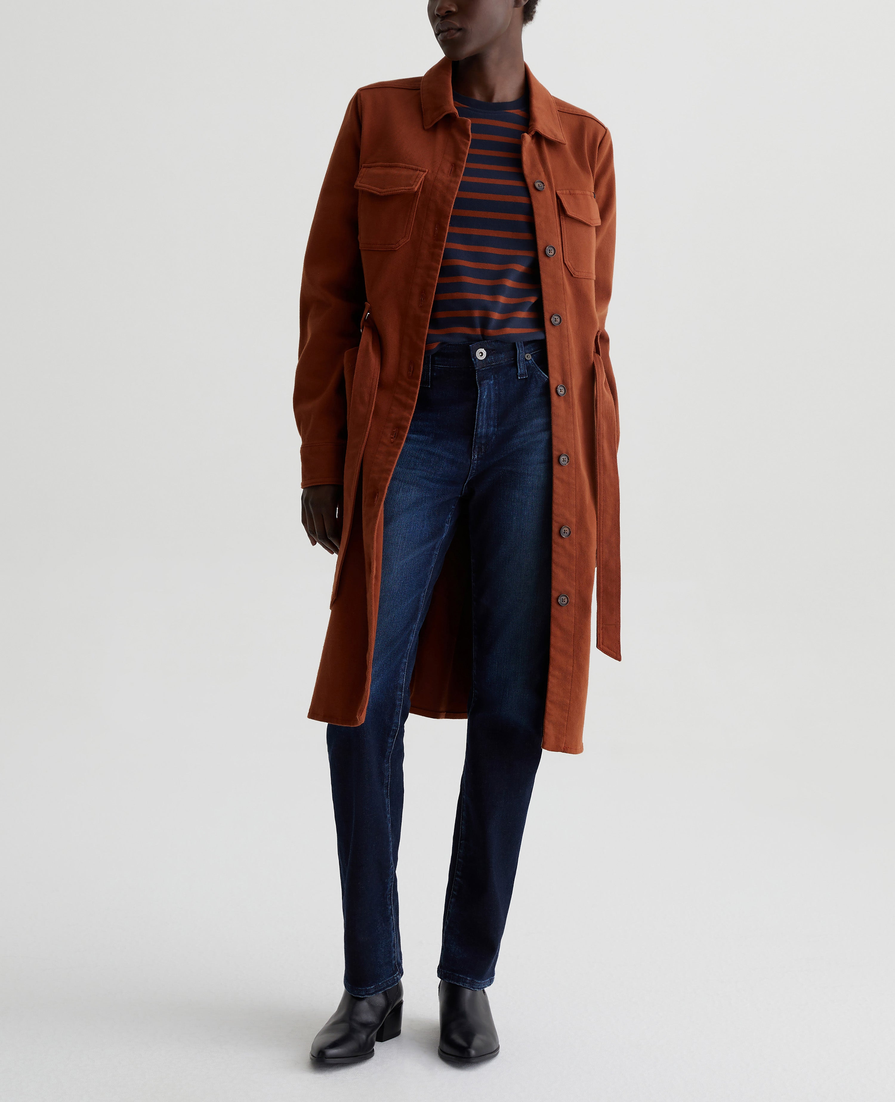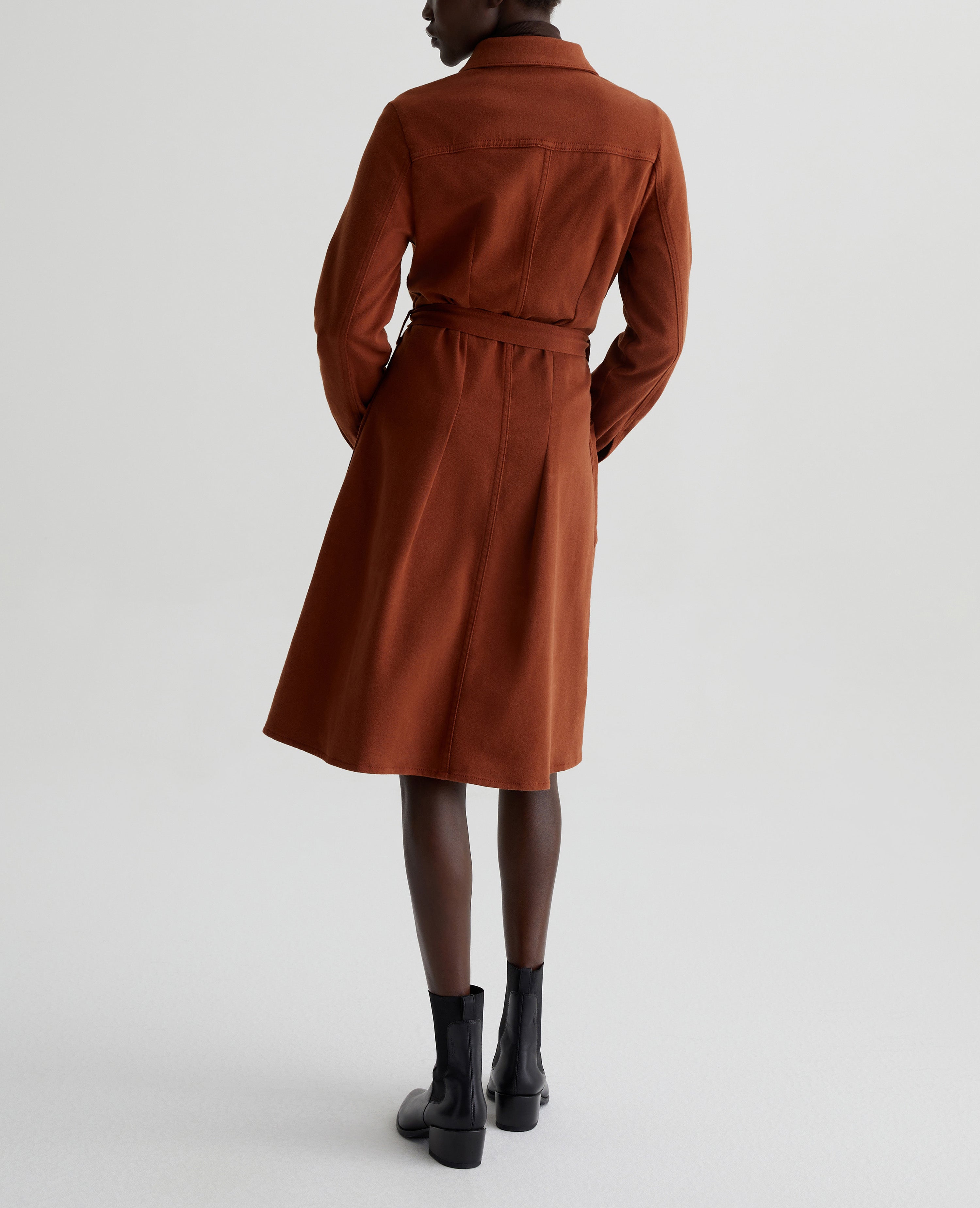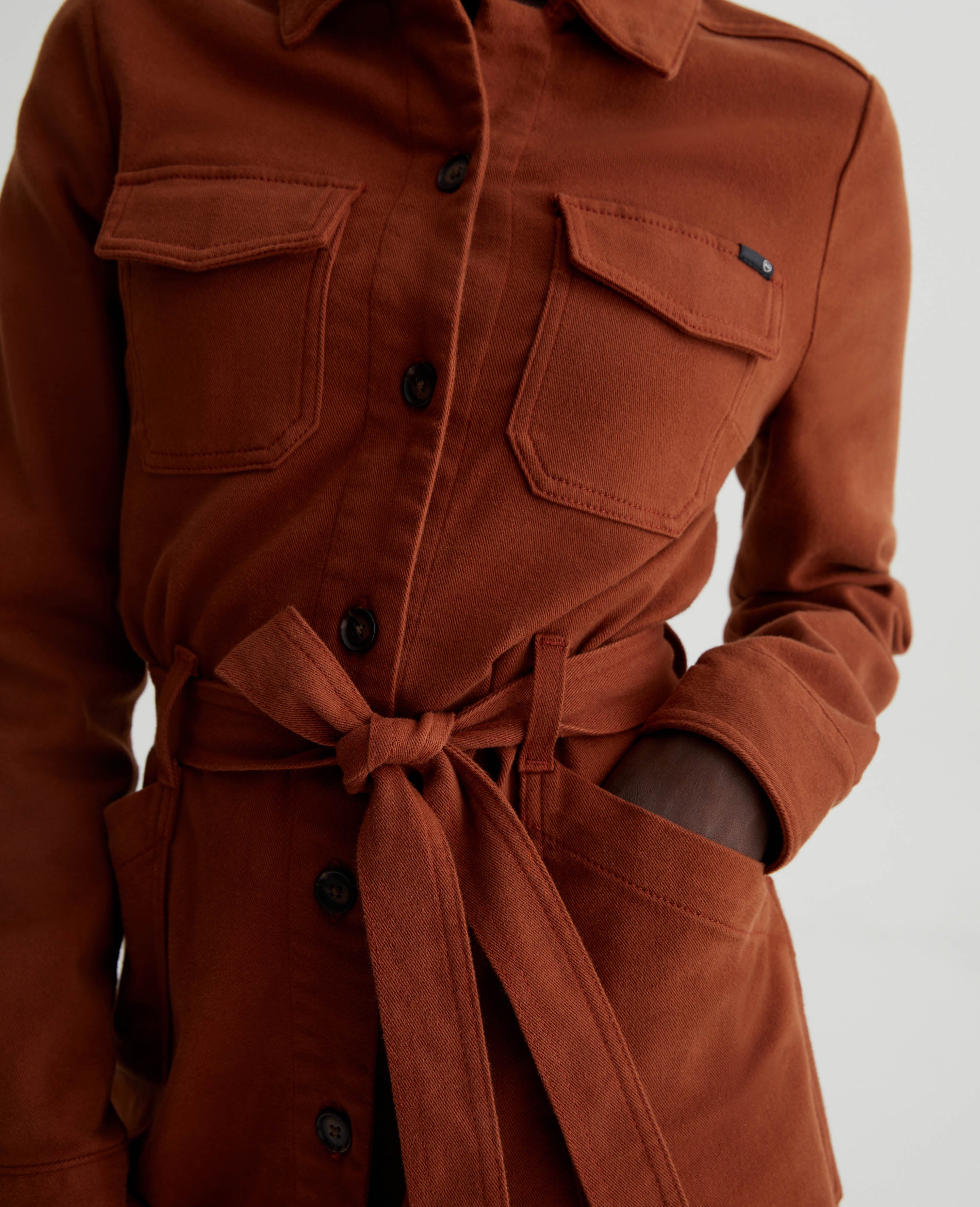 The Novi Safari Jacket is the perfect cross between a trench and a dress in 8.7 oz. Hyper Soft Bull Denim. It's got a knee-grazing A-line silhouette with long sleeves, utility pockets, and buttons at the front, plus an optional self-tie belt to cinch the waist. Our exclusive AG Cloud Soft Denim™ fabric is a special left-hand twill that allows the yarns to gently relax and untwist for a supple, velvety-soft feel. It's designed to get even softer as you wear it. Superstretch construction offers added comfort and shape recovery.