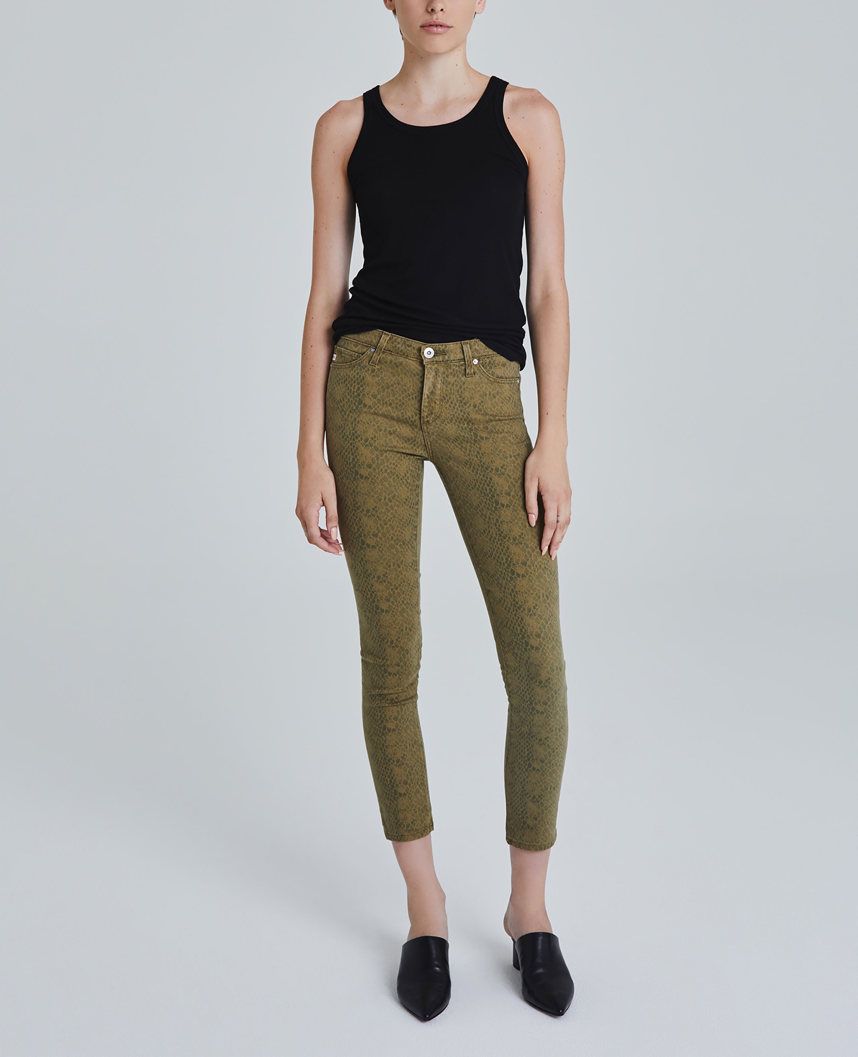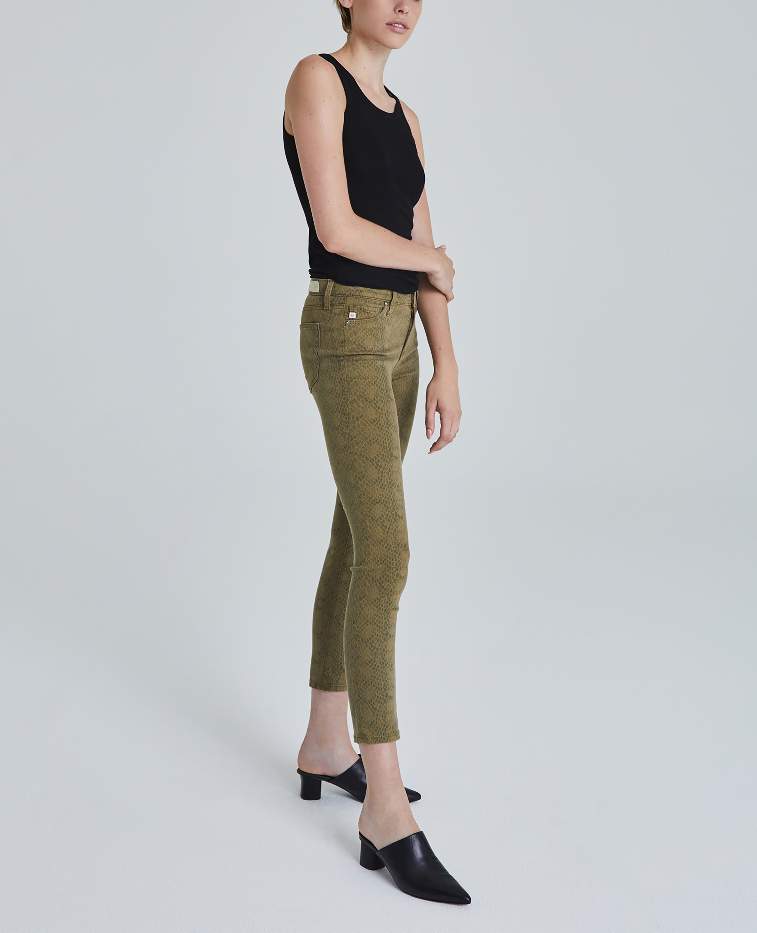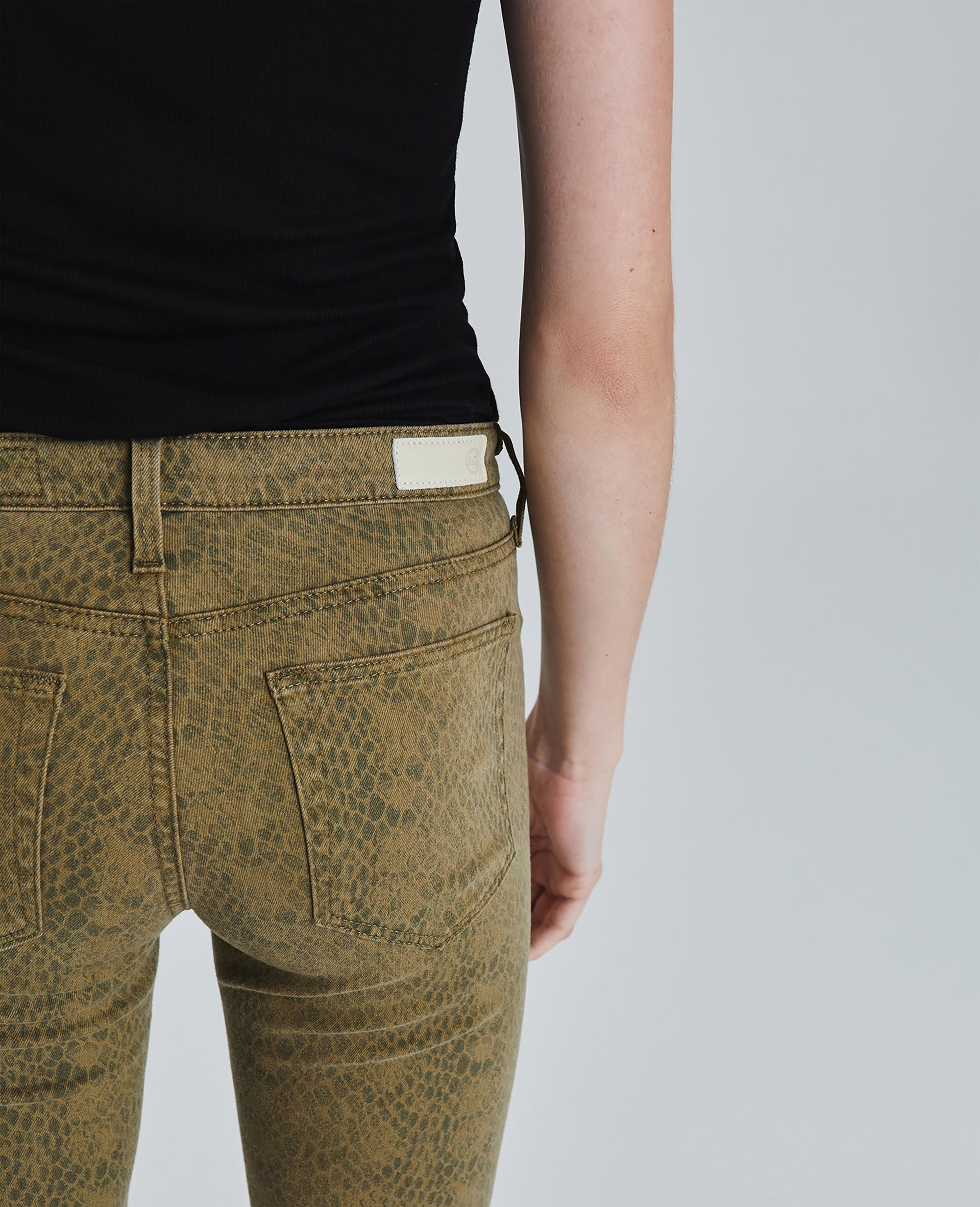 Prima Ankle Cigarette Jean for women features an olive ivory hue detailed in python snake print, fitted silhouette through hips, slight tapering at leg, and finished with a cropped length that hits just above ankle. This women’s jean is designed in a lightweight twill blend with added stretch for a luxurious feel and comfortable wear.